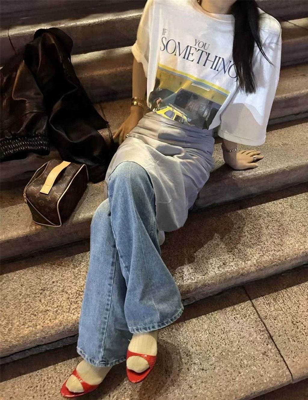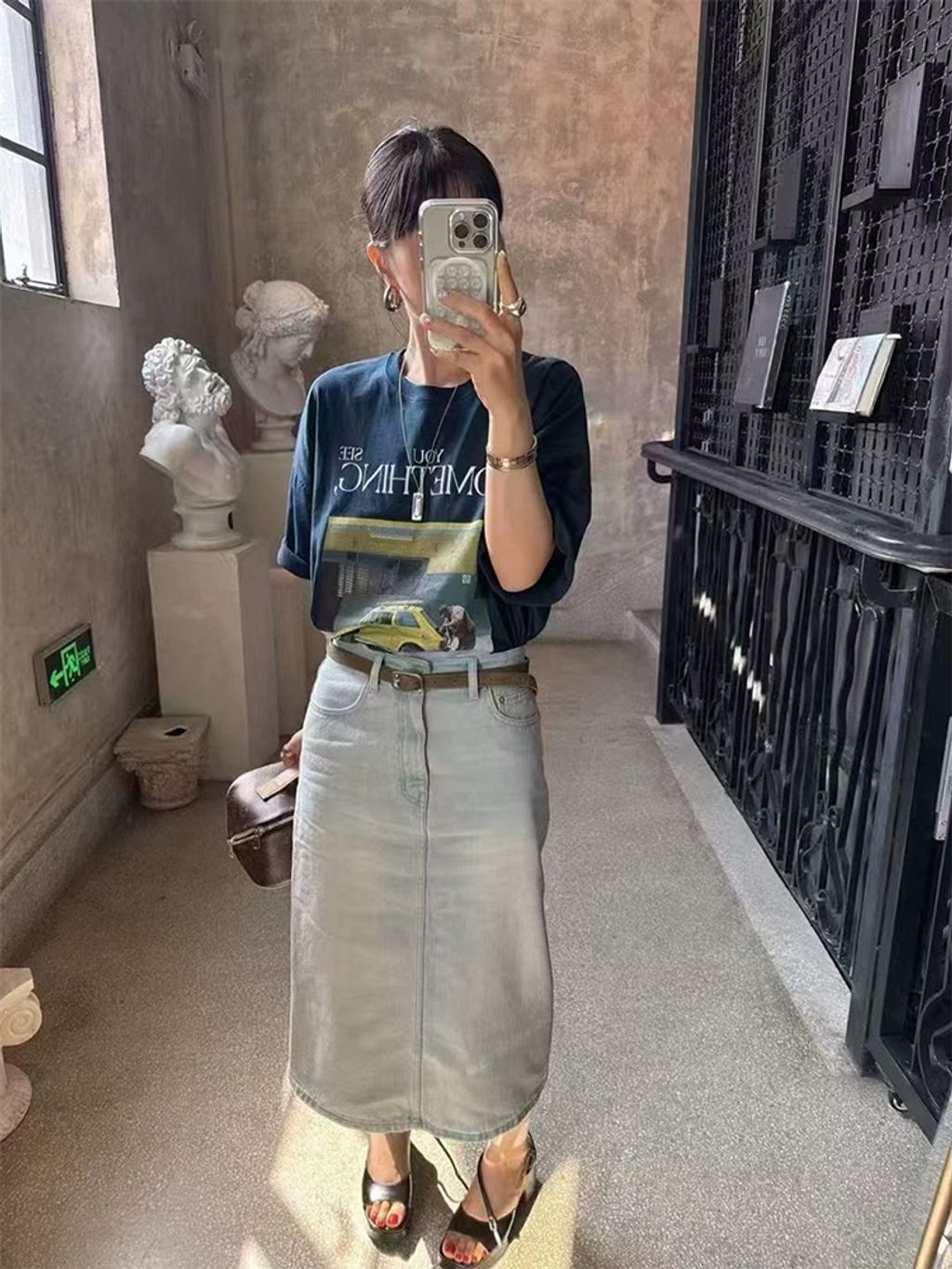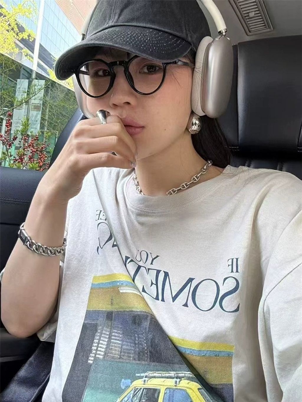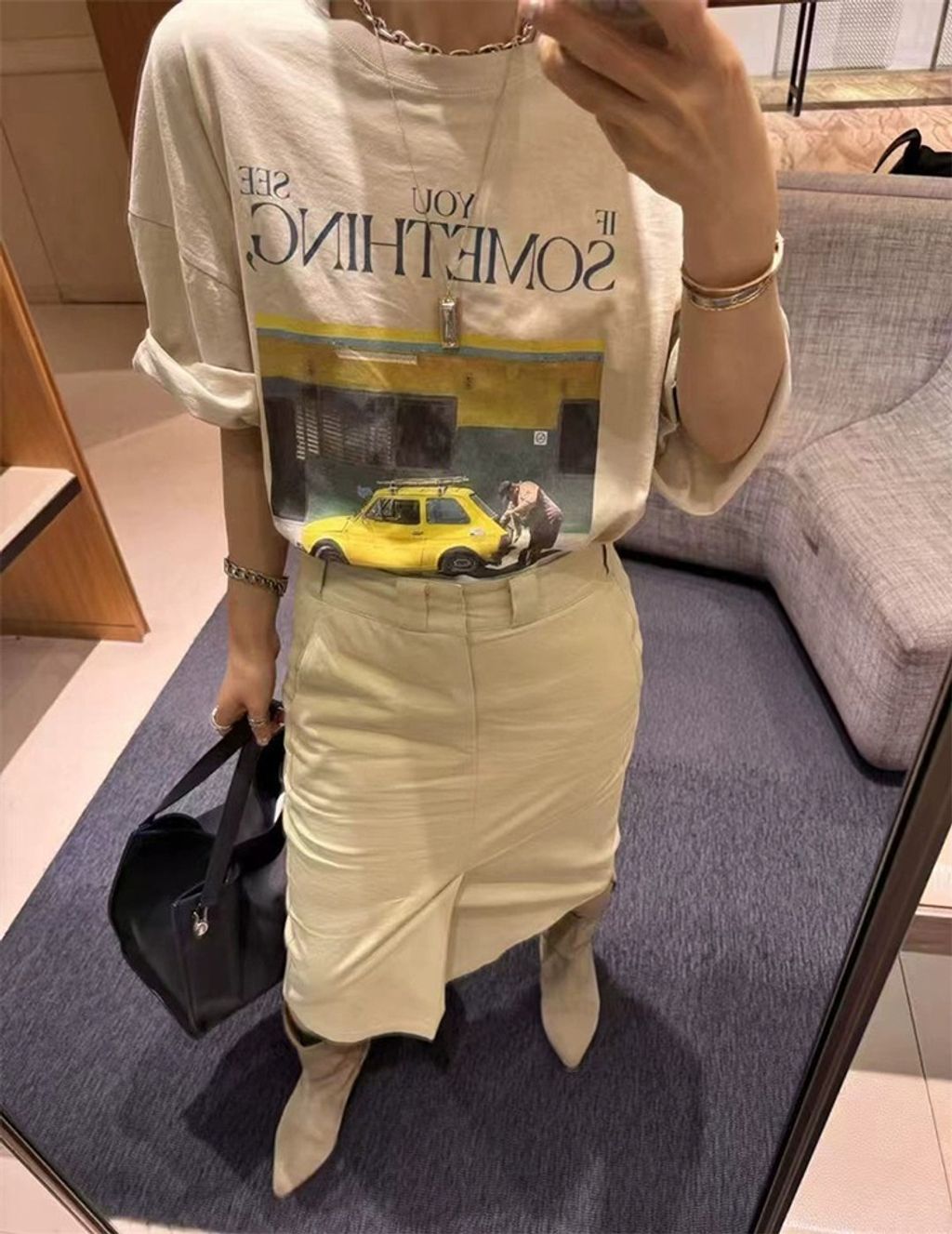 正韓 美式時尚圖樣寬鬆感短T*深藍杏白*【N0731-04】