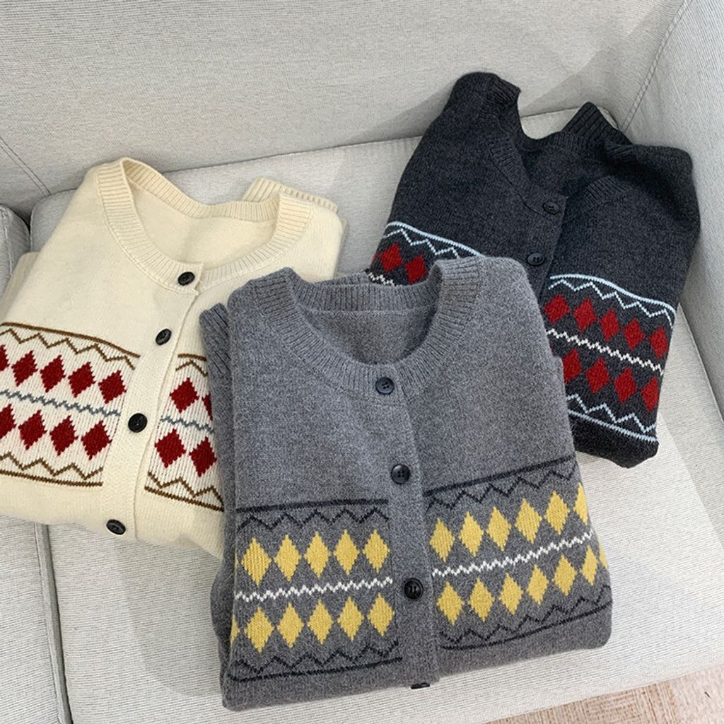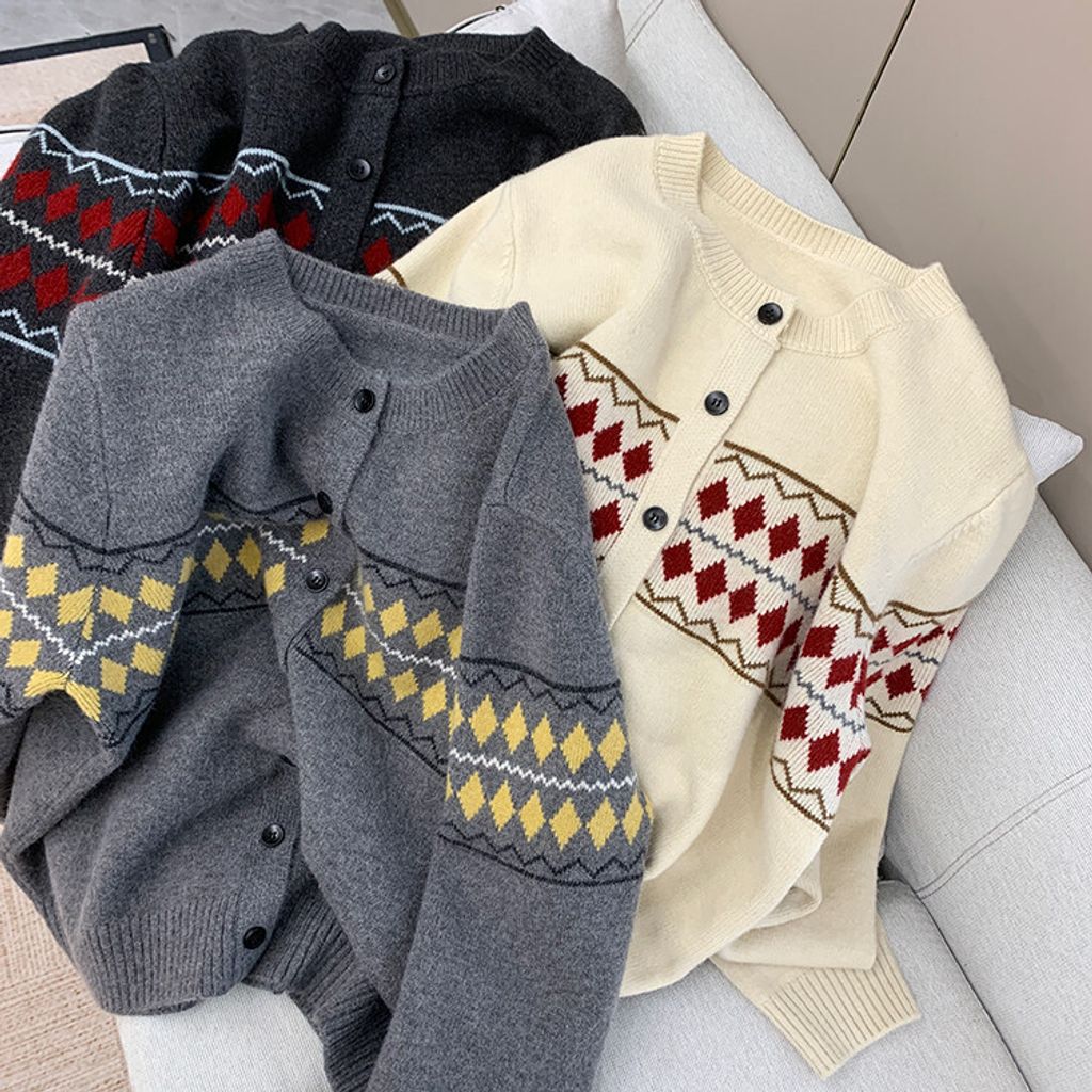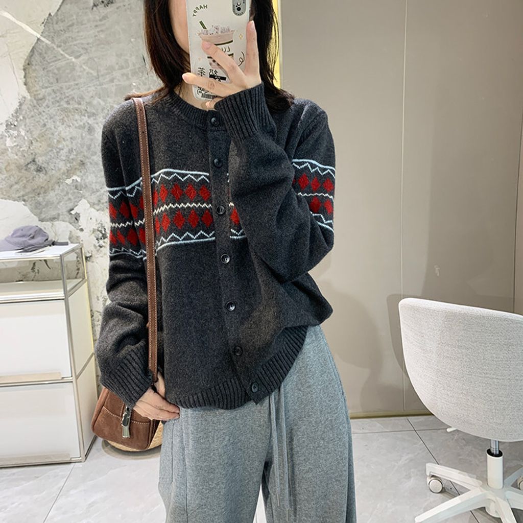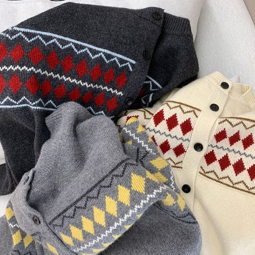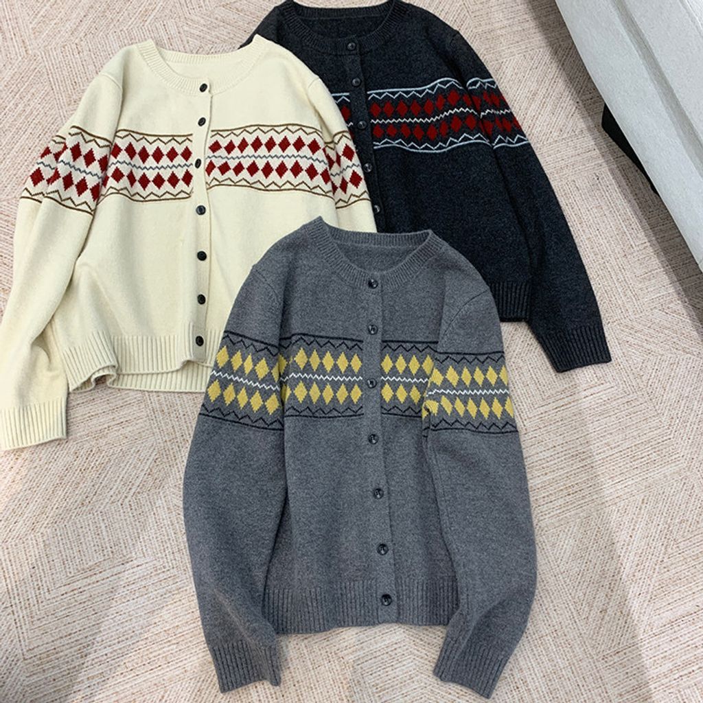 復古費爾島菱格拼色針織毛衣外套*深灰淺灰米*【S0125-141】