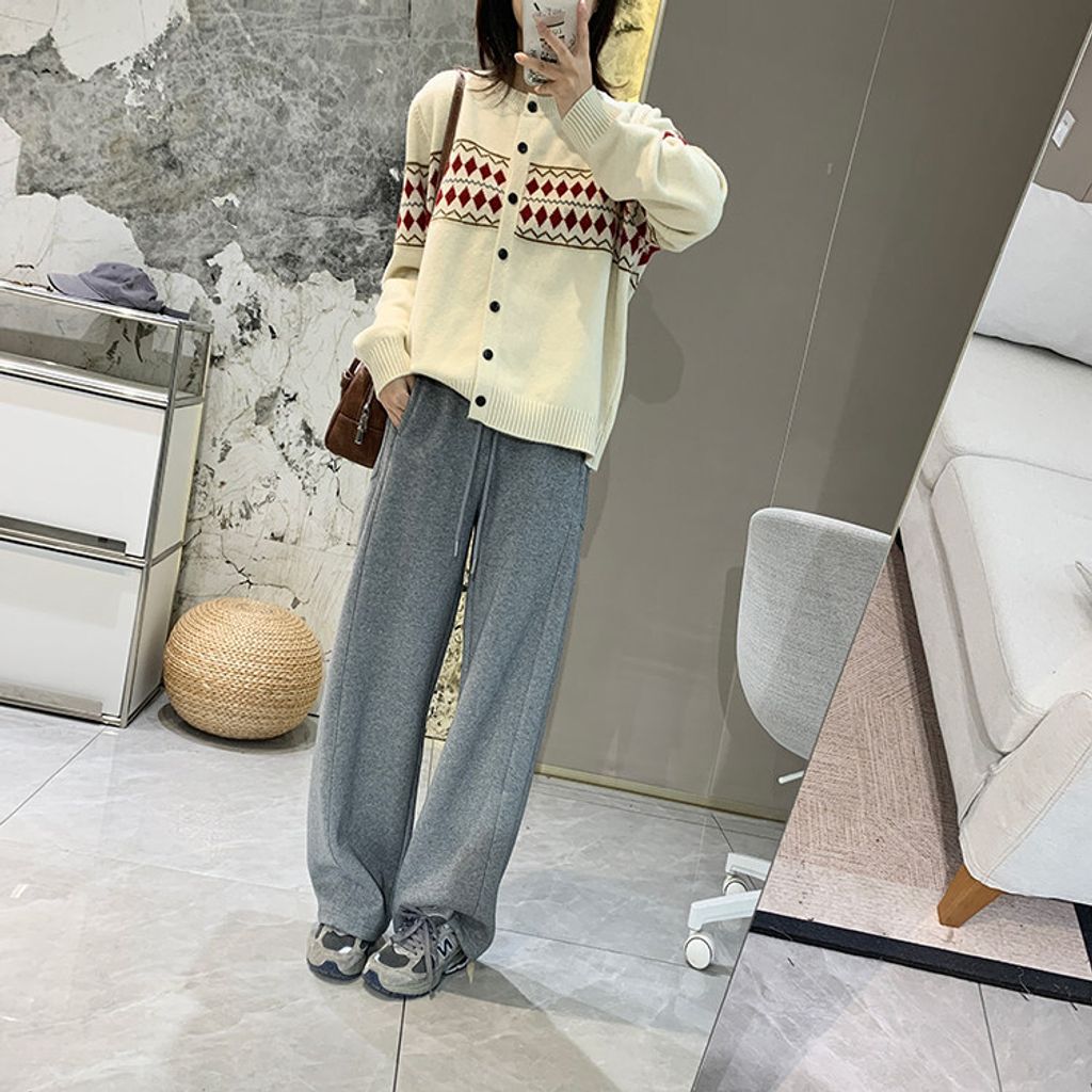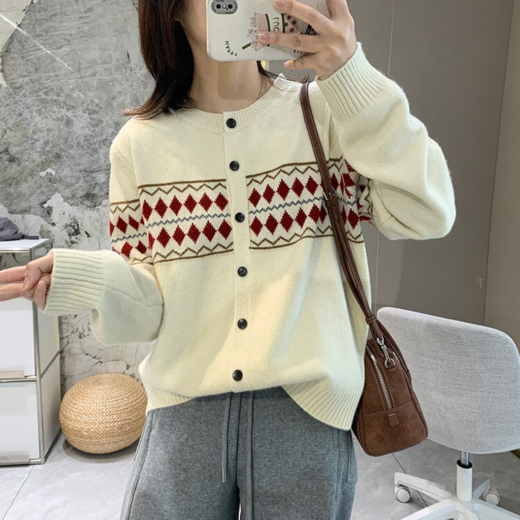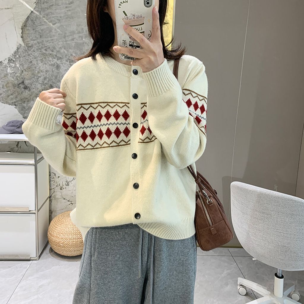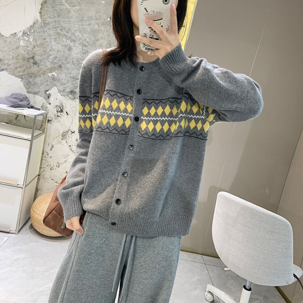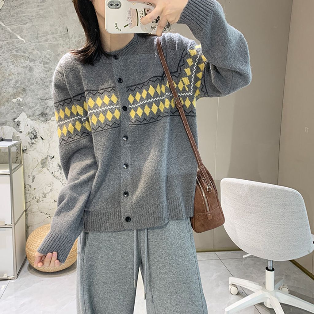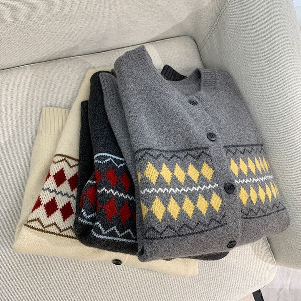 復古費爾島菱格拼色針織毛衣外套*深灰淺灰米*【S0125-141】