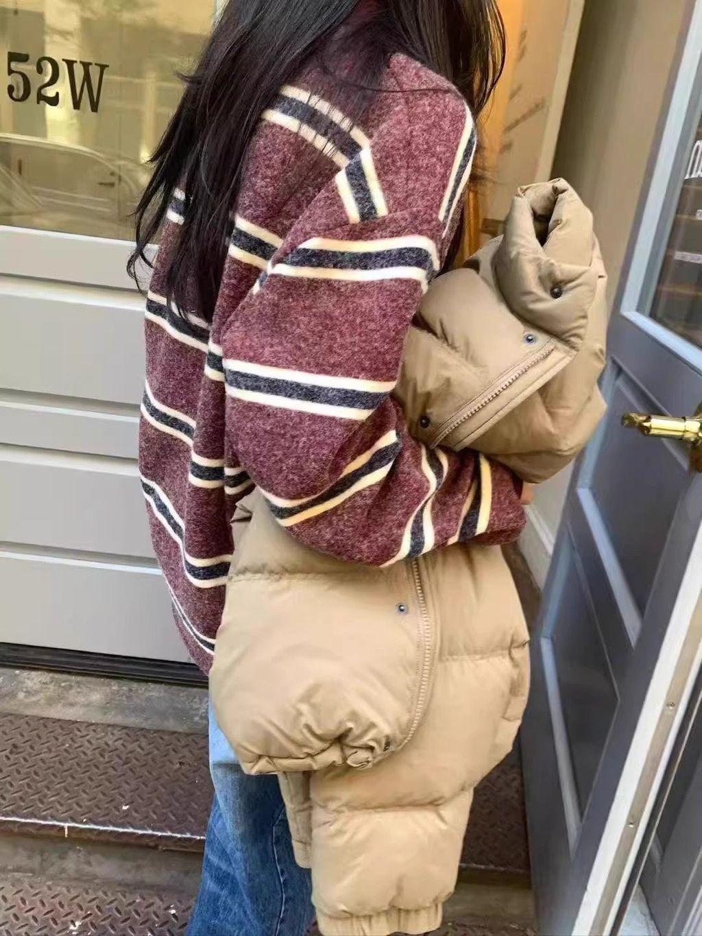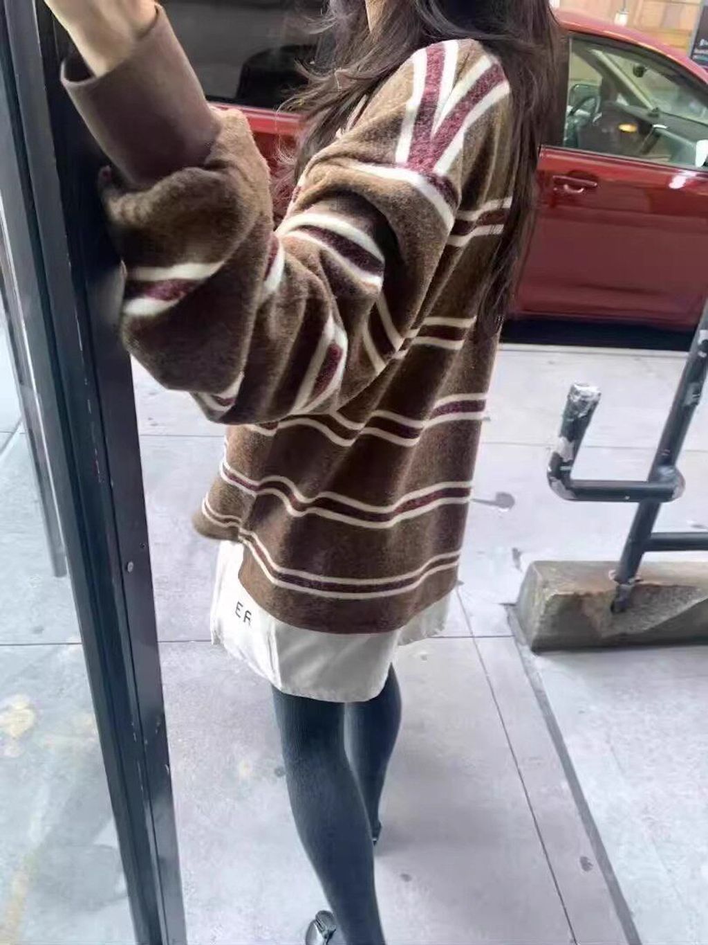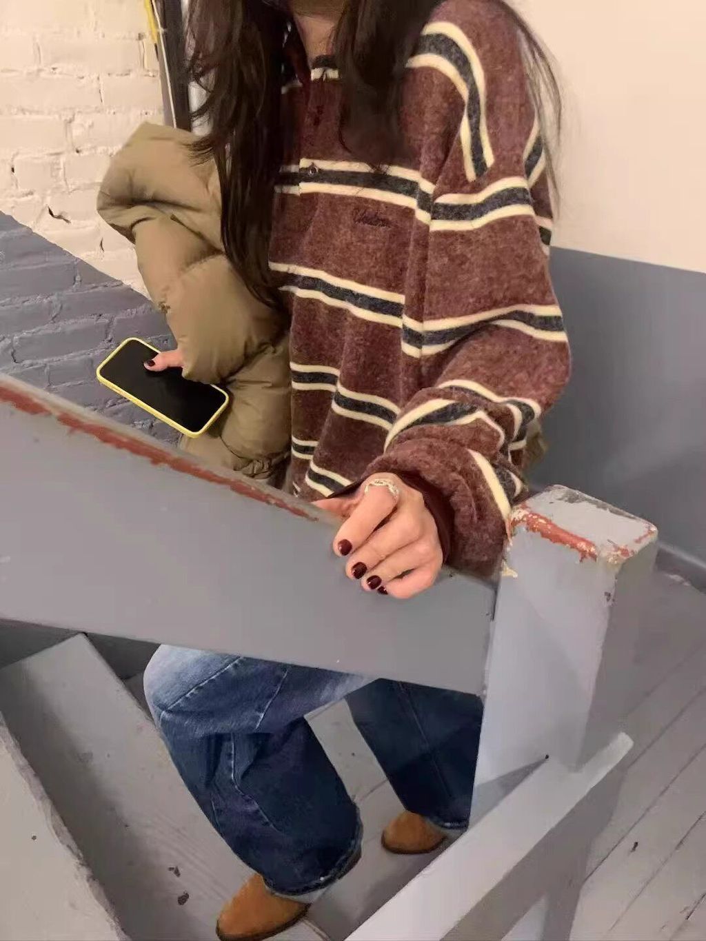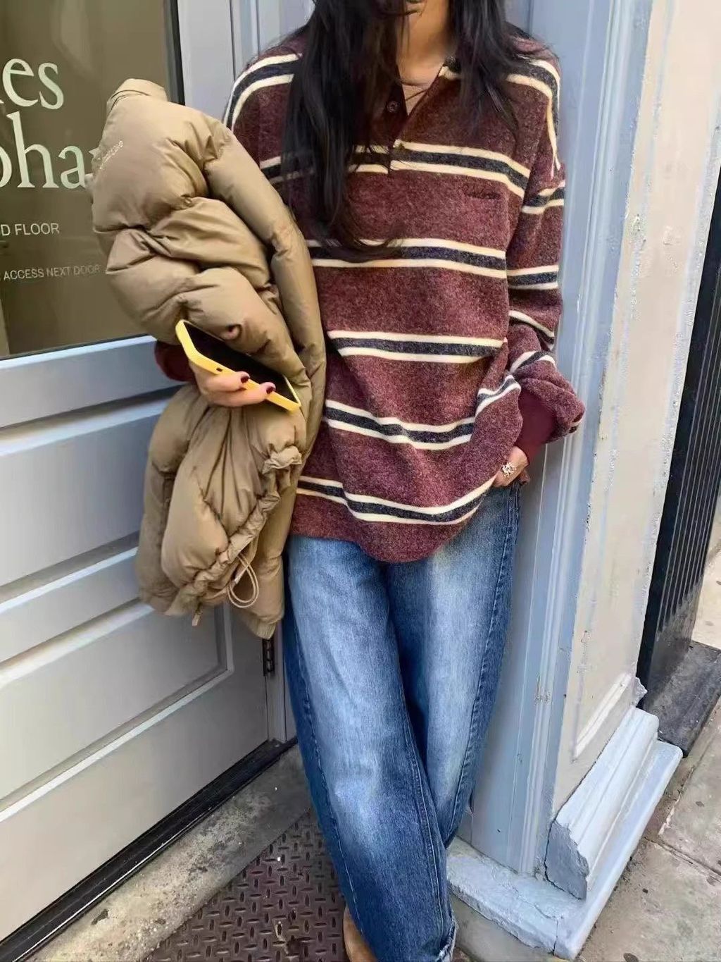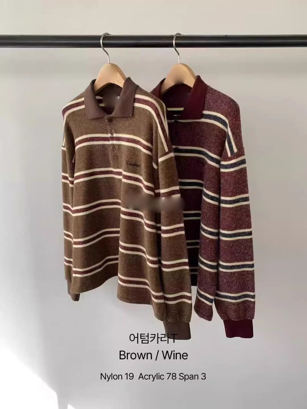 正韓 復古經典條紋POLO領寬鬆針織衫*棕酒紅*【S0125-26】