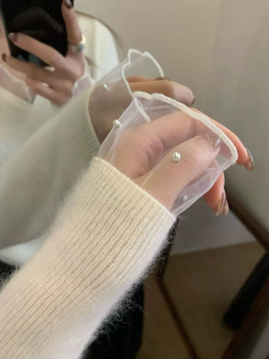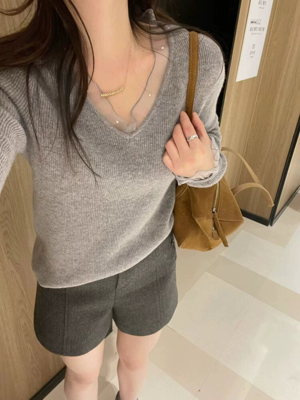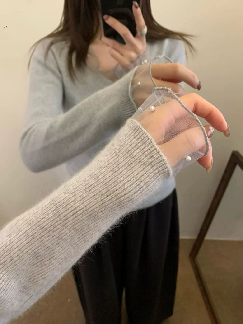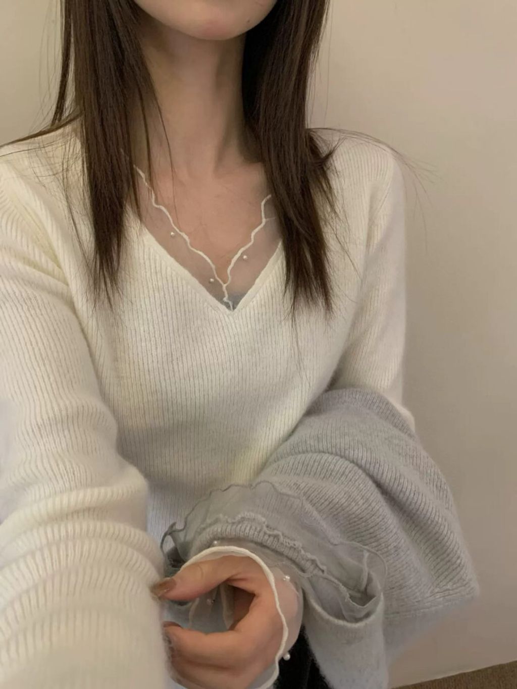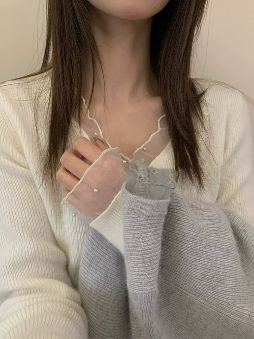 正韓 韓國設計師V領珍珠蕾絲邊羊毛針織毛衣*灰米*【S0125-12】