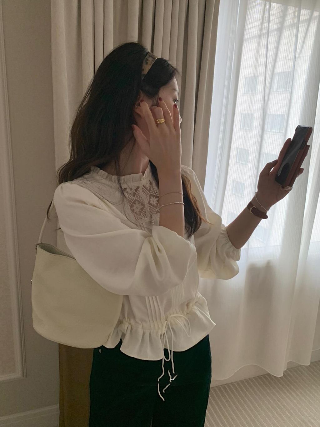 韓 法式優雅雕花花邊抽繩質感襯衫*圖片色*【S0323-62】