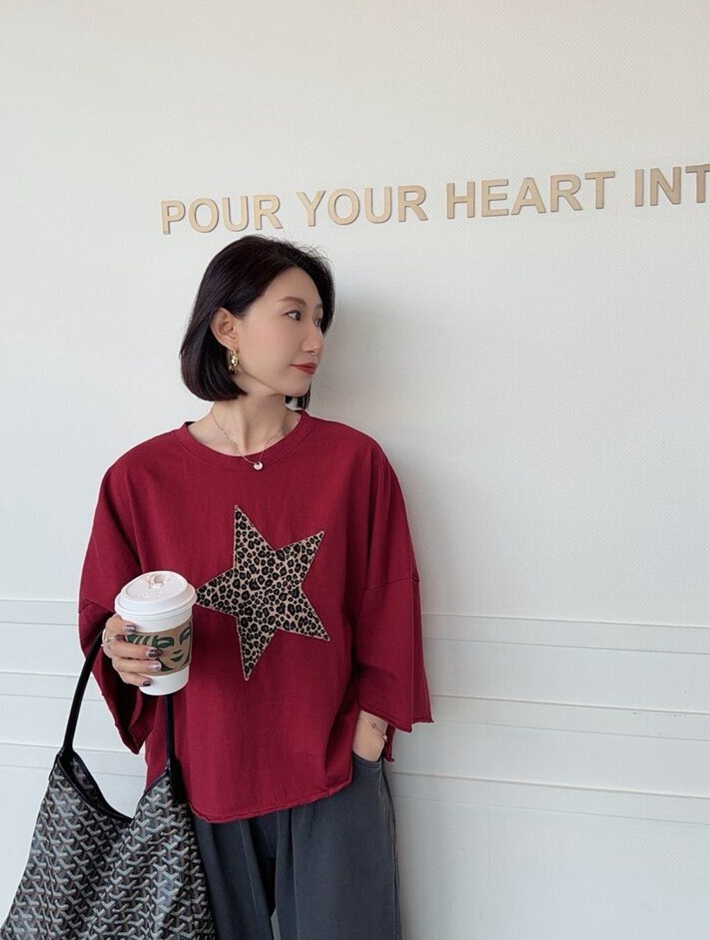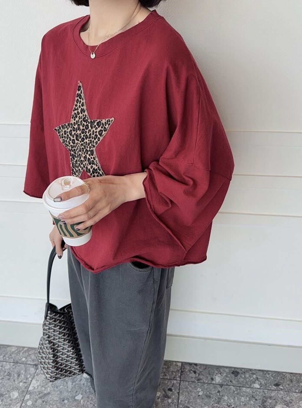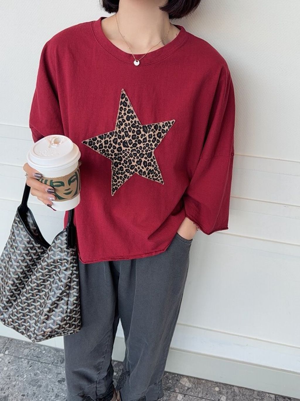 韓 亮眼時尚豹紋星星七分袖短T*紅*【S0323-160】