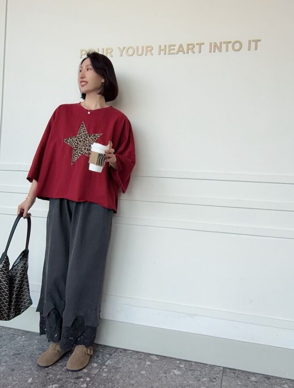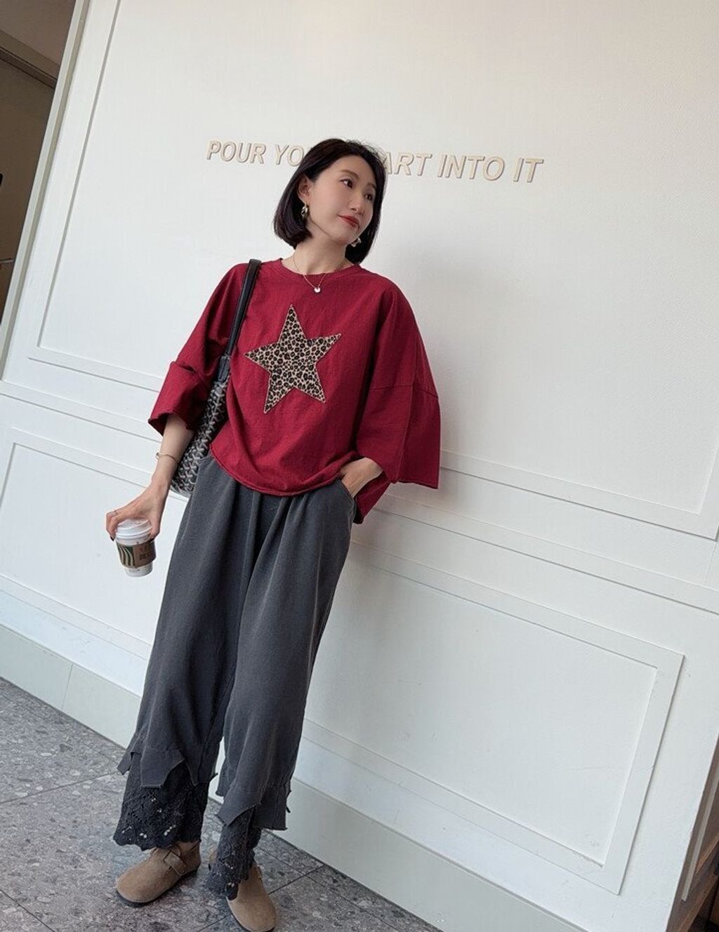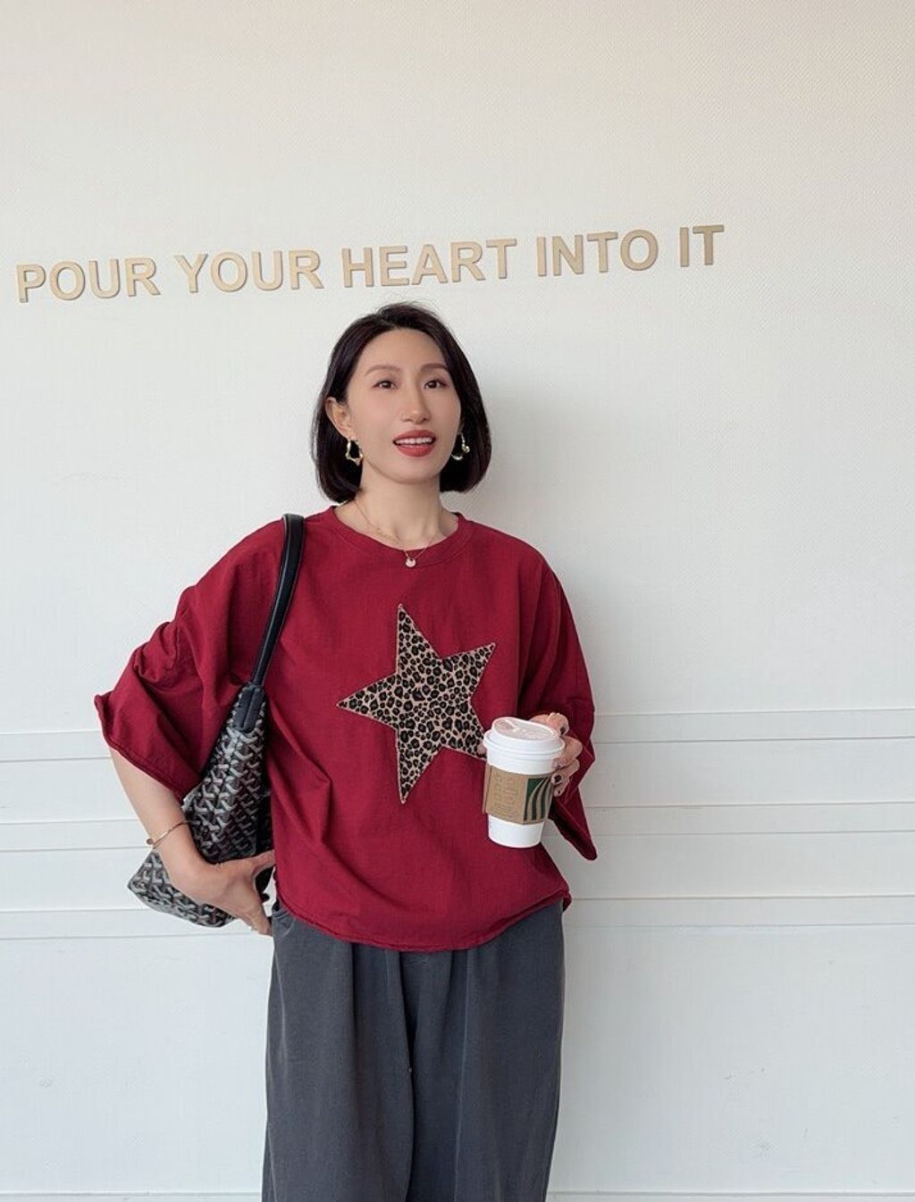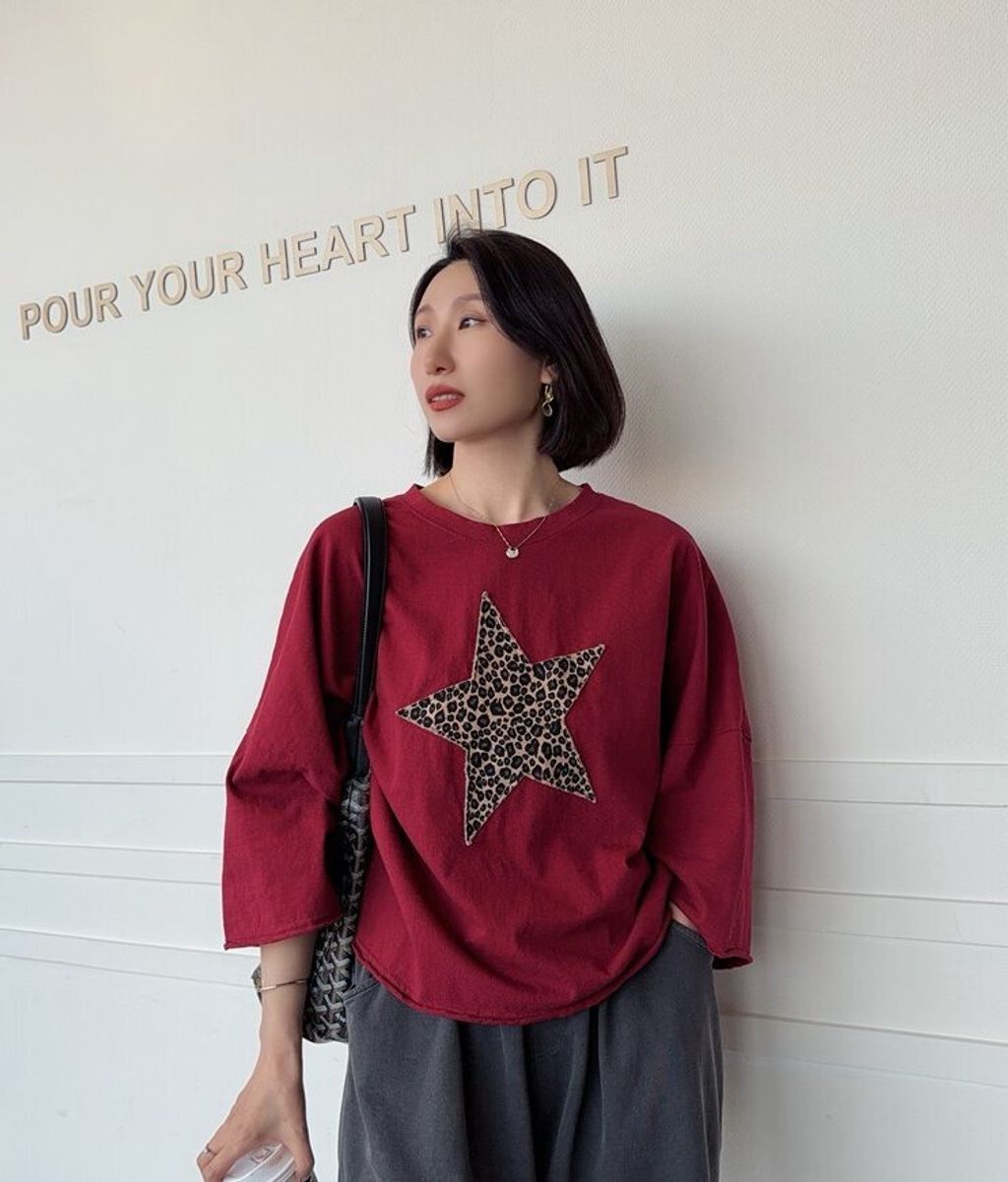 韓 亮眼時尚豹紋星星七分袖短T*紅*【S0323-160】