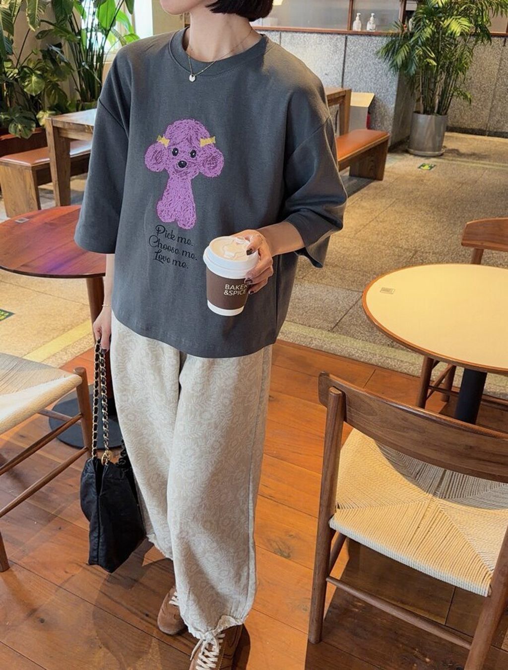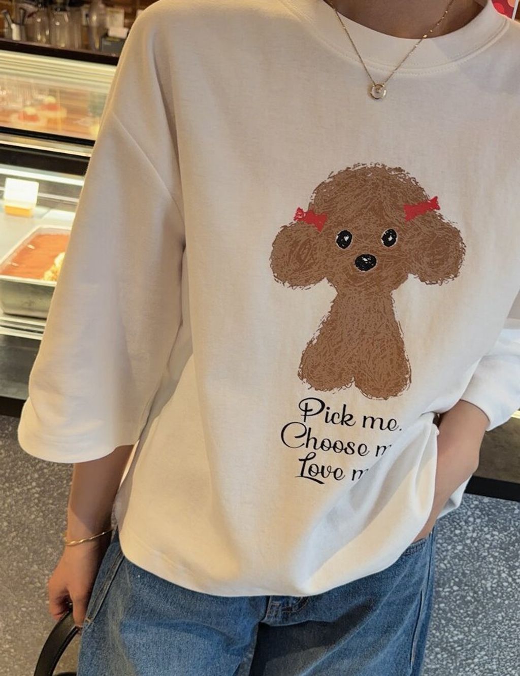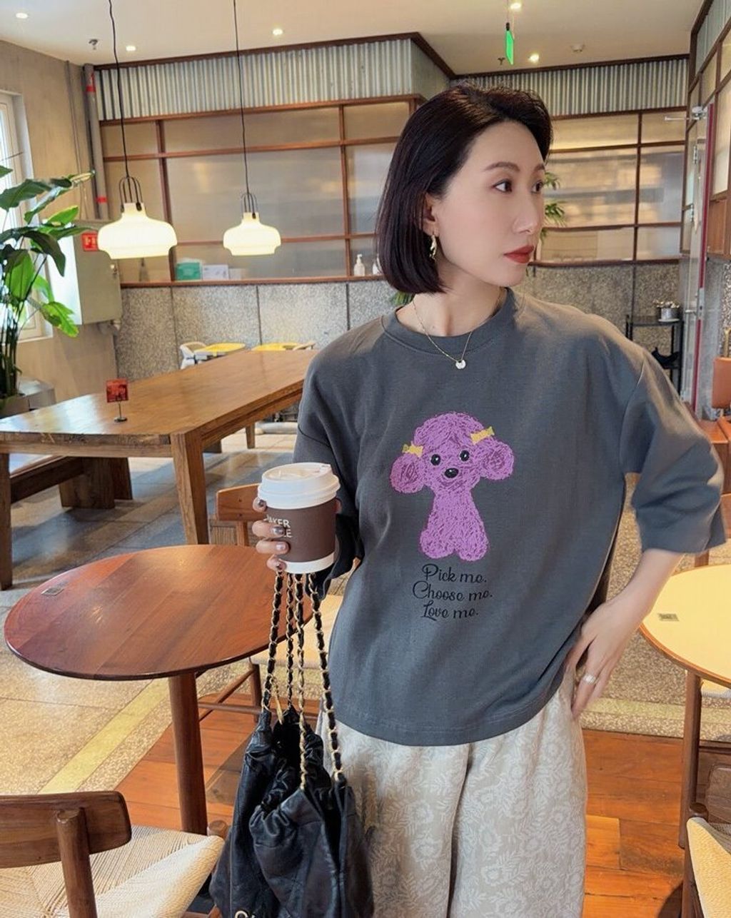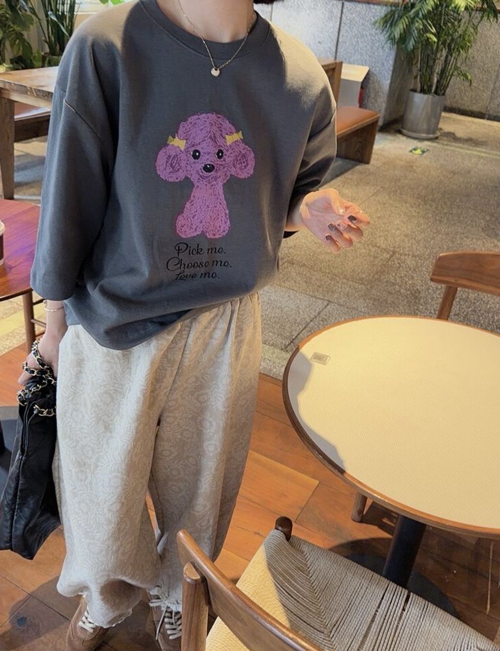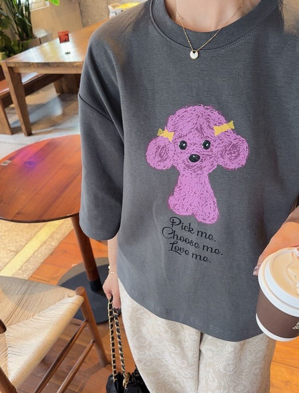 韓 可愛狗狗印花寬鬆感七分袖短T*深灰白*【S0323-146】