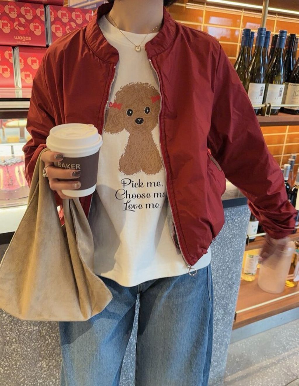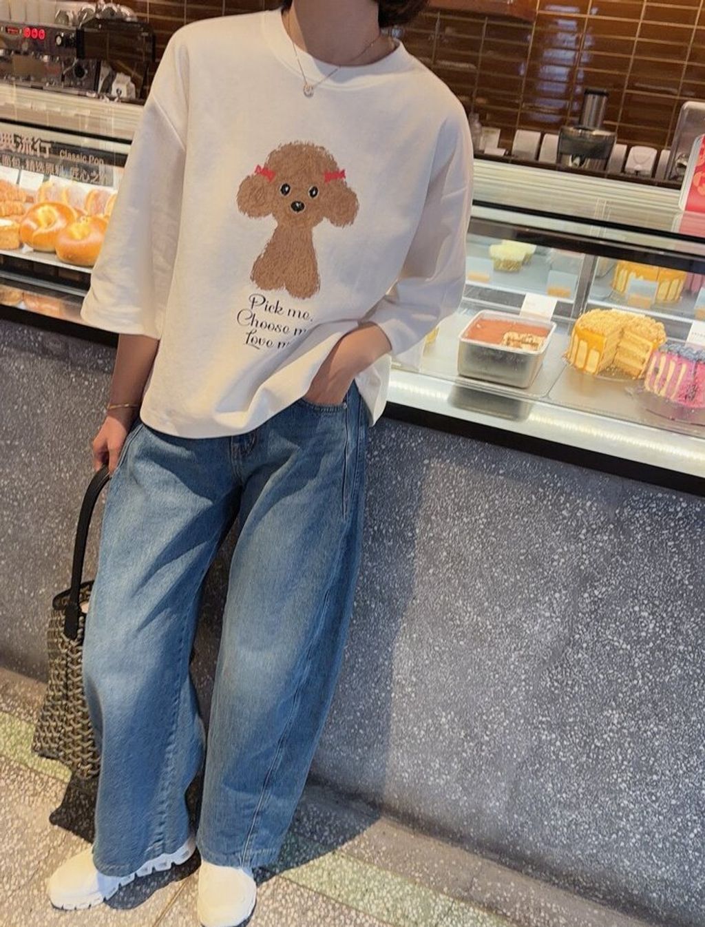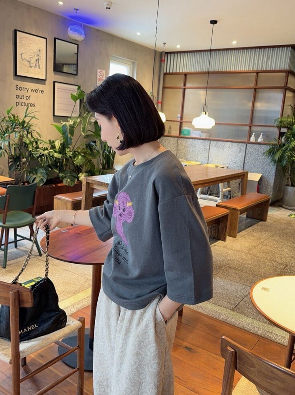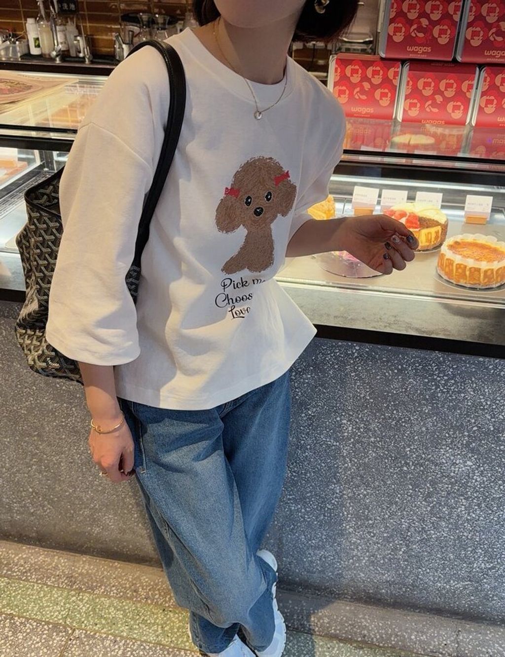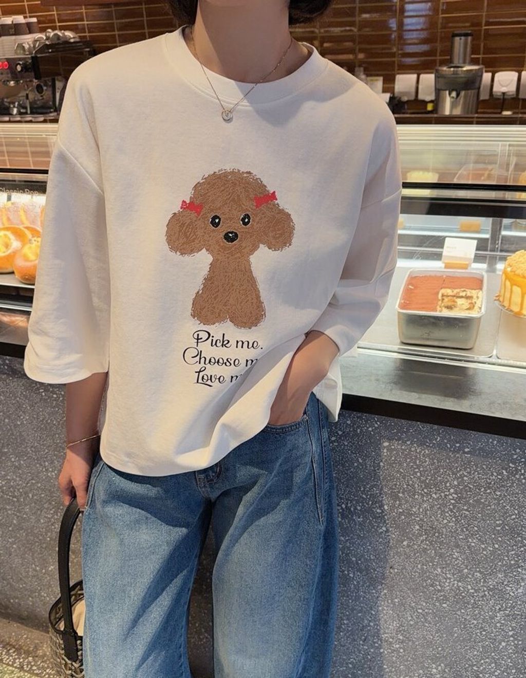 韓 可愛狗狗印花寬鬆感七分袖短T*深灰白*【S0323-146】