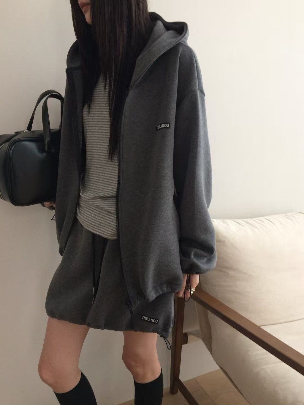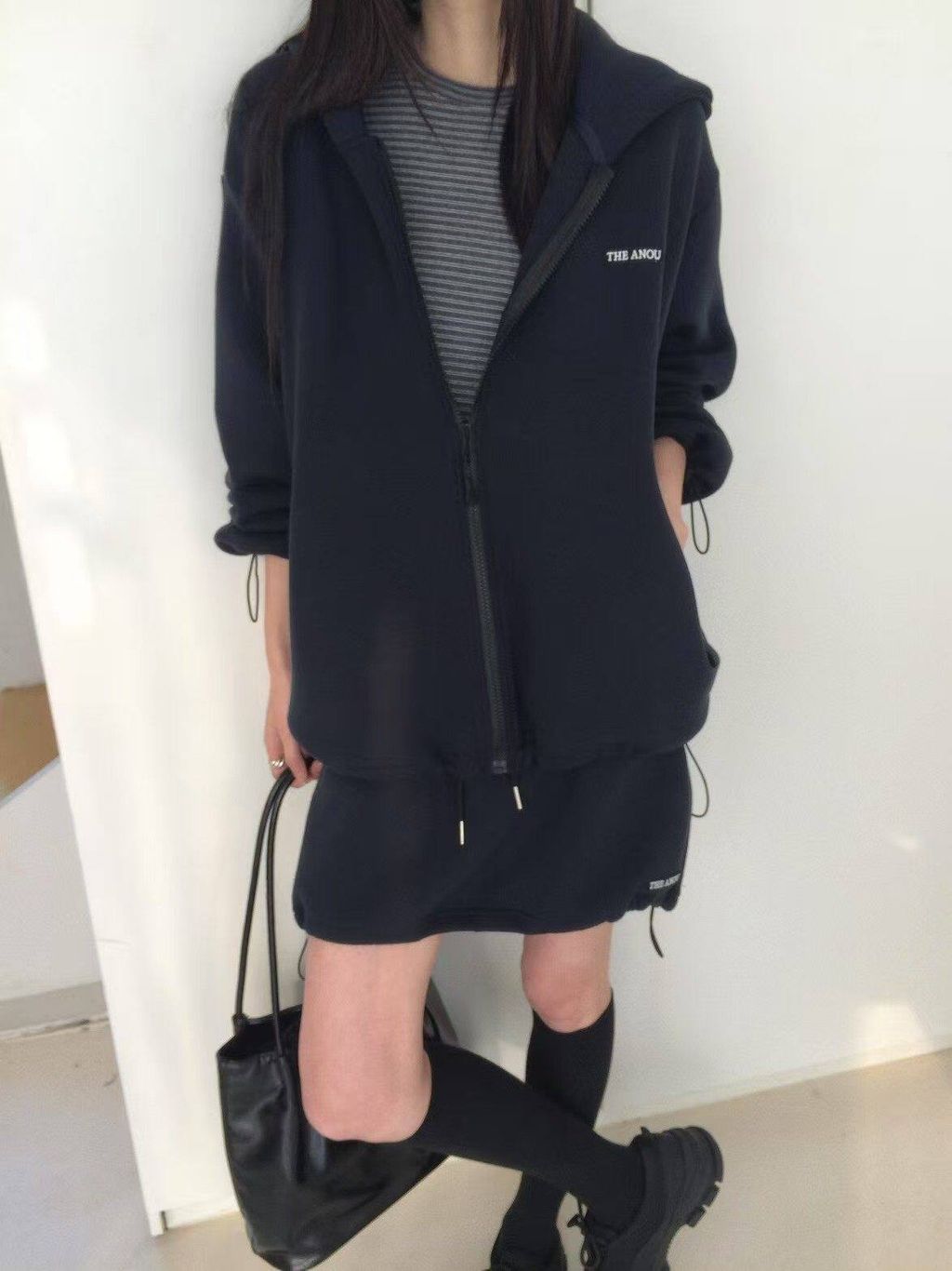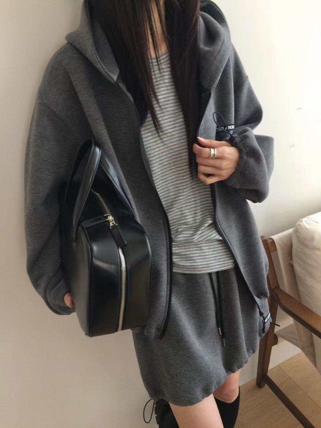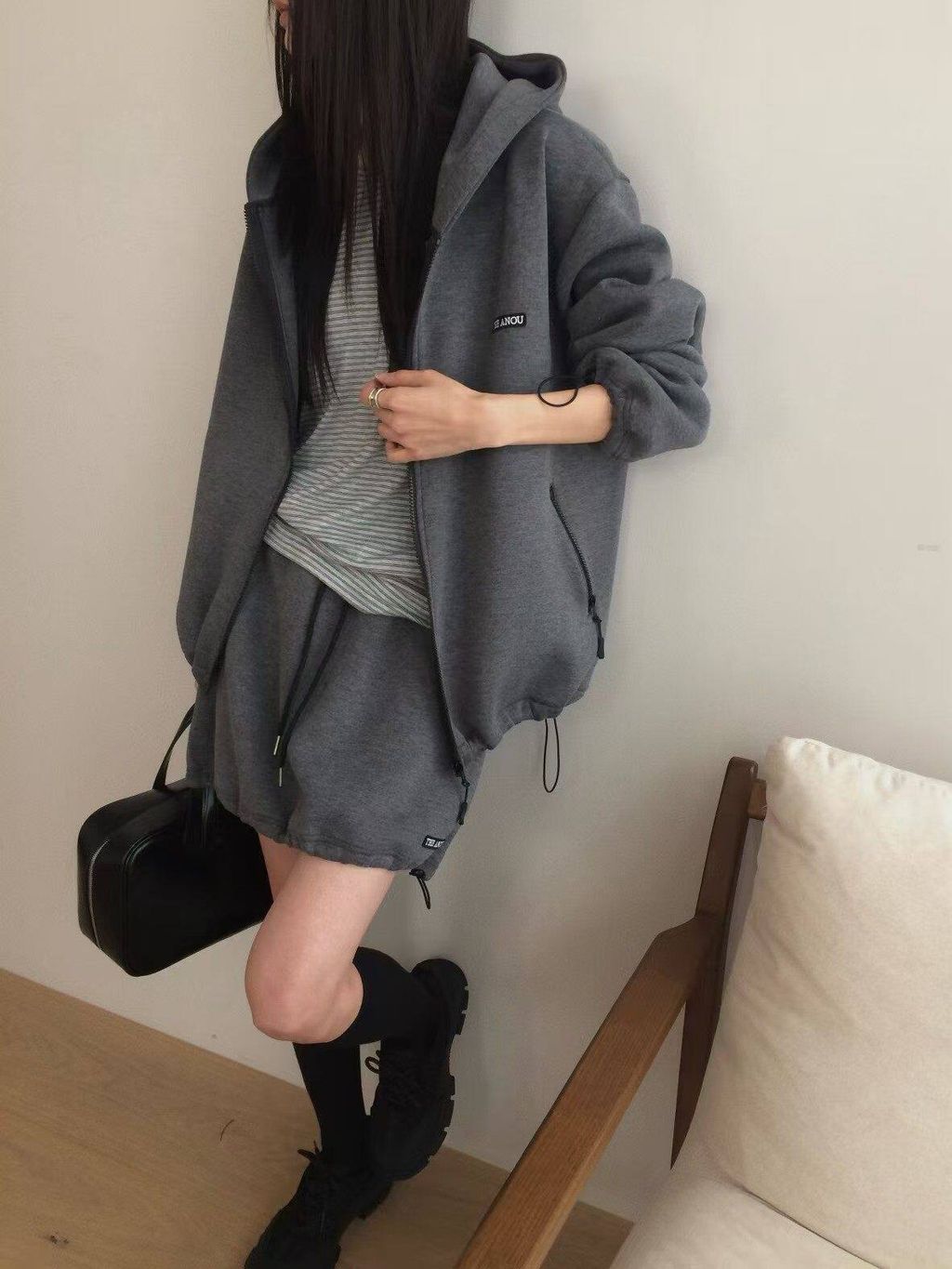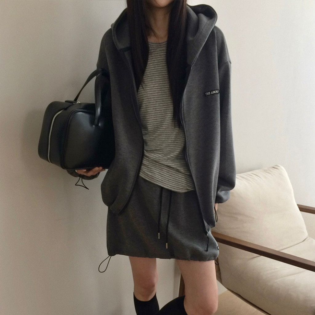 韓 復古學院風休閒感寬鬆連帽外套*灰深藍*【S0228-17】
