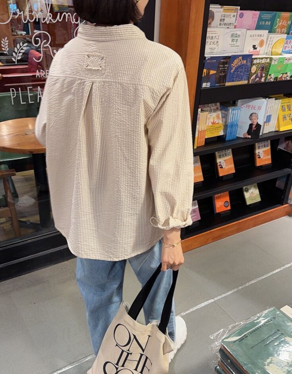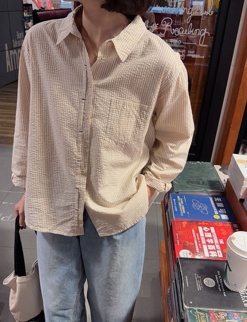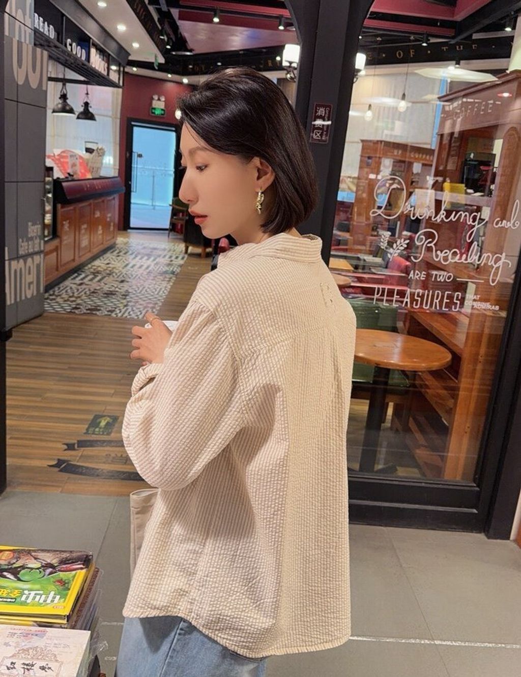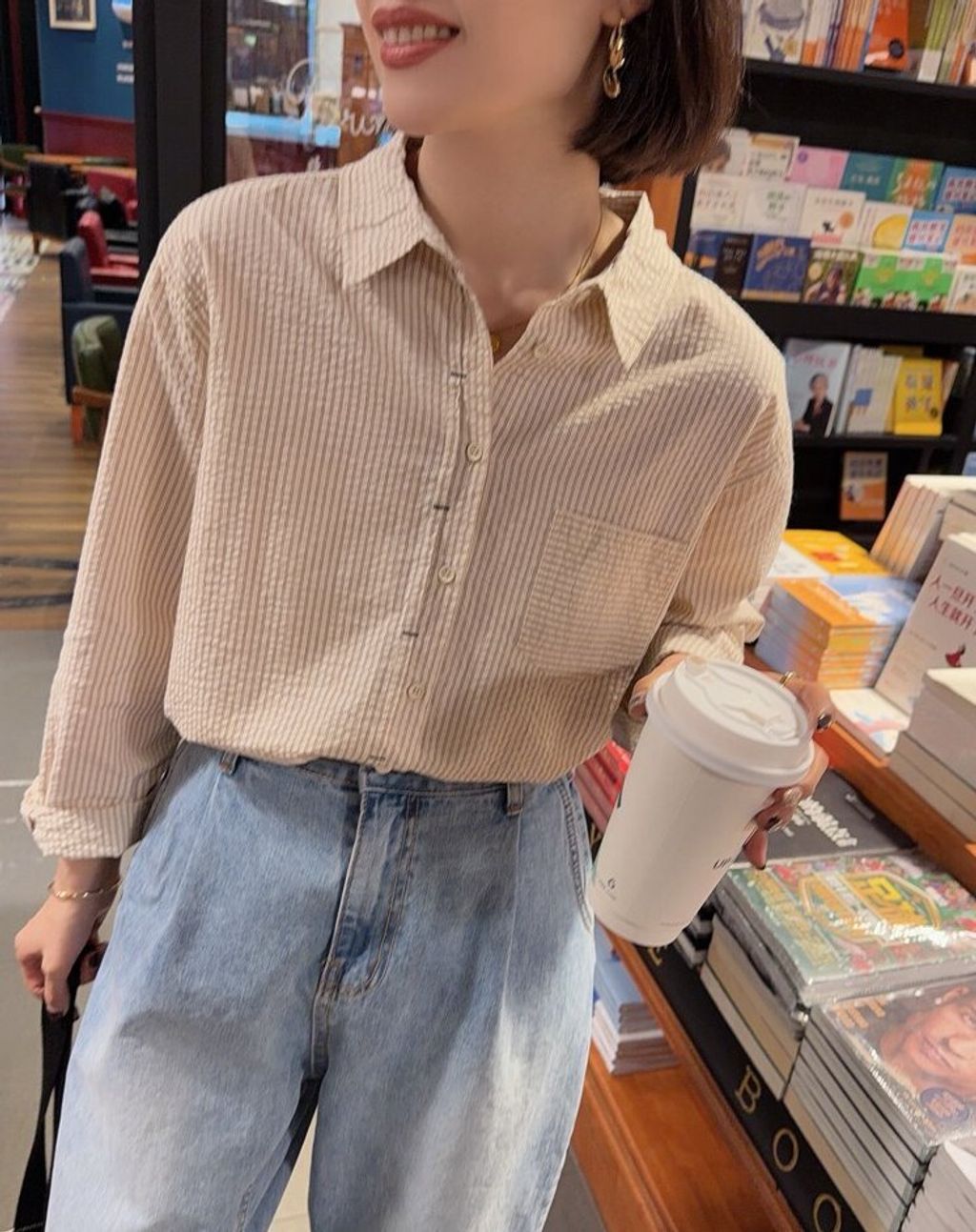 韓 溫柔米棕色直條紋寬鬆襯衫*米*【S0323-145】