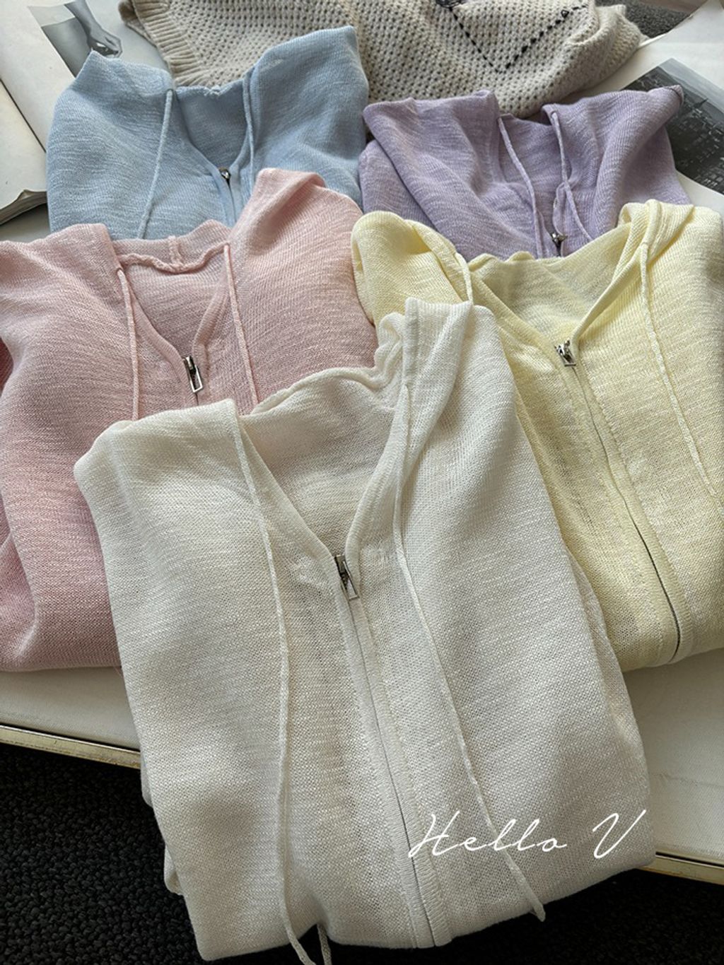 米白色、淺藍色、淺黃色、淺粉色、紫色