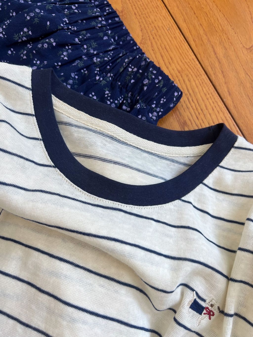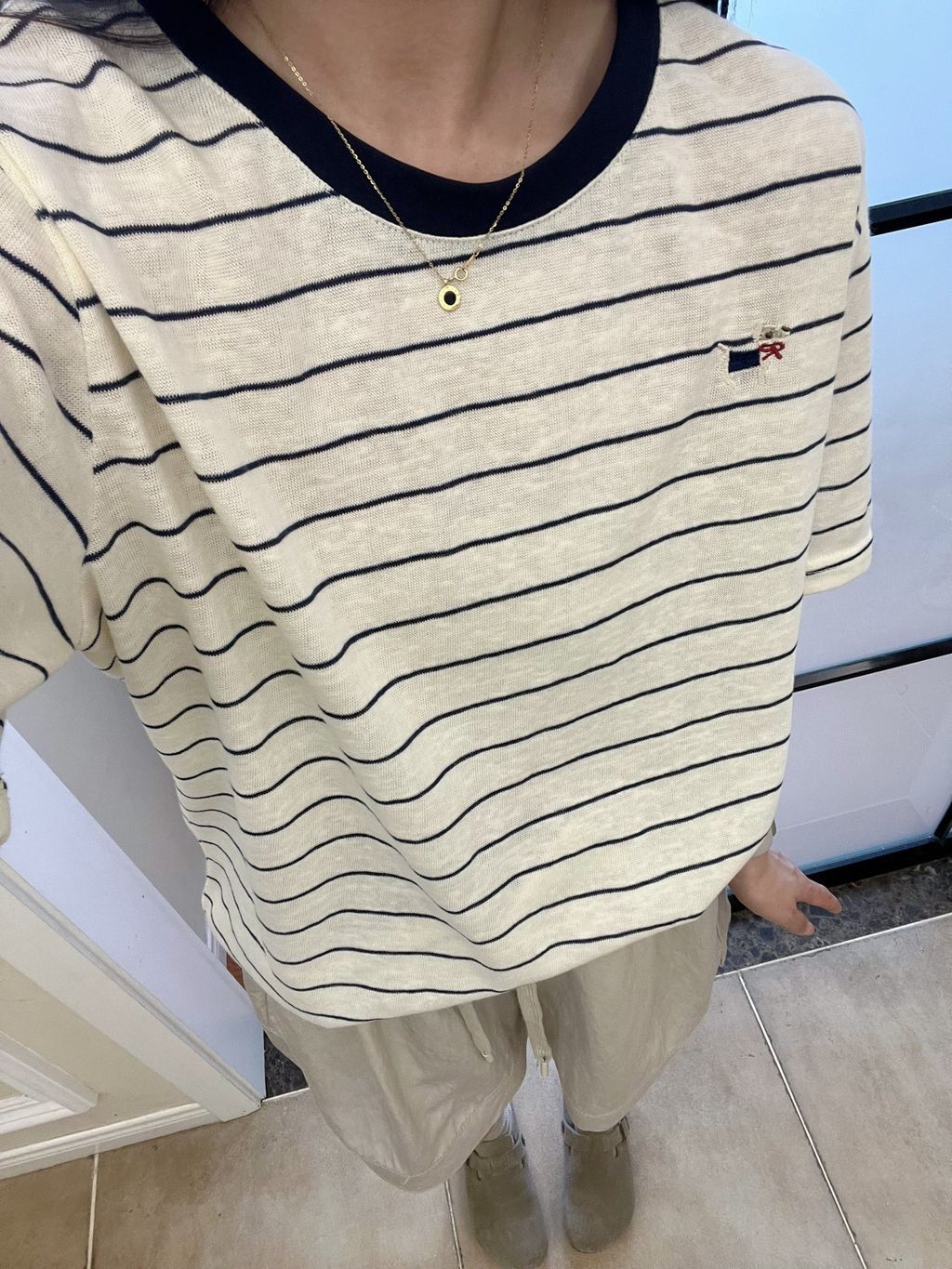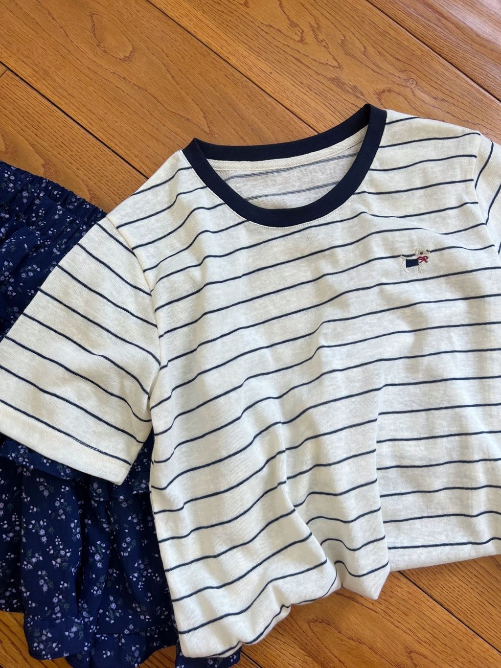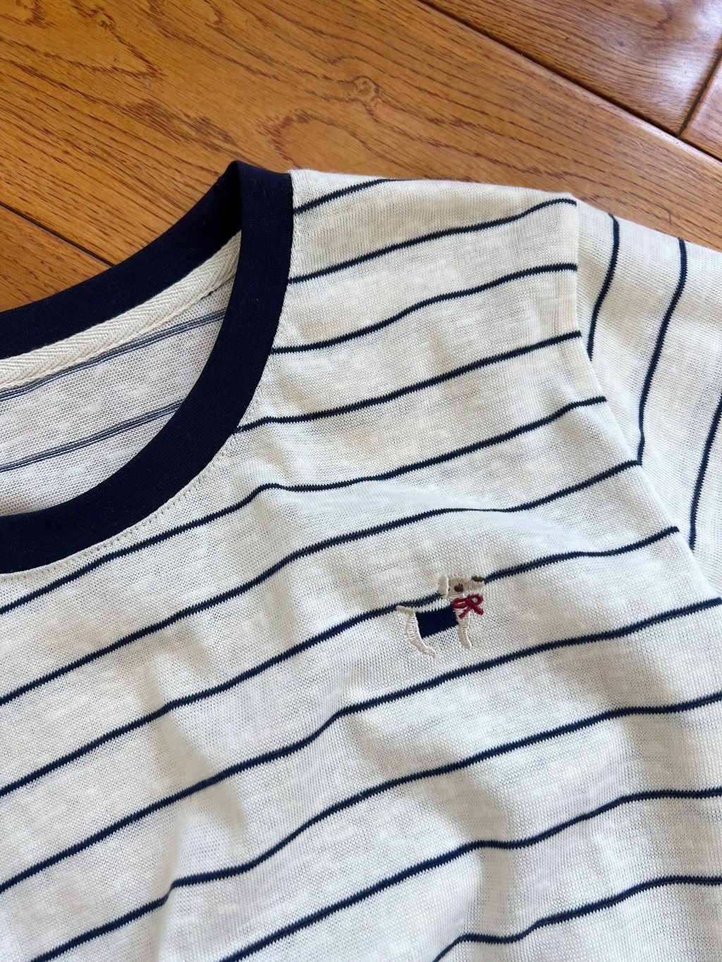 可愛簡單小狗刺繡條紋短T*白*【N0731-126】