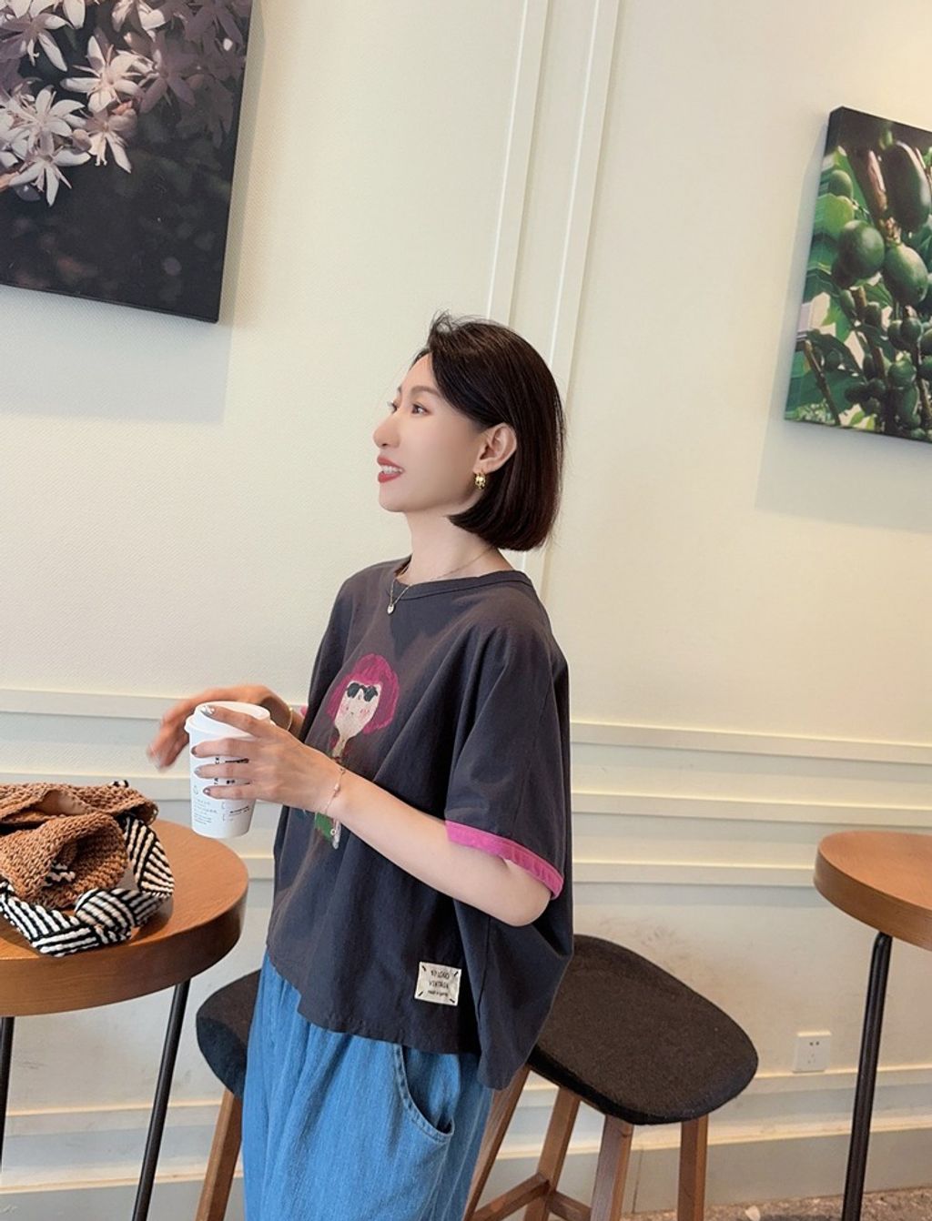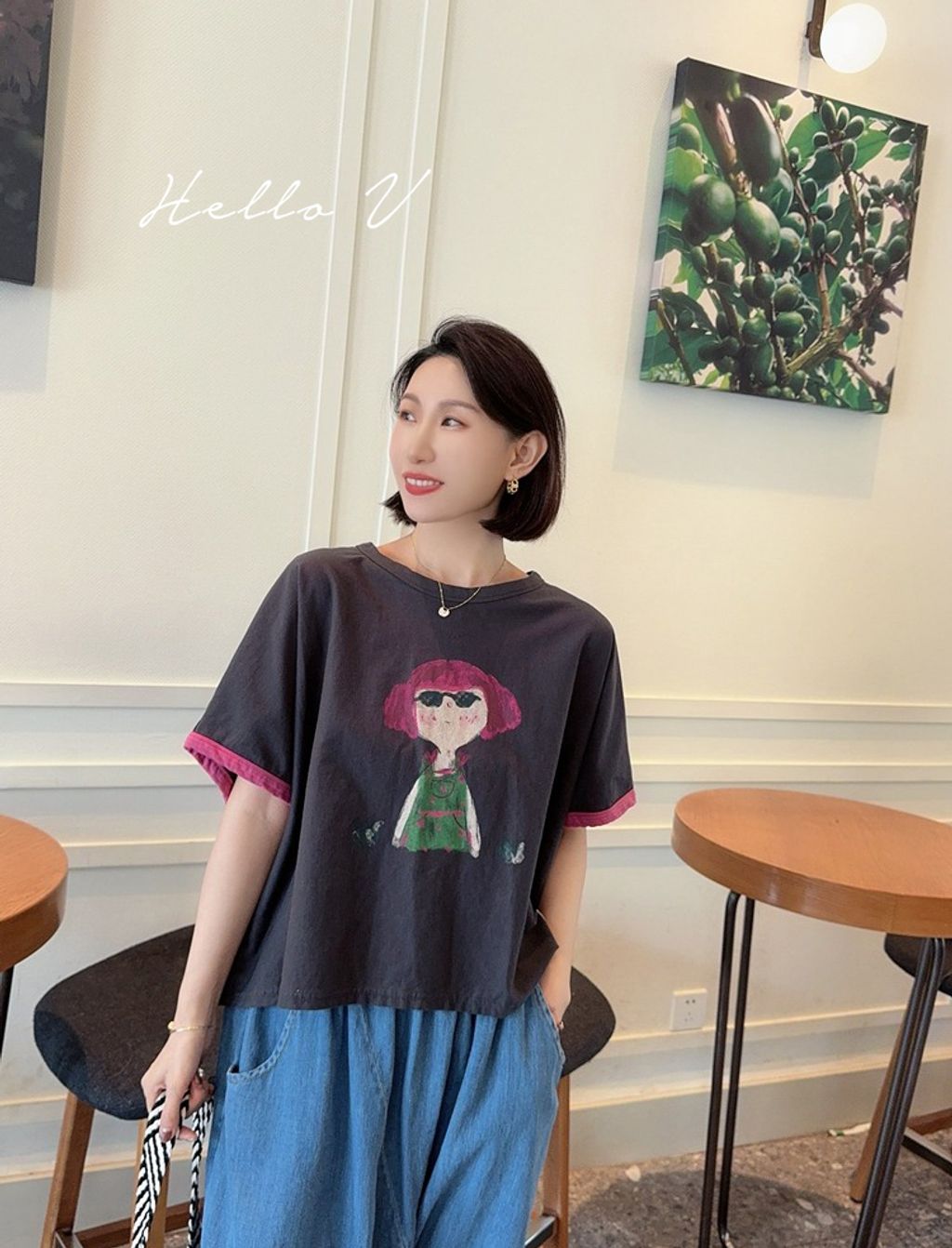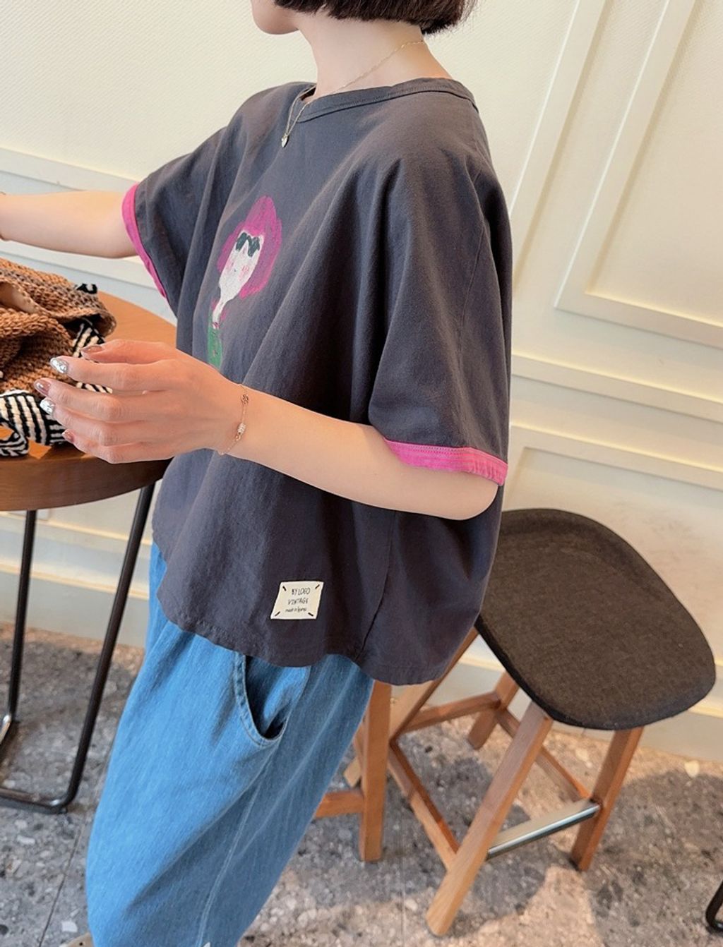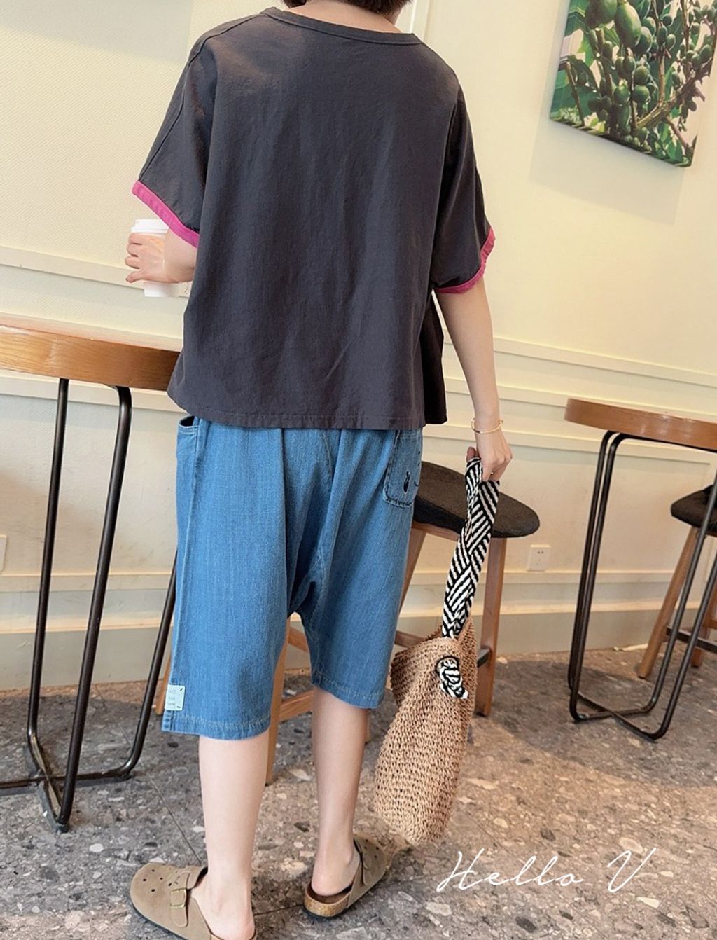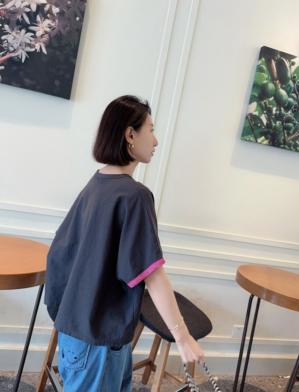正韓 復古時尚女孩滾邊撞色寬鬆短T*深灰*【N0731-87】