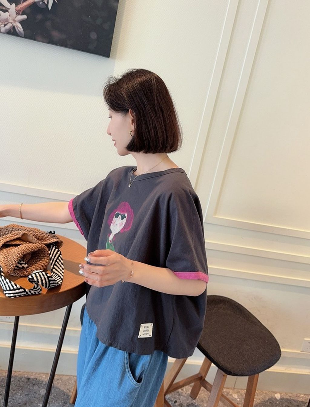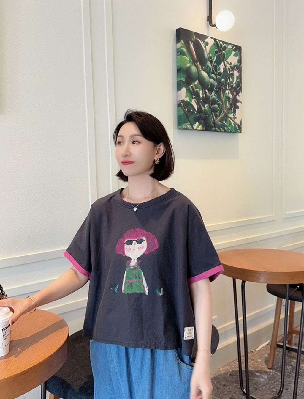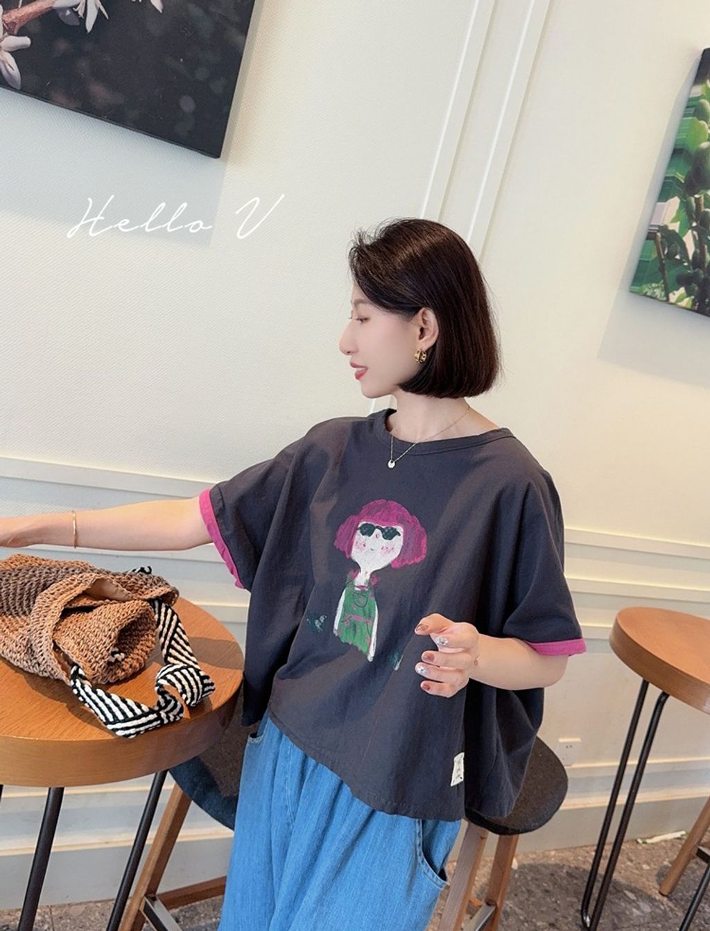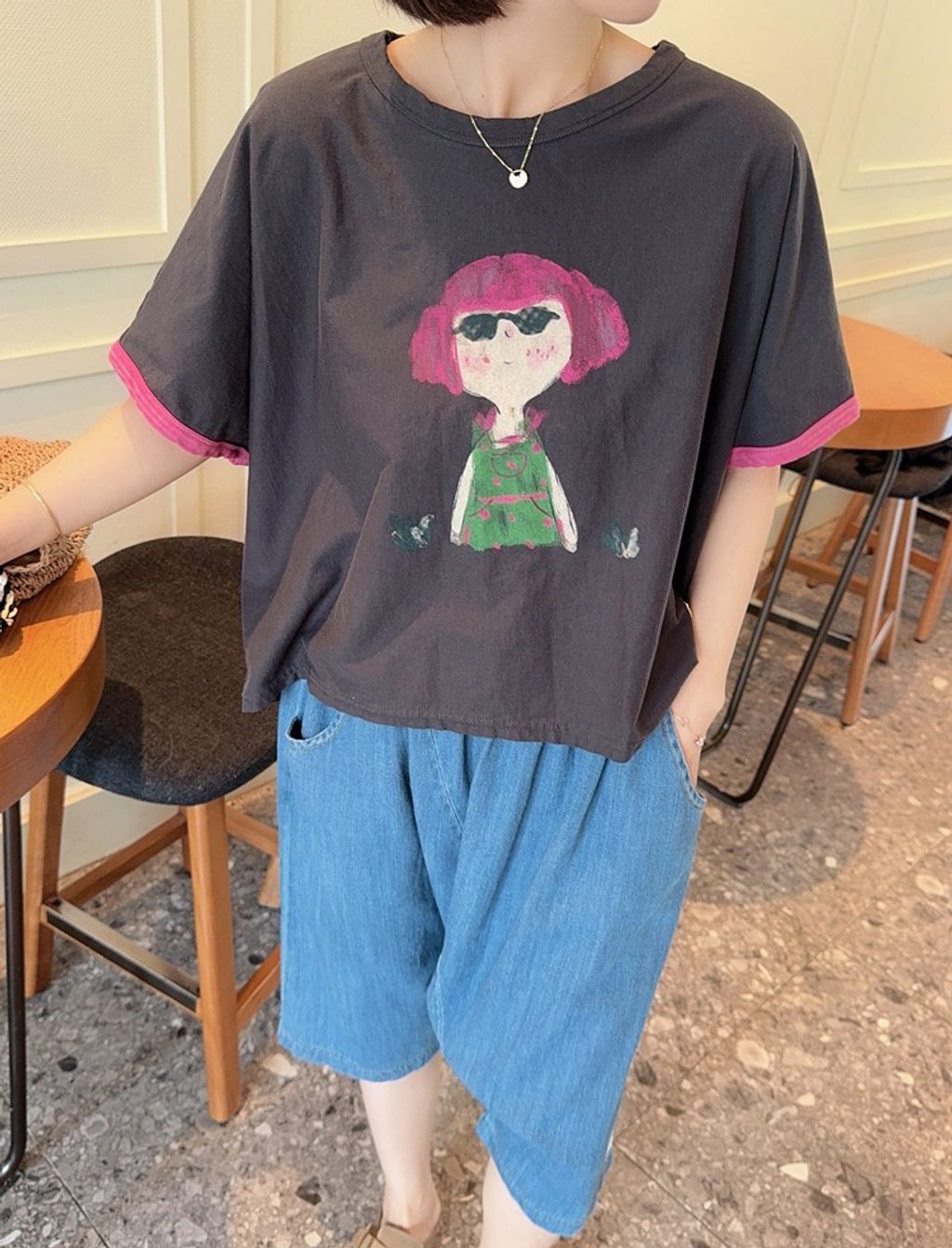 正韓 復古時尚女孩滾邊撞色寬鬆短T*深灰*【N0731-87】