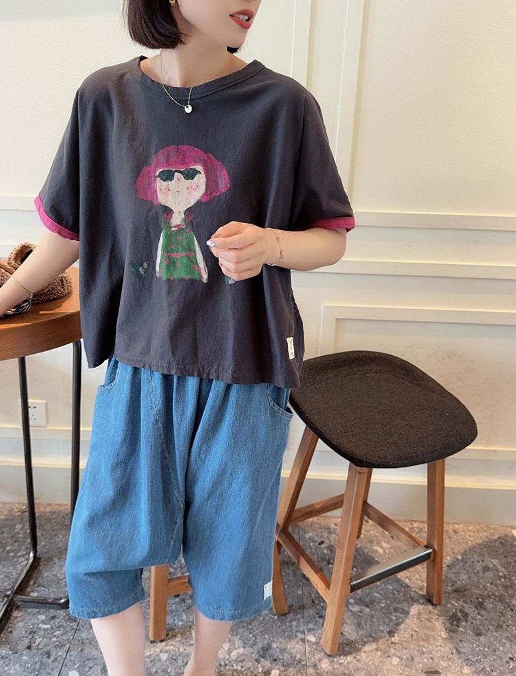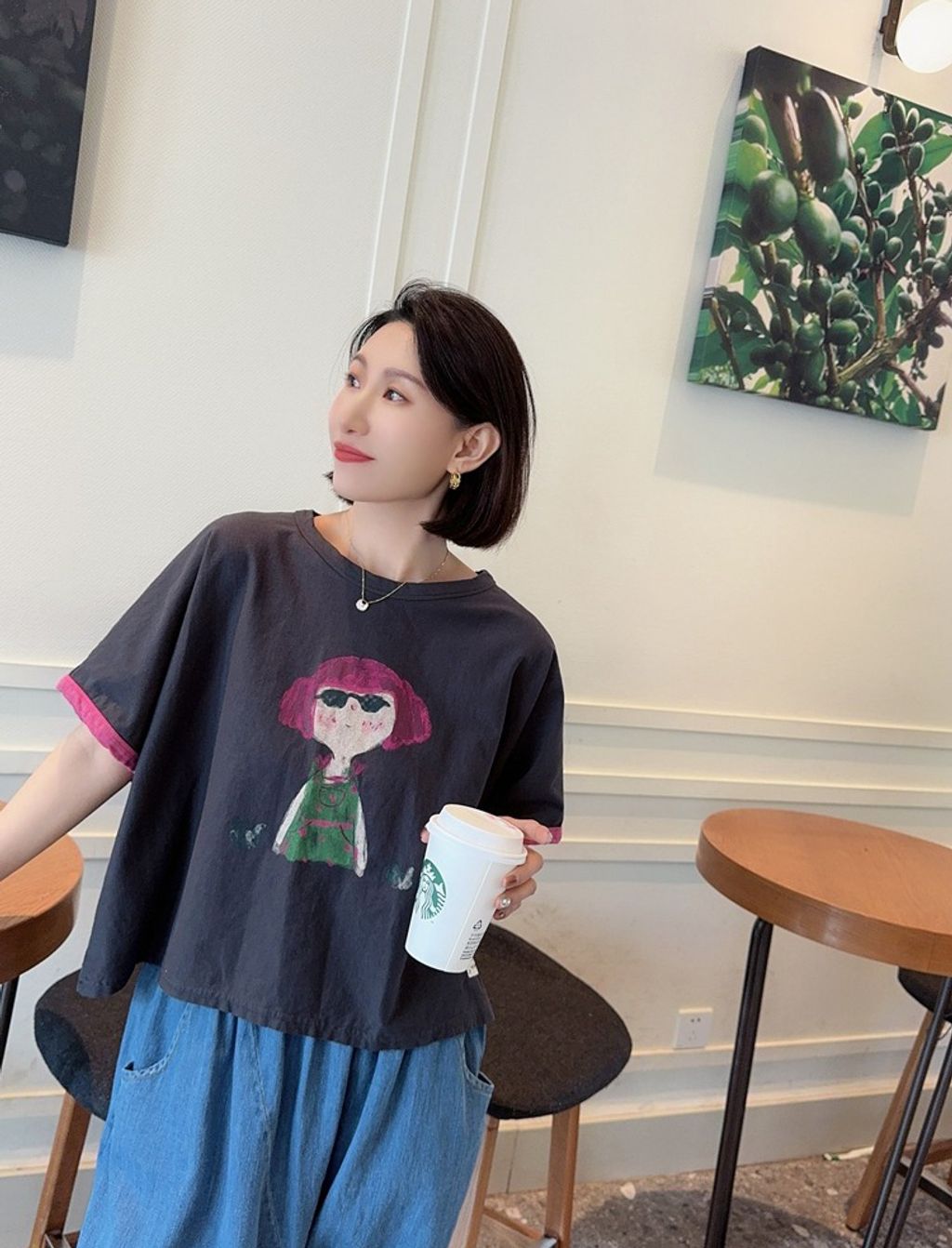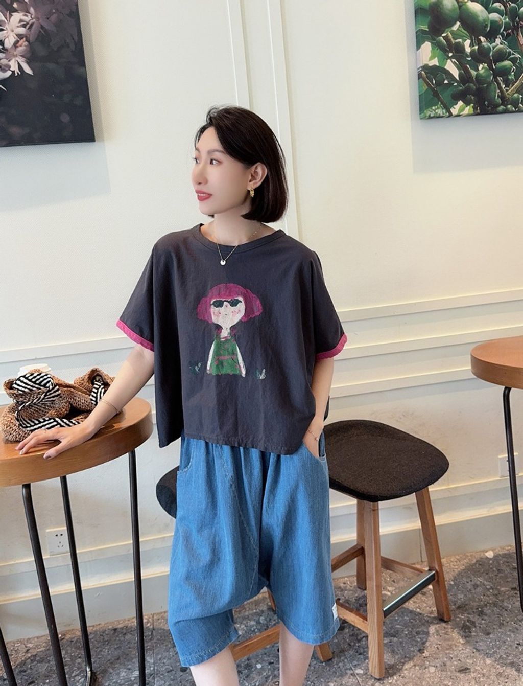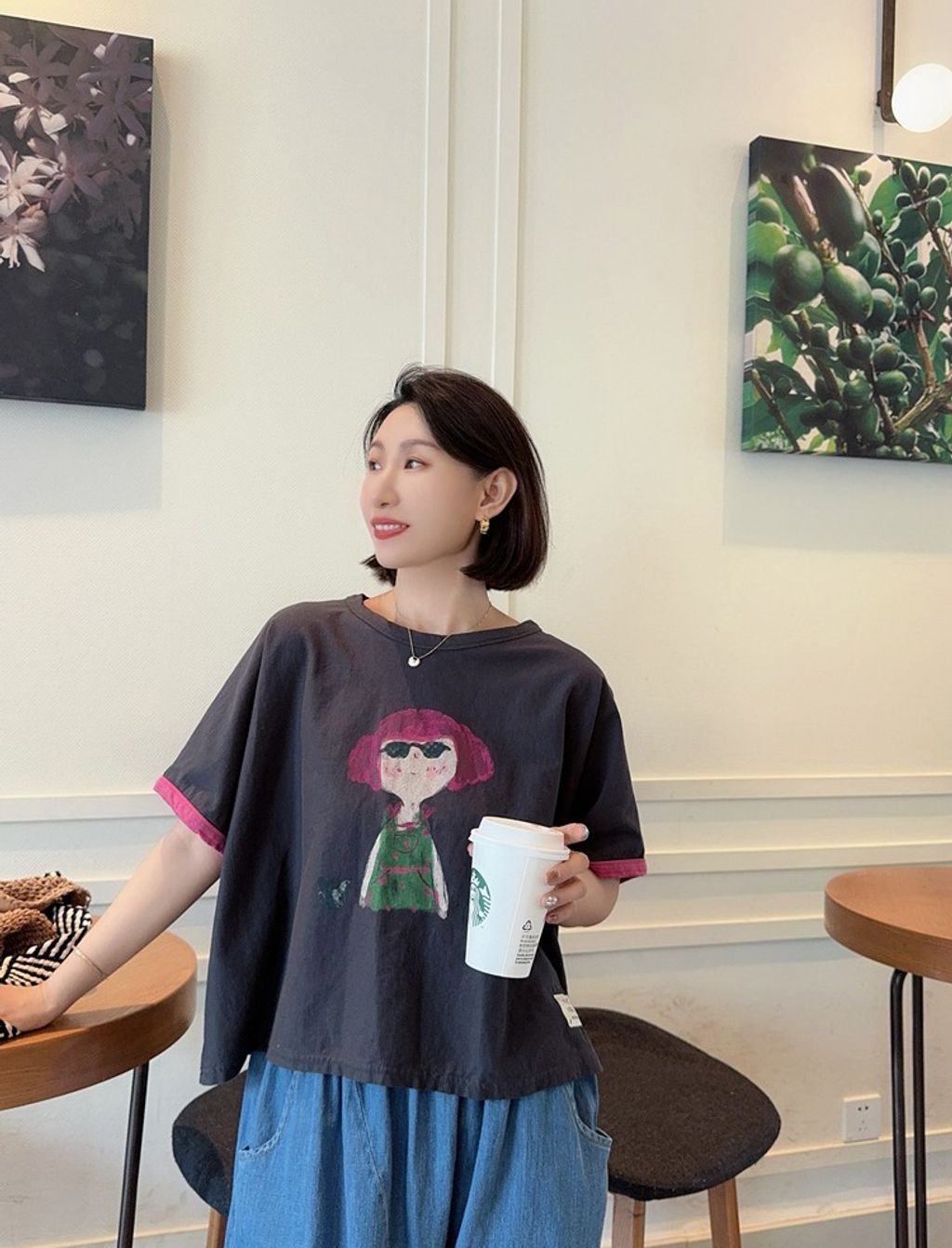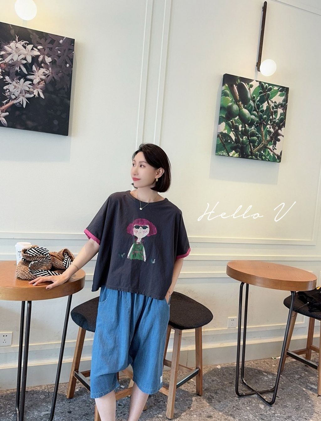 正韓 復古時尚女孩滾邊撞色寬鬆短T*深灰*【N0731-87】