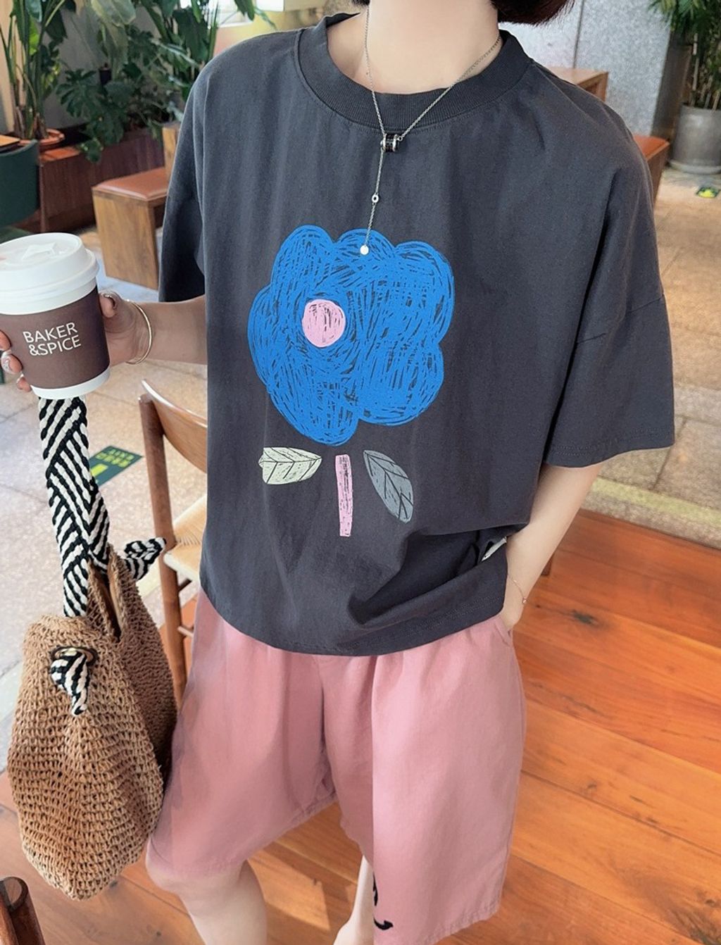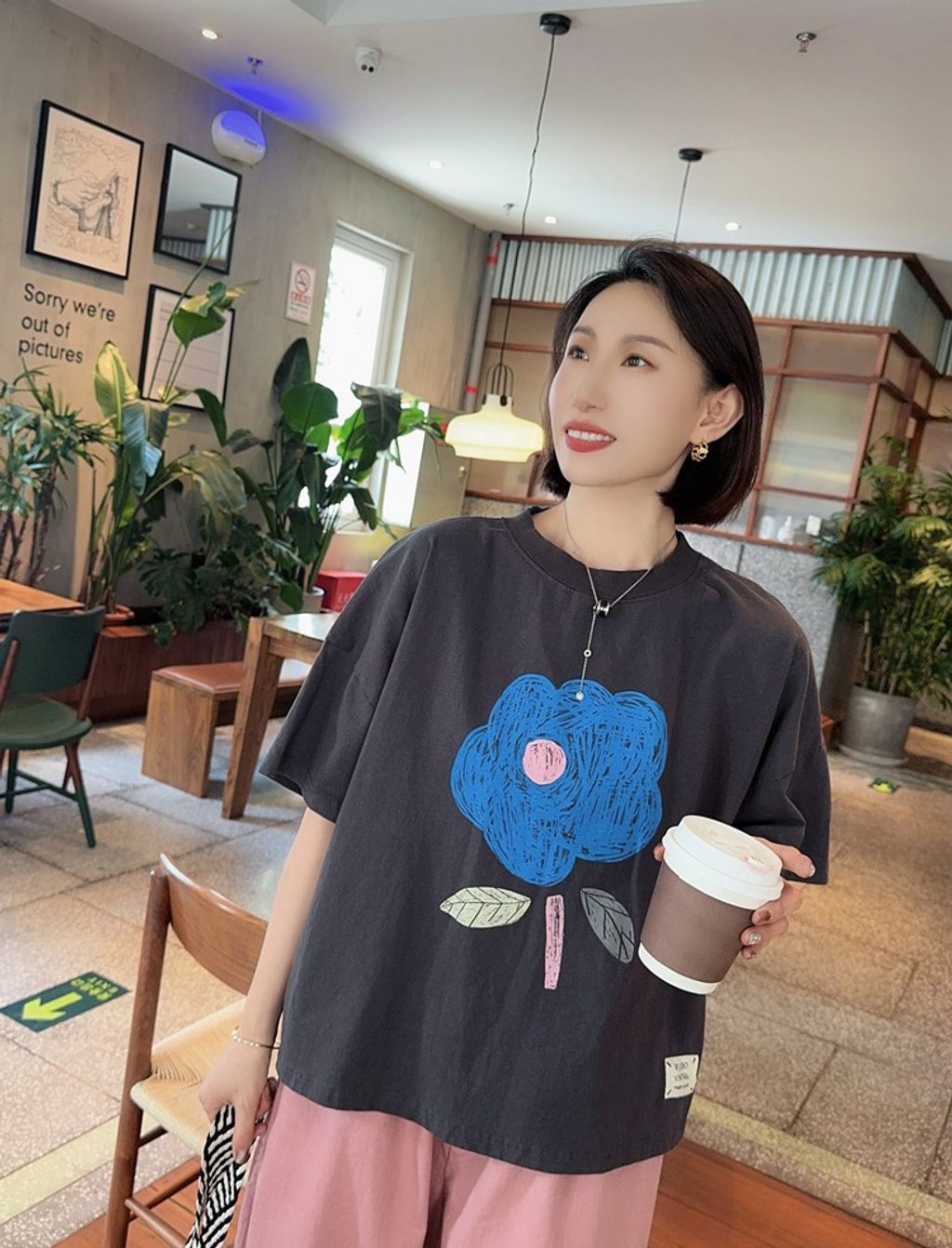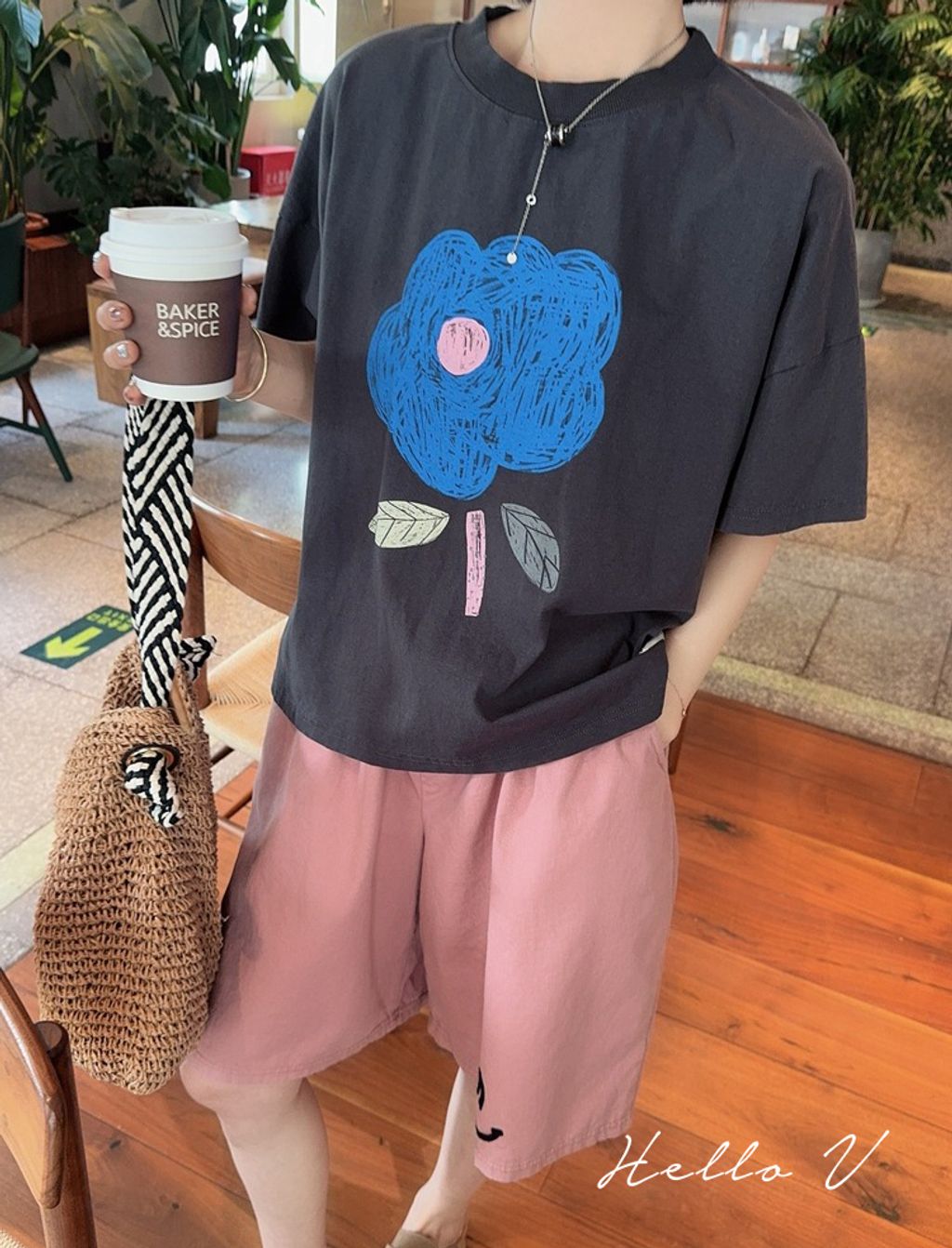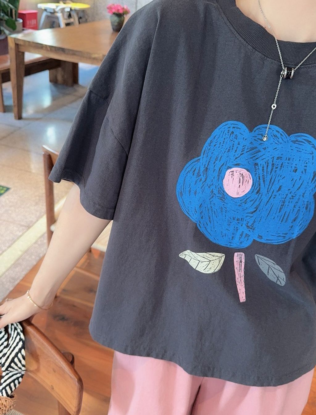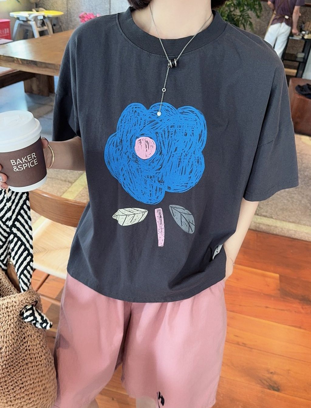 正韓 俏皮亮眼復古花朵寬鬆質感短T*深灰*【N0731-159】