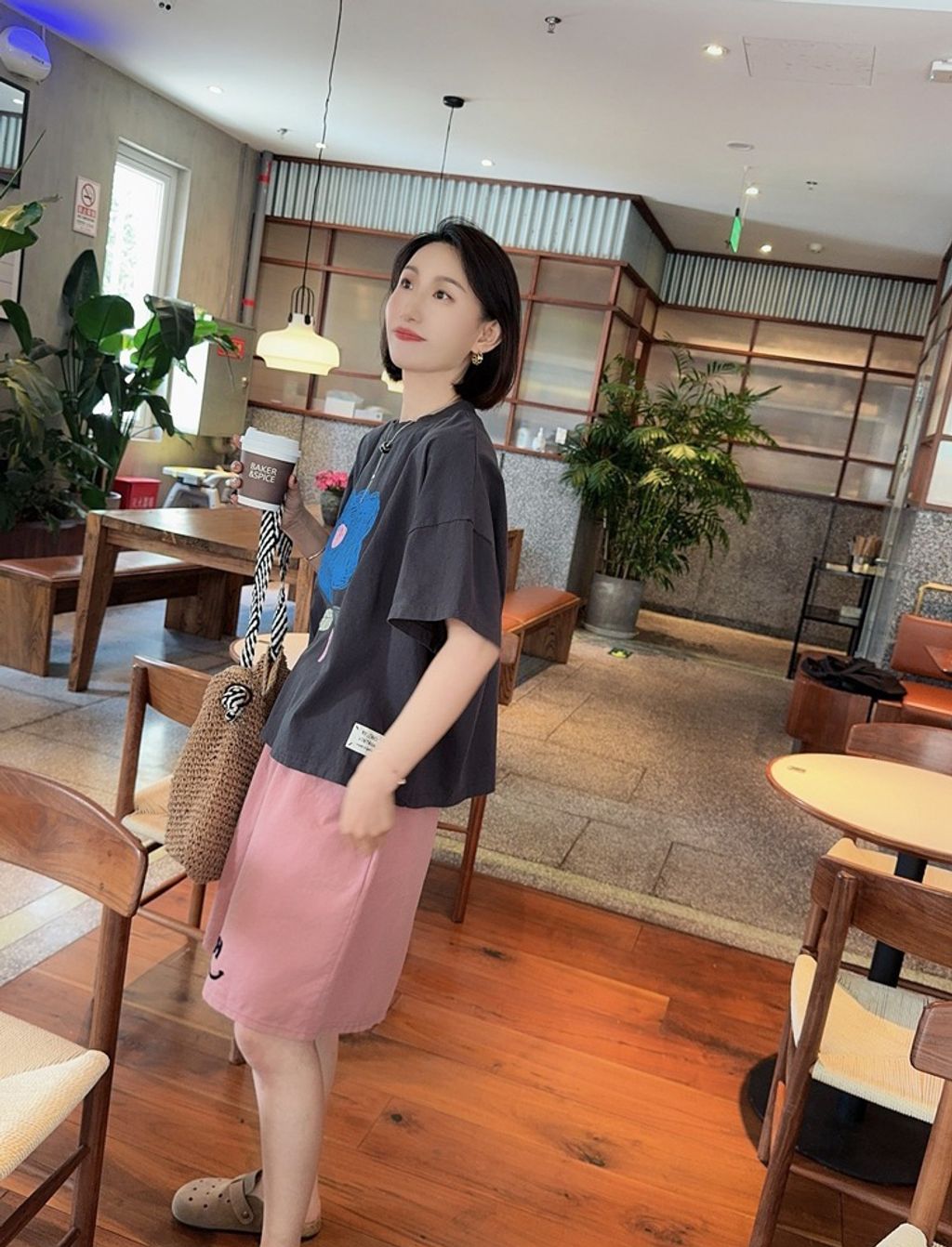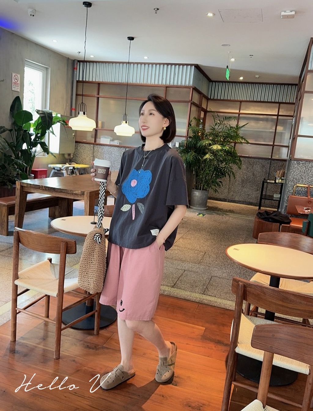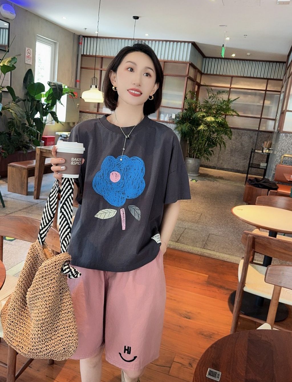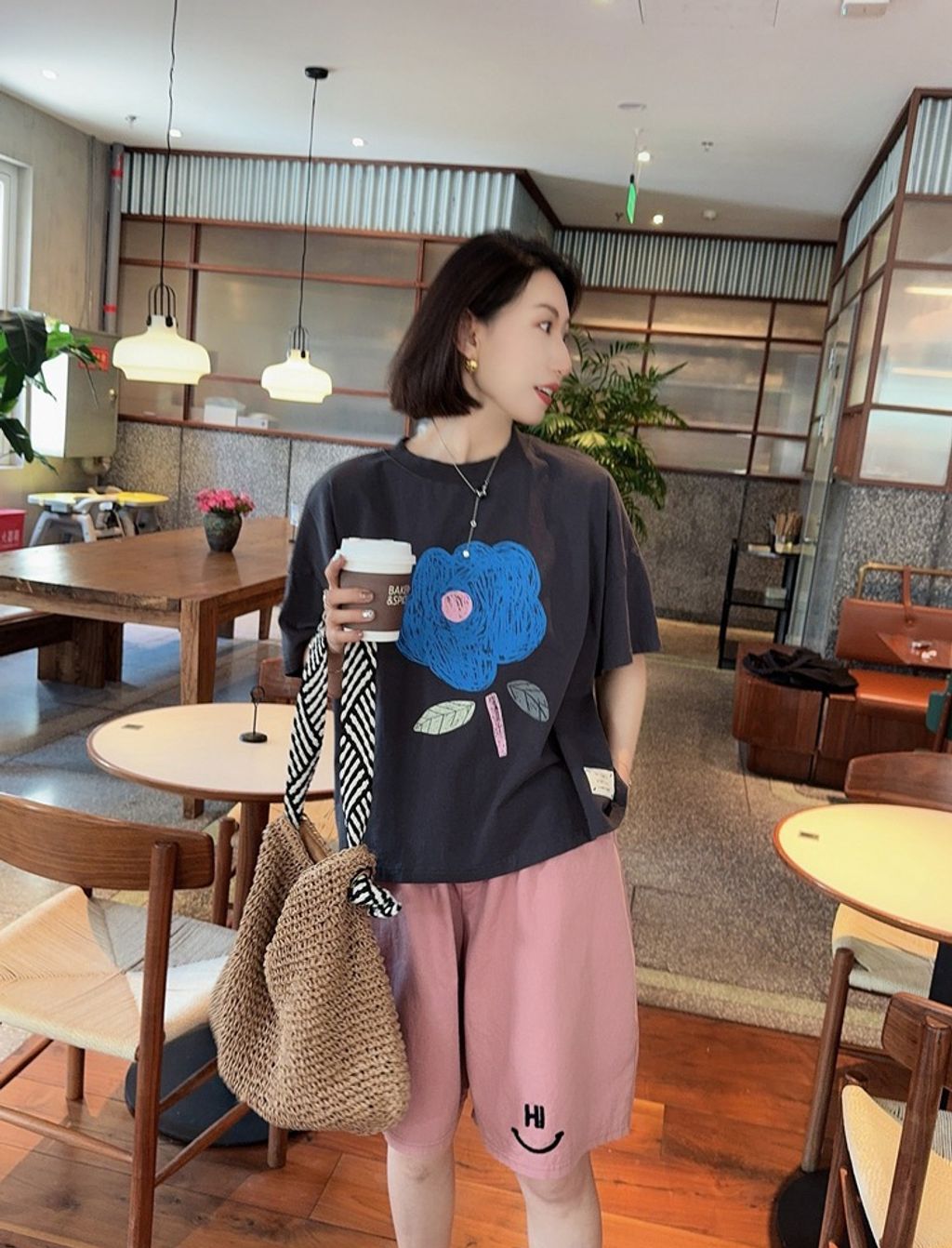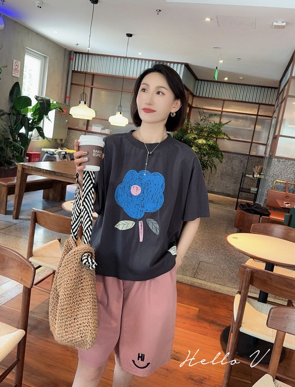 正韓 俏皮亮眼復古花朵寬鬆質感短T*深灰*【N0731-159】
