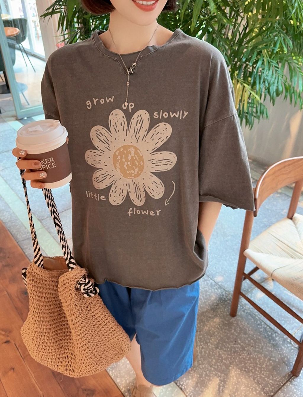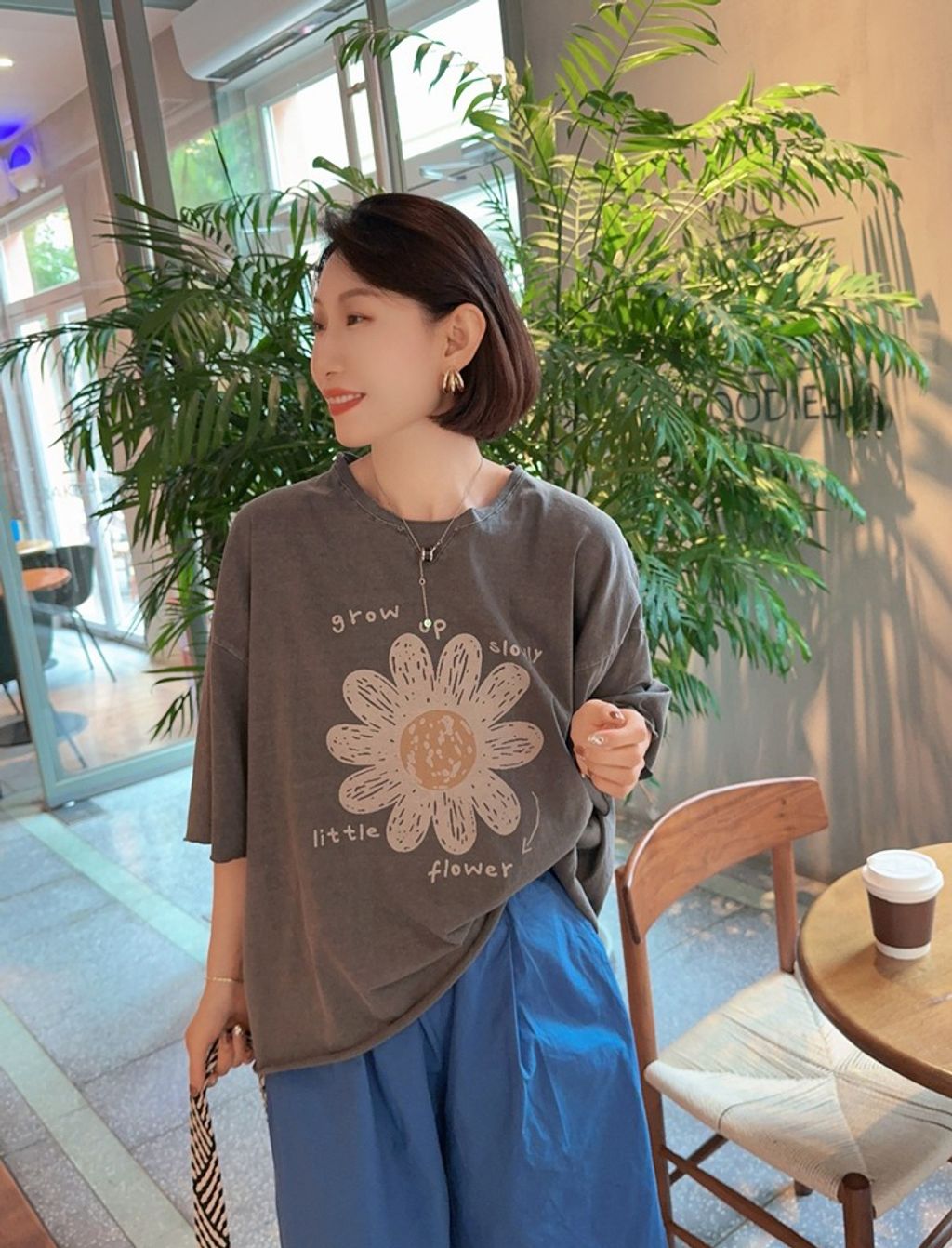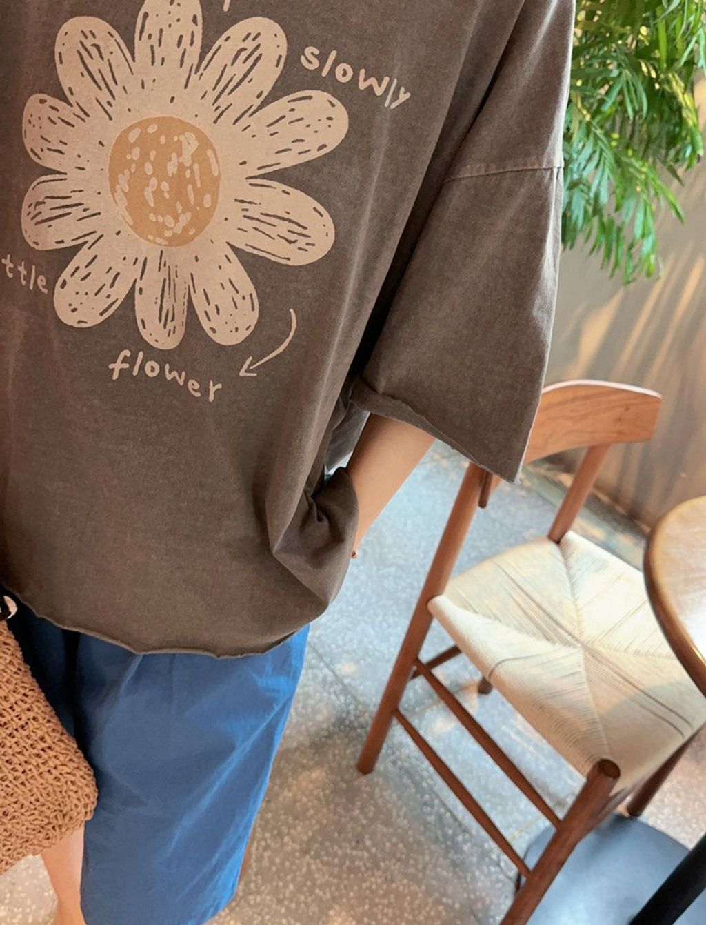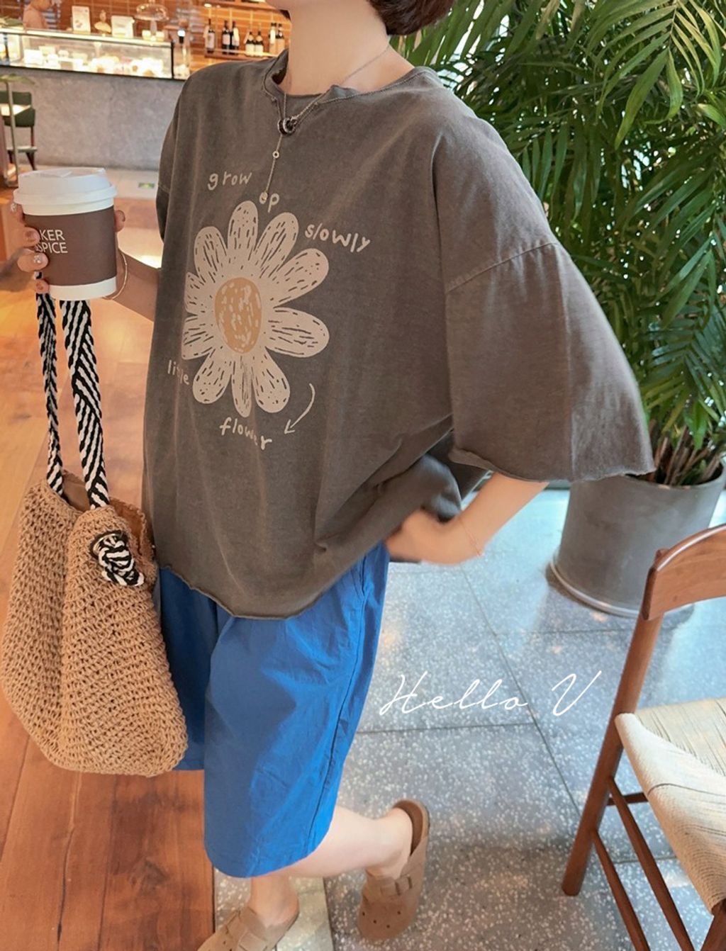 正韓 復古亮眼小雛菊寬鬆短T*灰*【N0731-77】