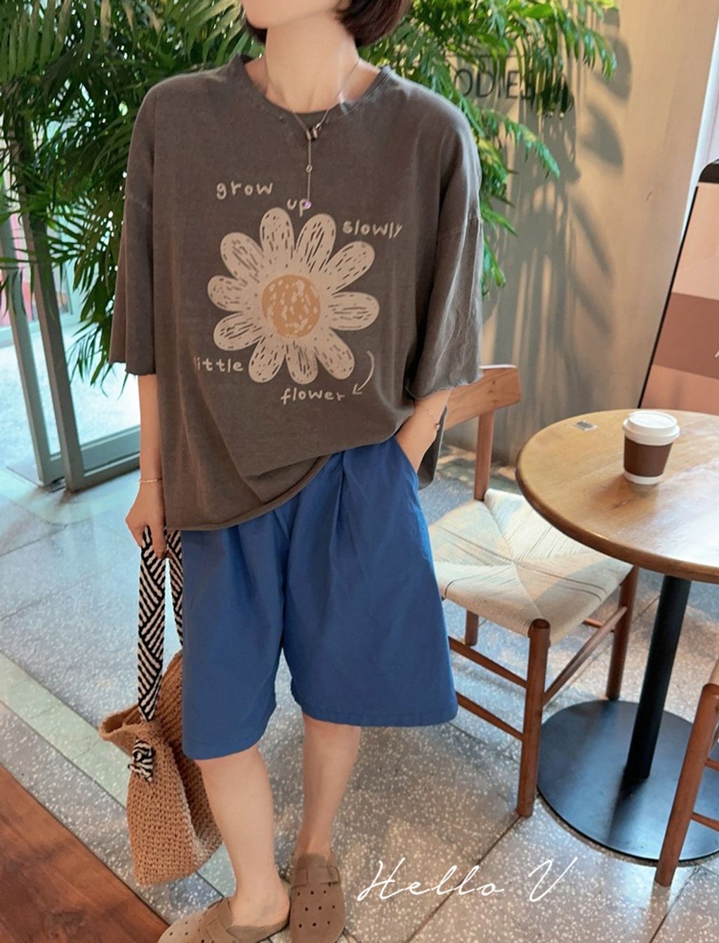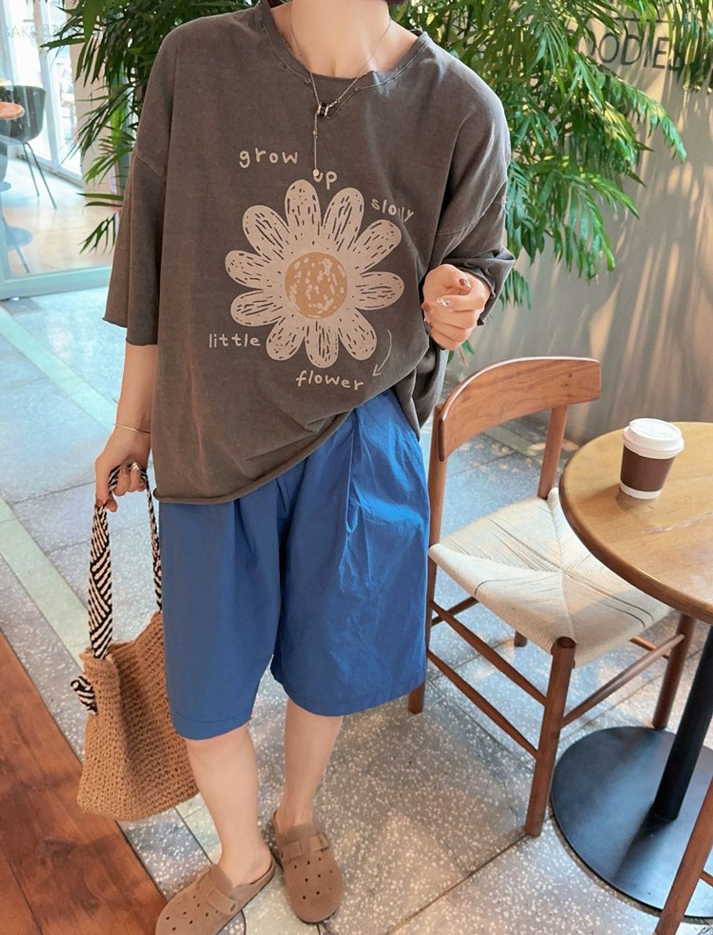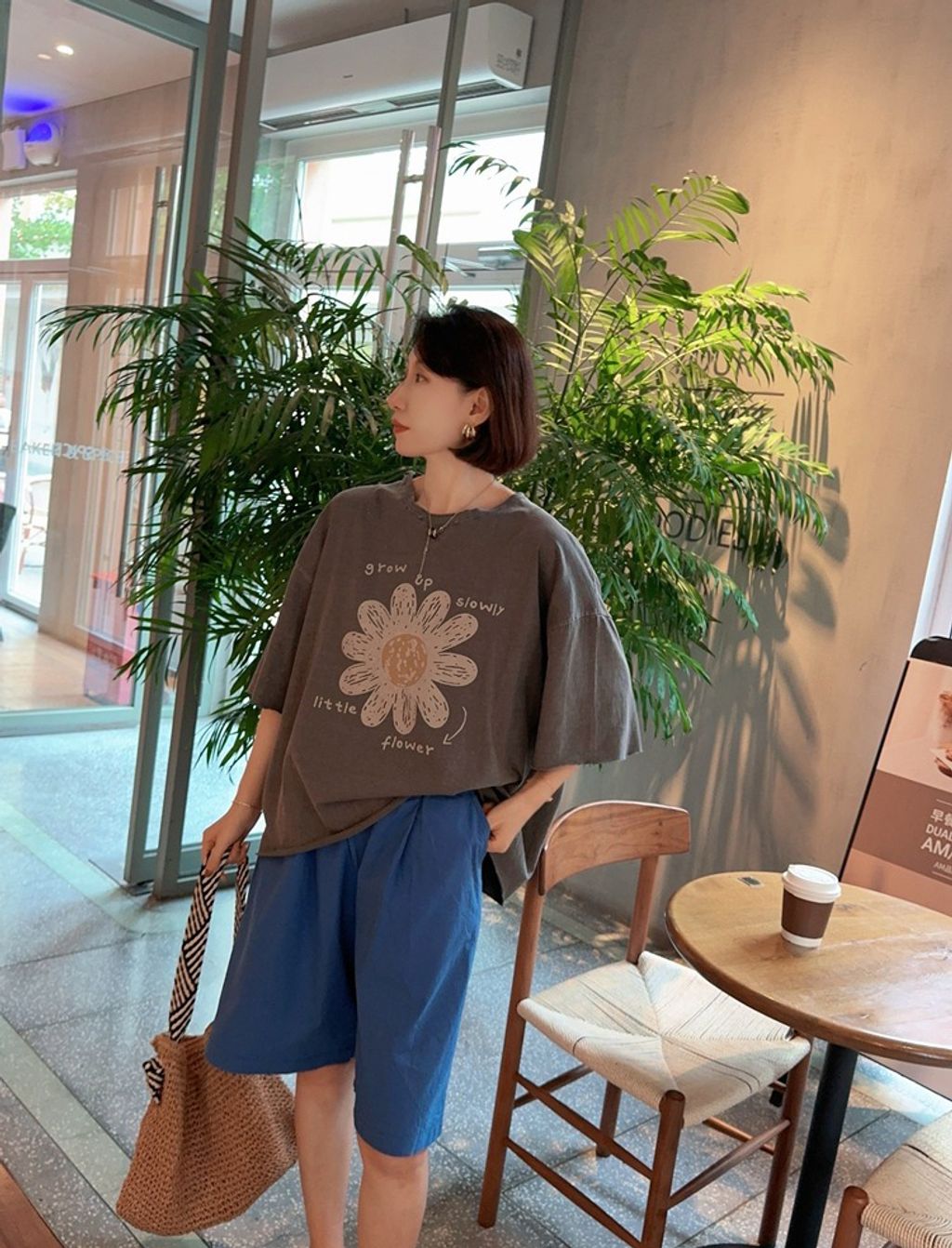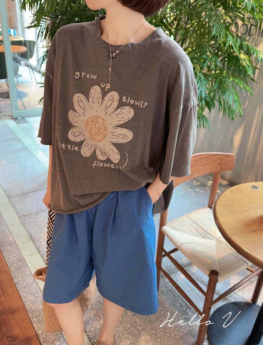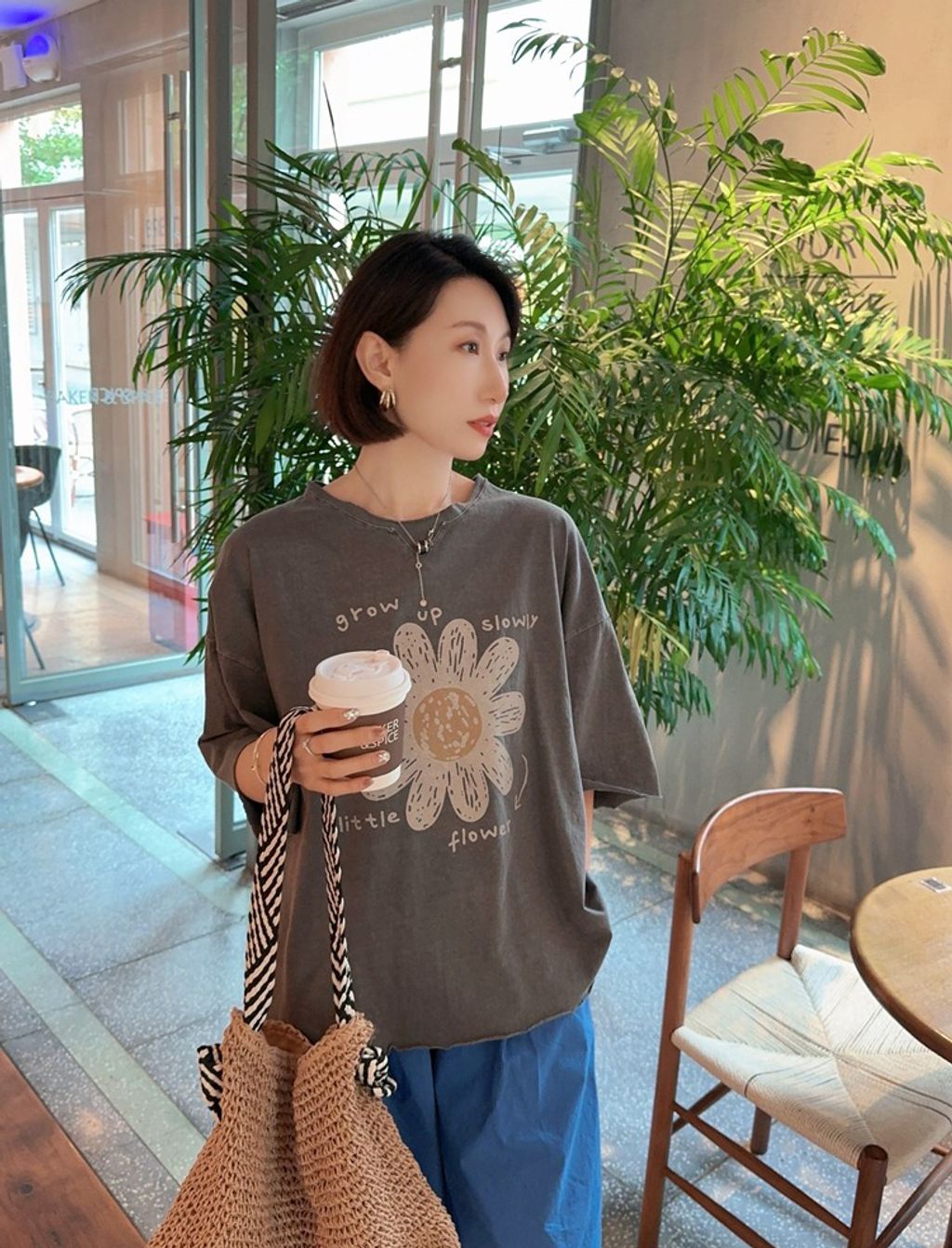 正韓 復古亮眼小雛菊寬鬆短T*灰*【N0731-77】