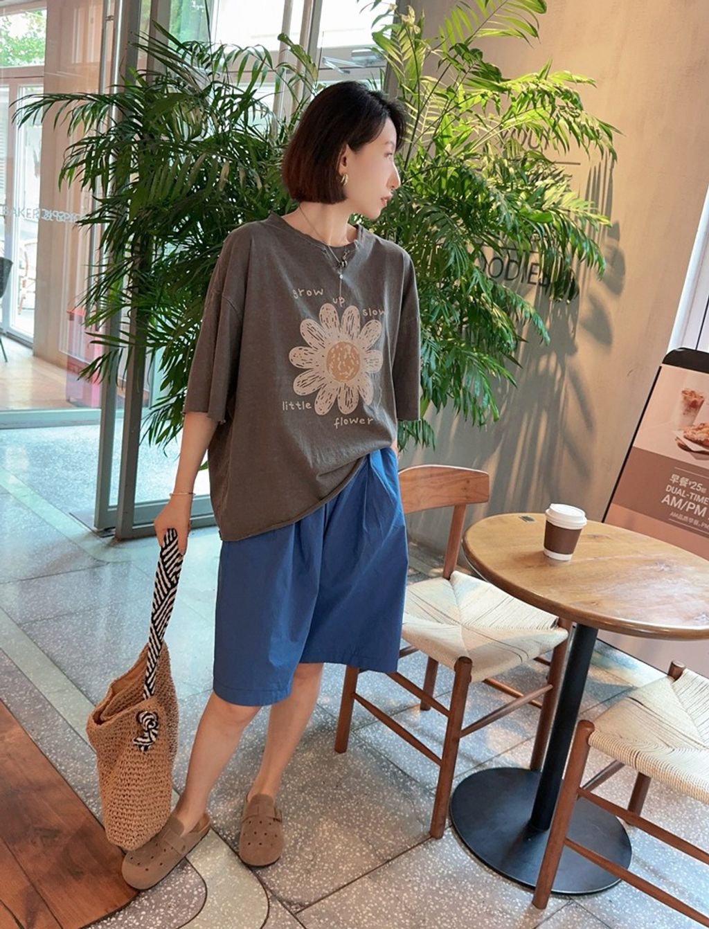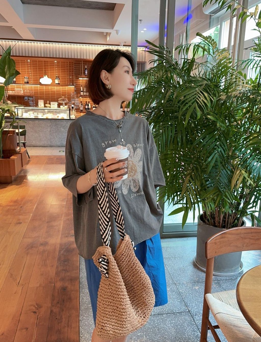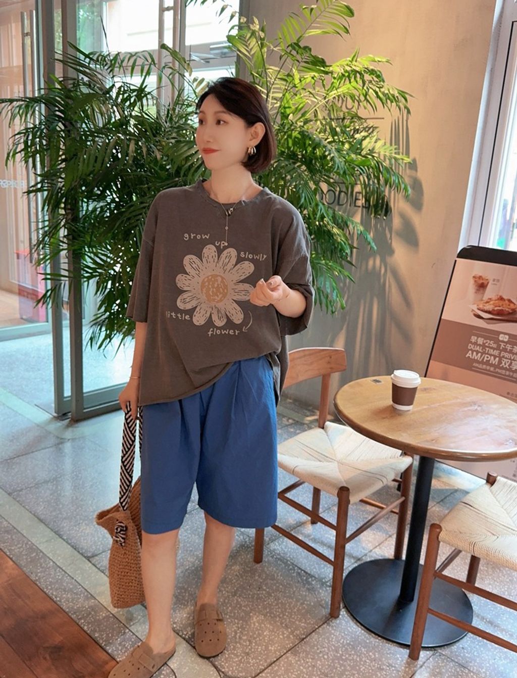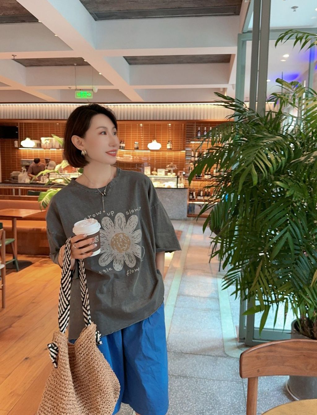 正韓 復古亮眼小雛菊寬鬆短T*灰*【N0731-77】