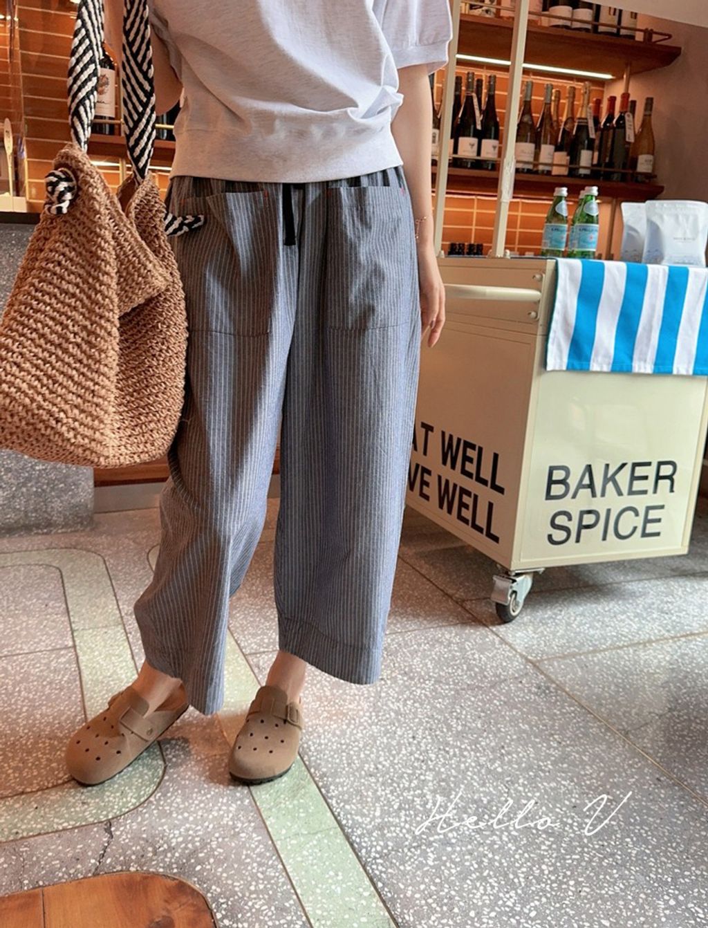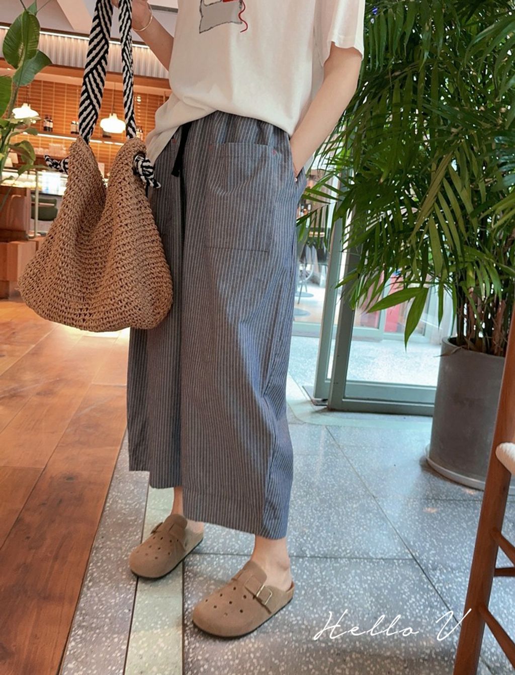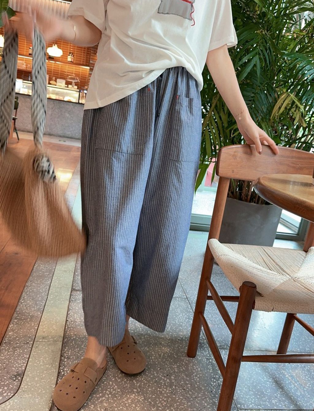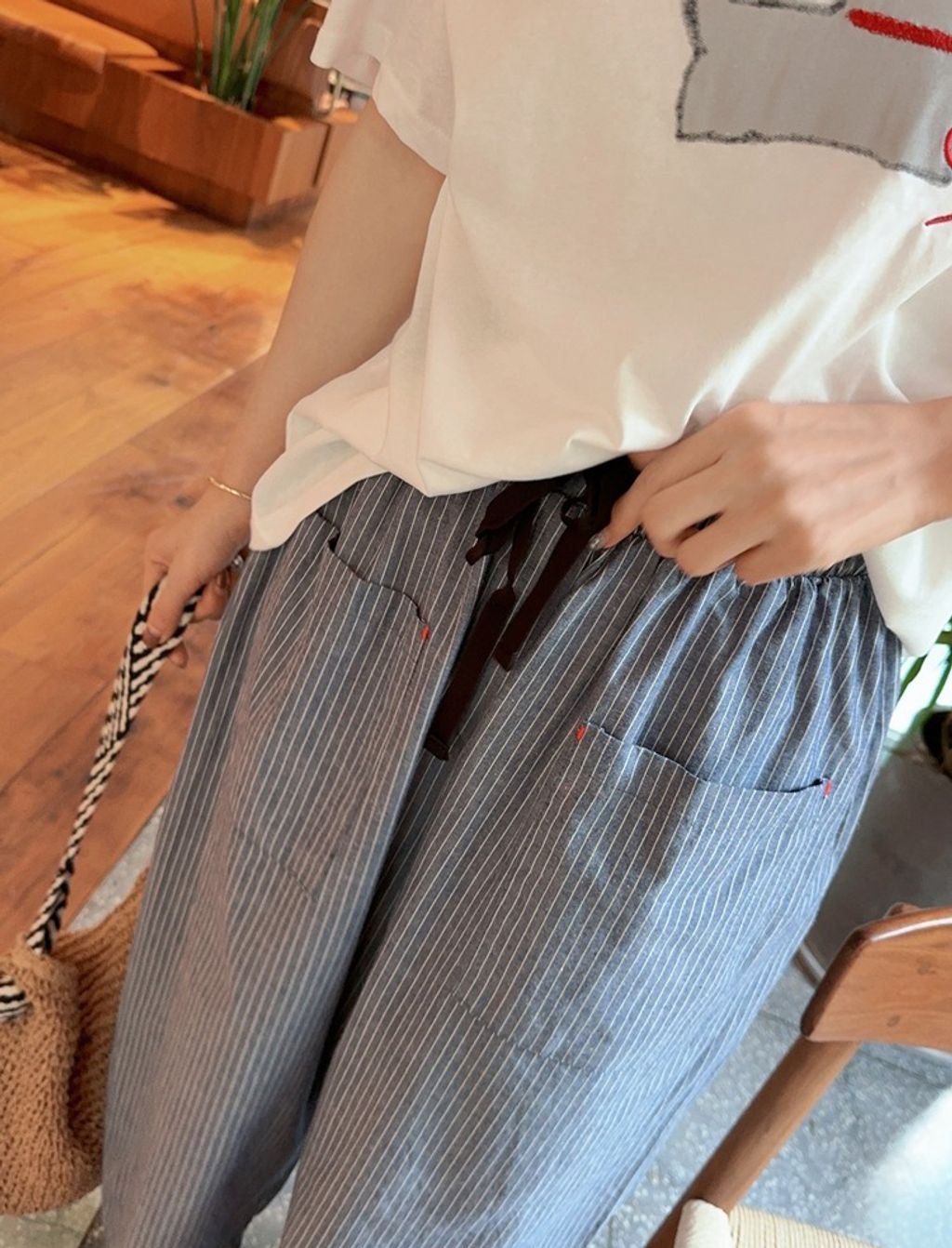 正韓 日系清新風格直條紋寬鬆感休閒褲*灰藍*【N0731-75】