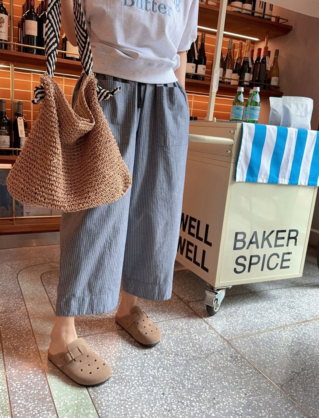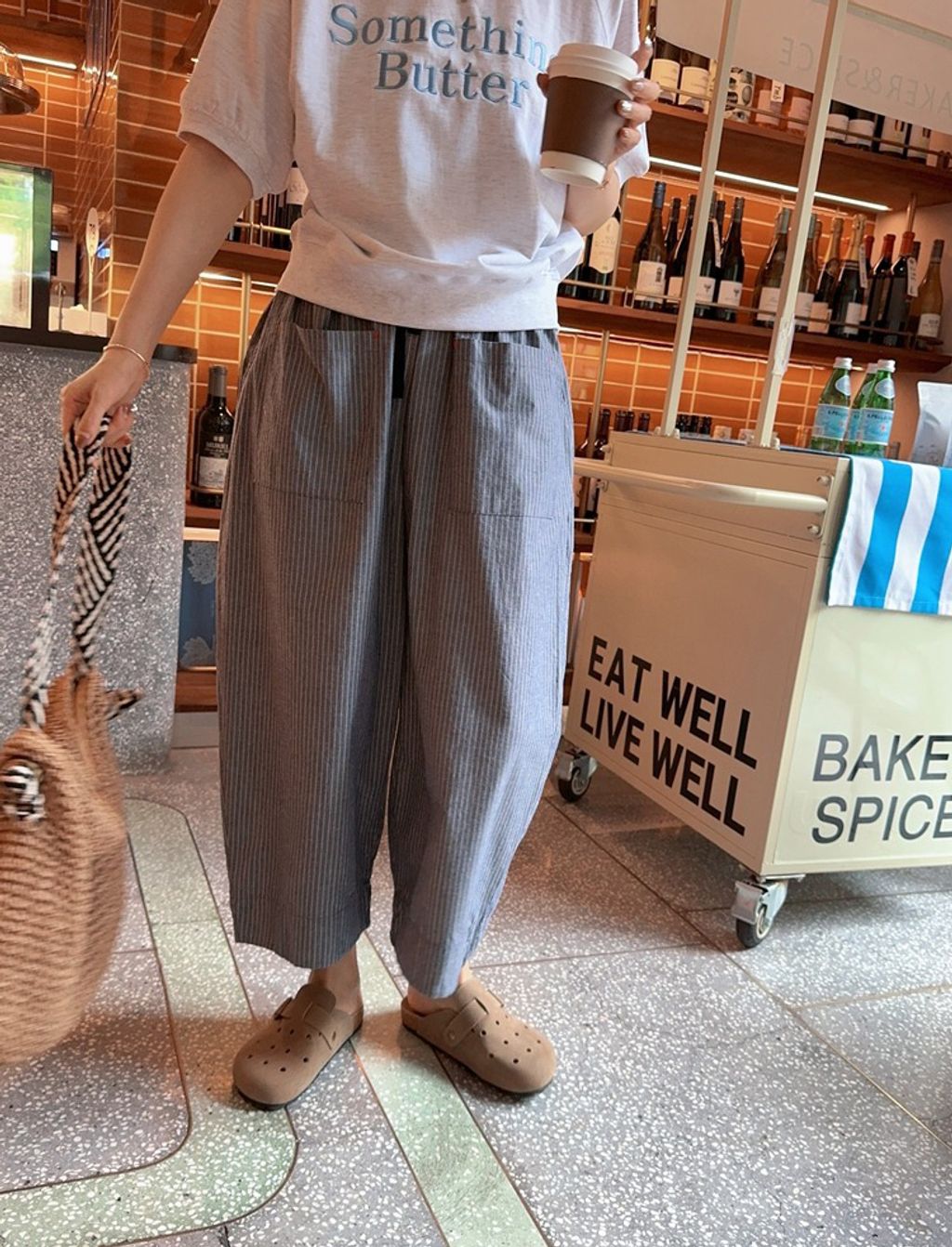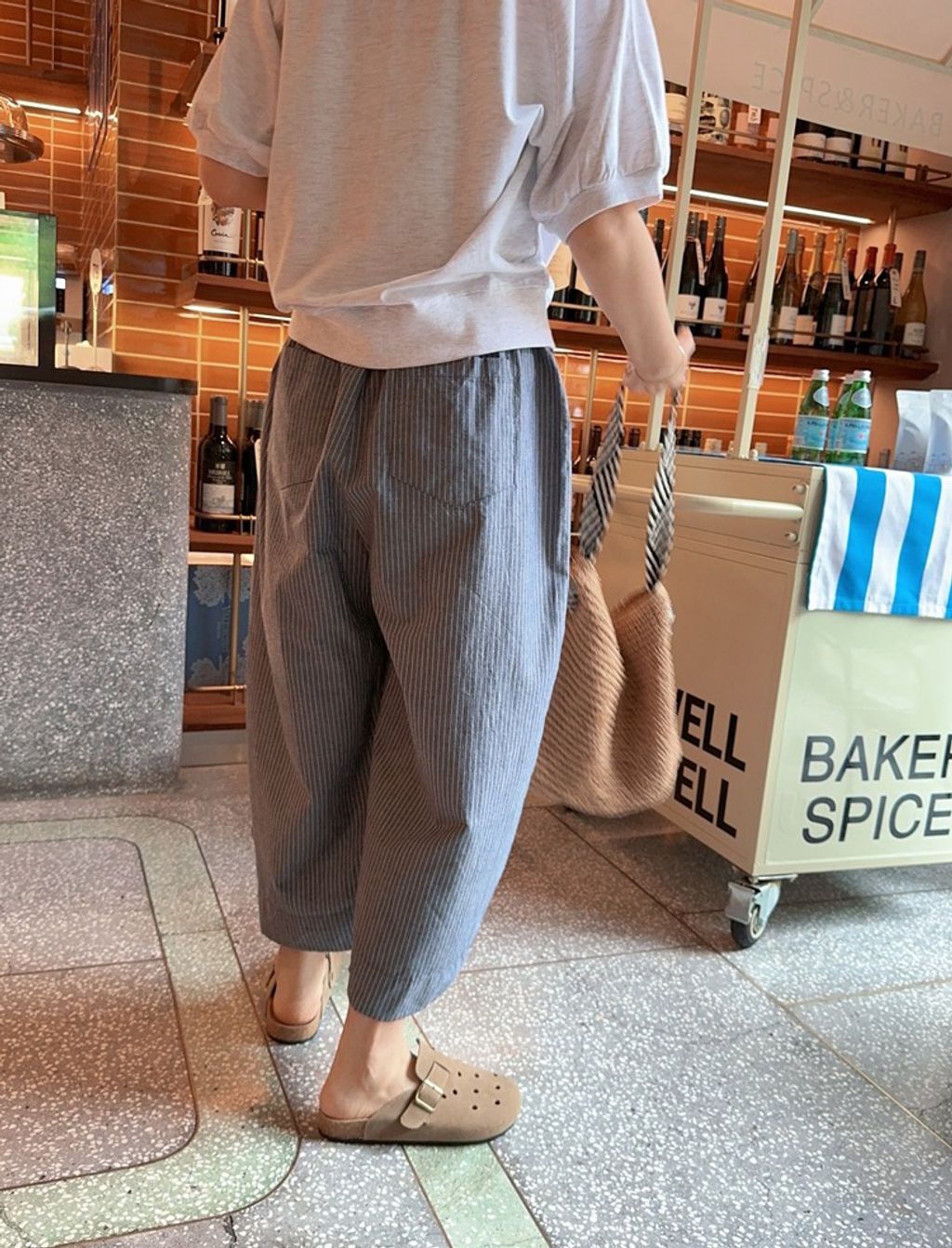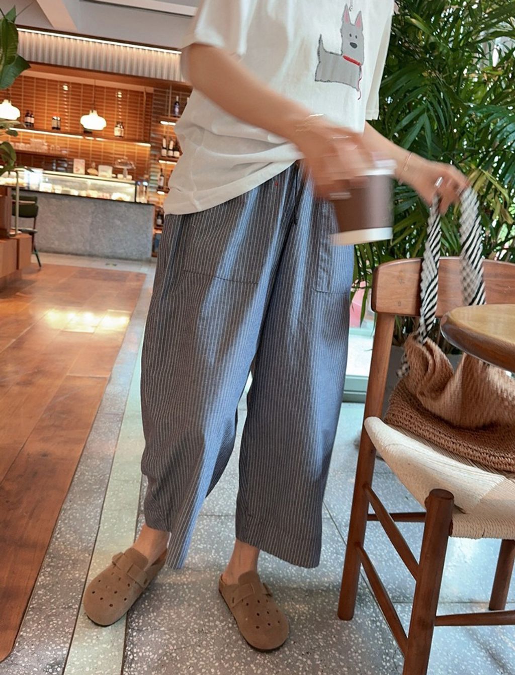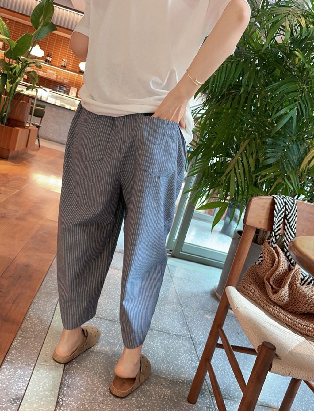 正韓 日系清新風格直條紋寬鬆感休閒褲*灰藍*【N0731-75】