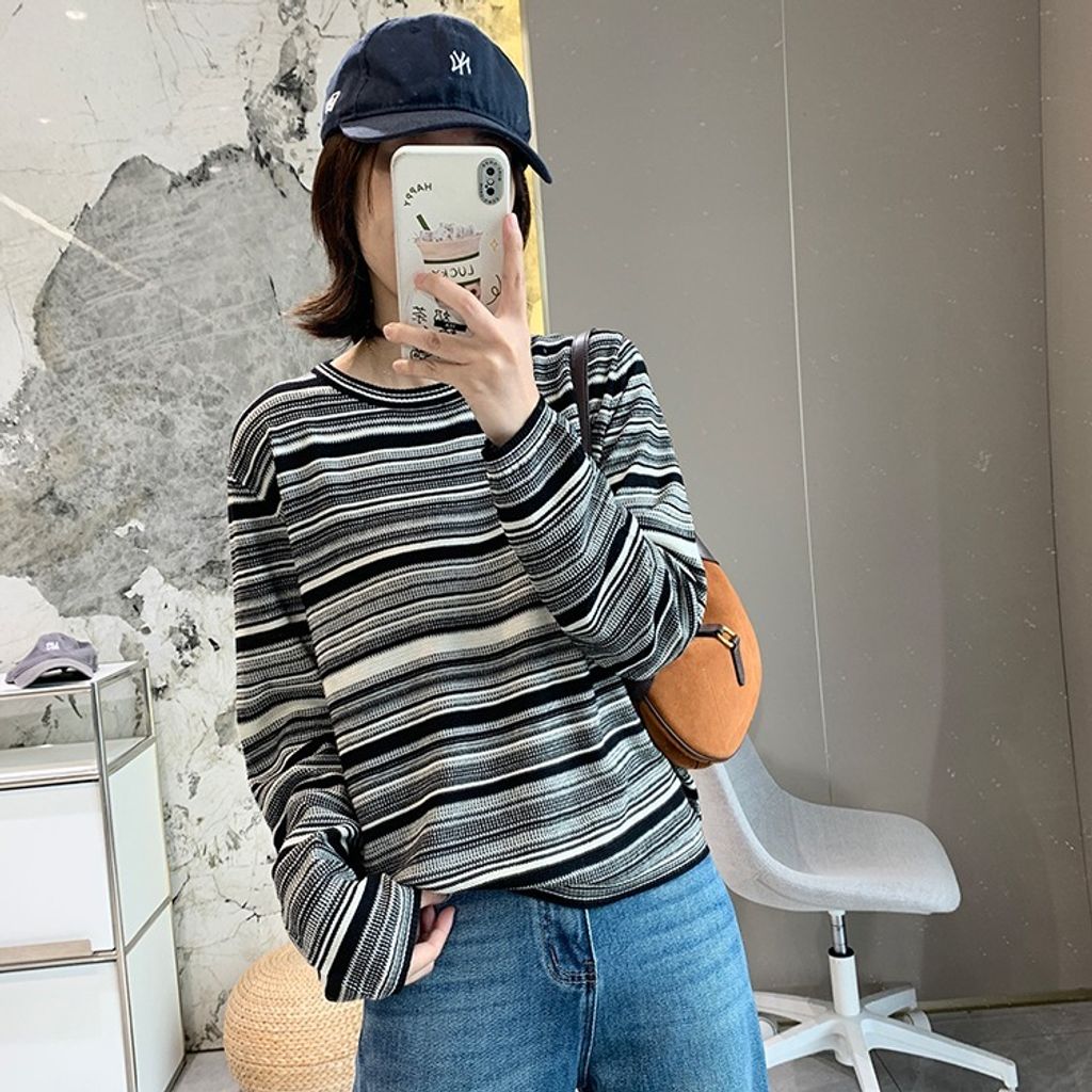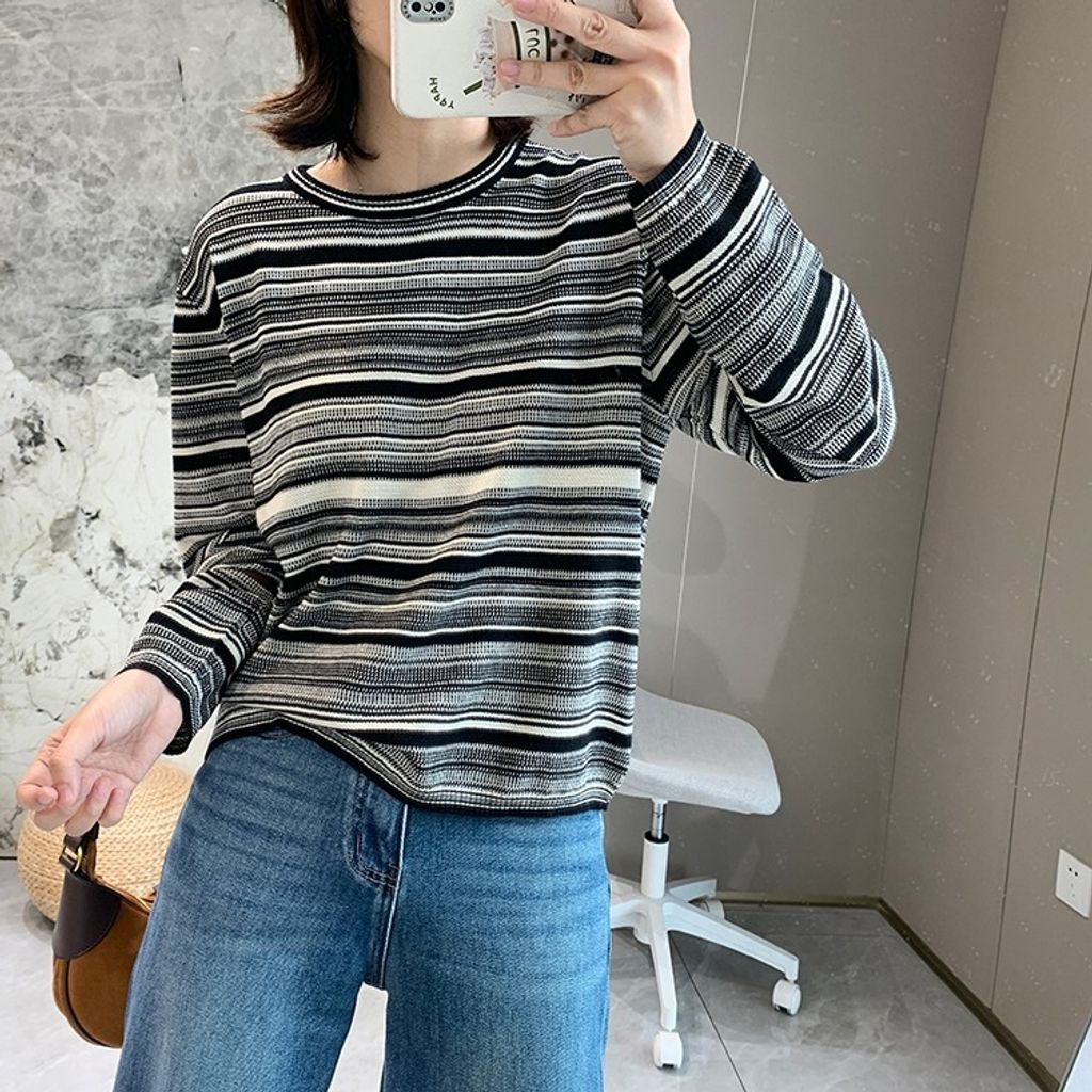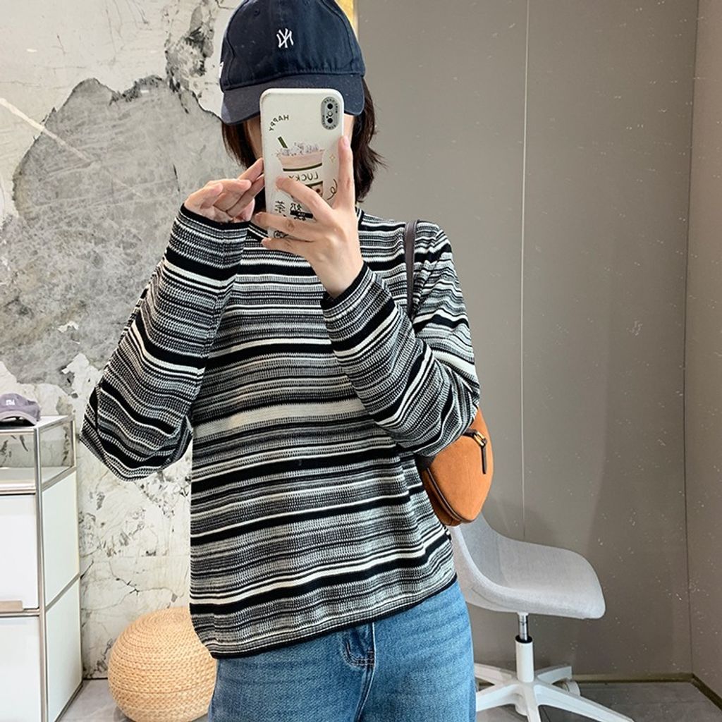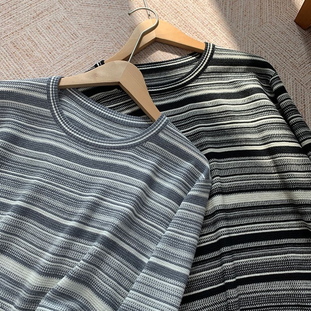 復古氣質撞色條紋柔軟長T *灰黑*【P0812-09】