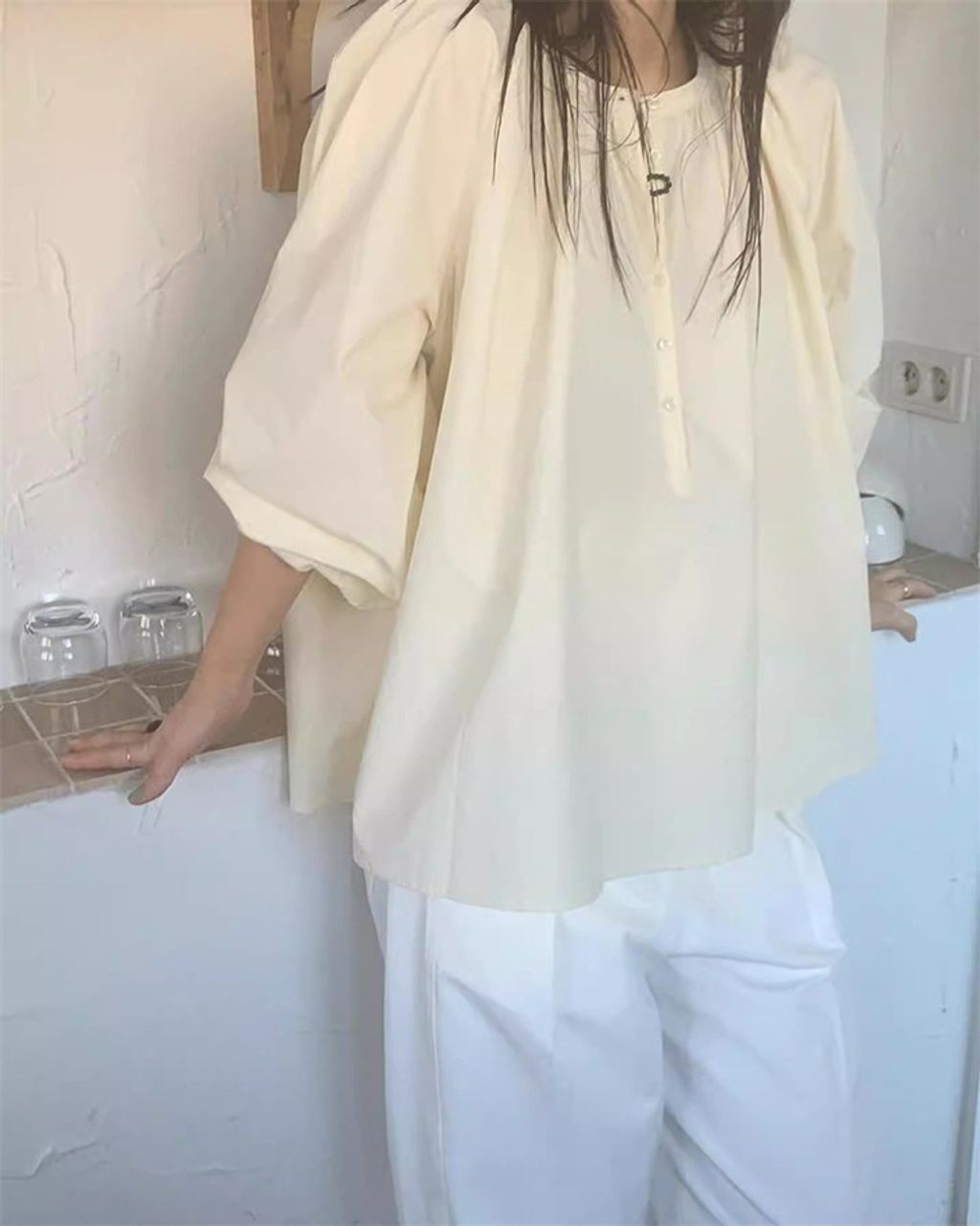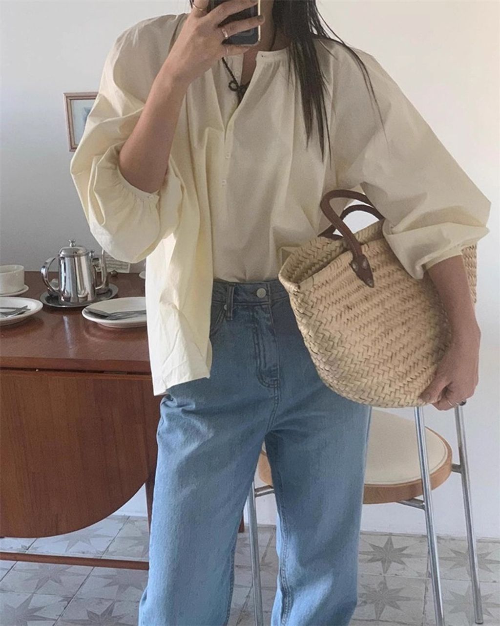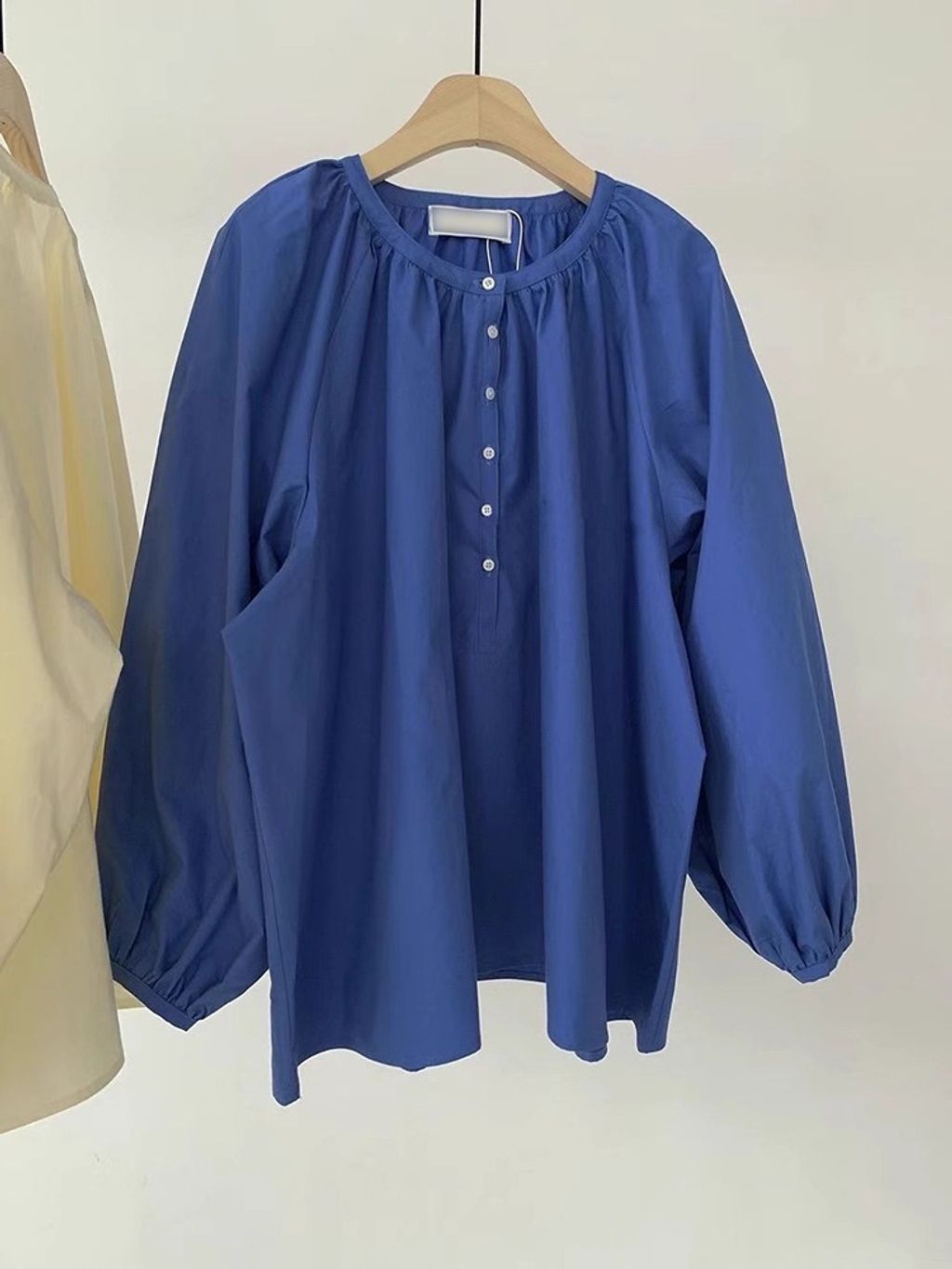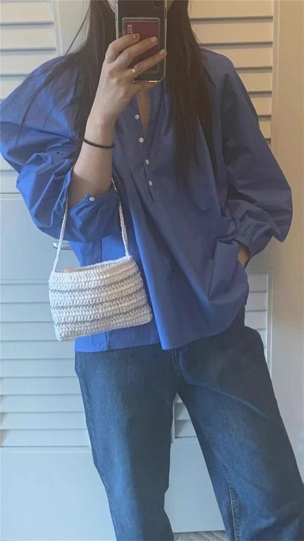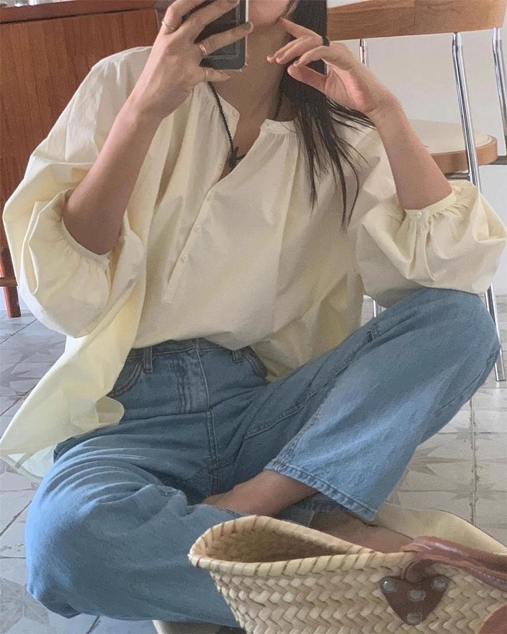 正韓 法式復古蓬袖質感襯衫*藍米*【P0812-56】