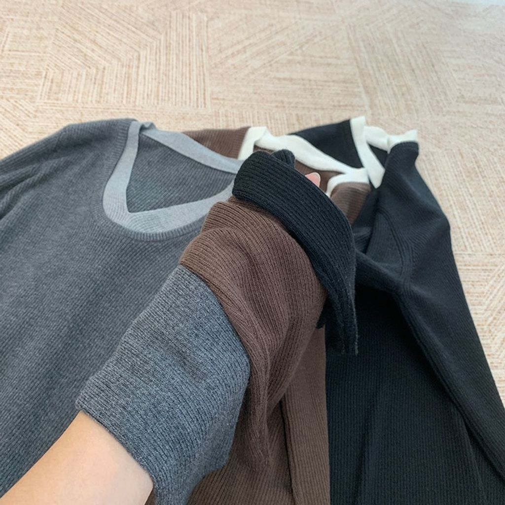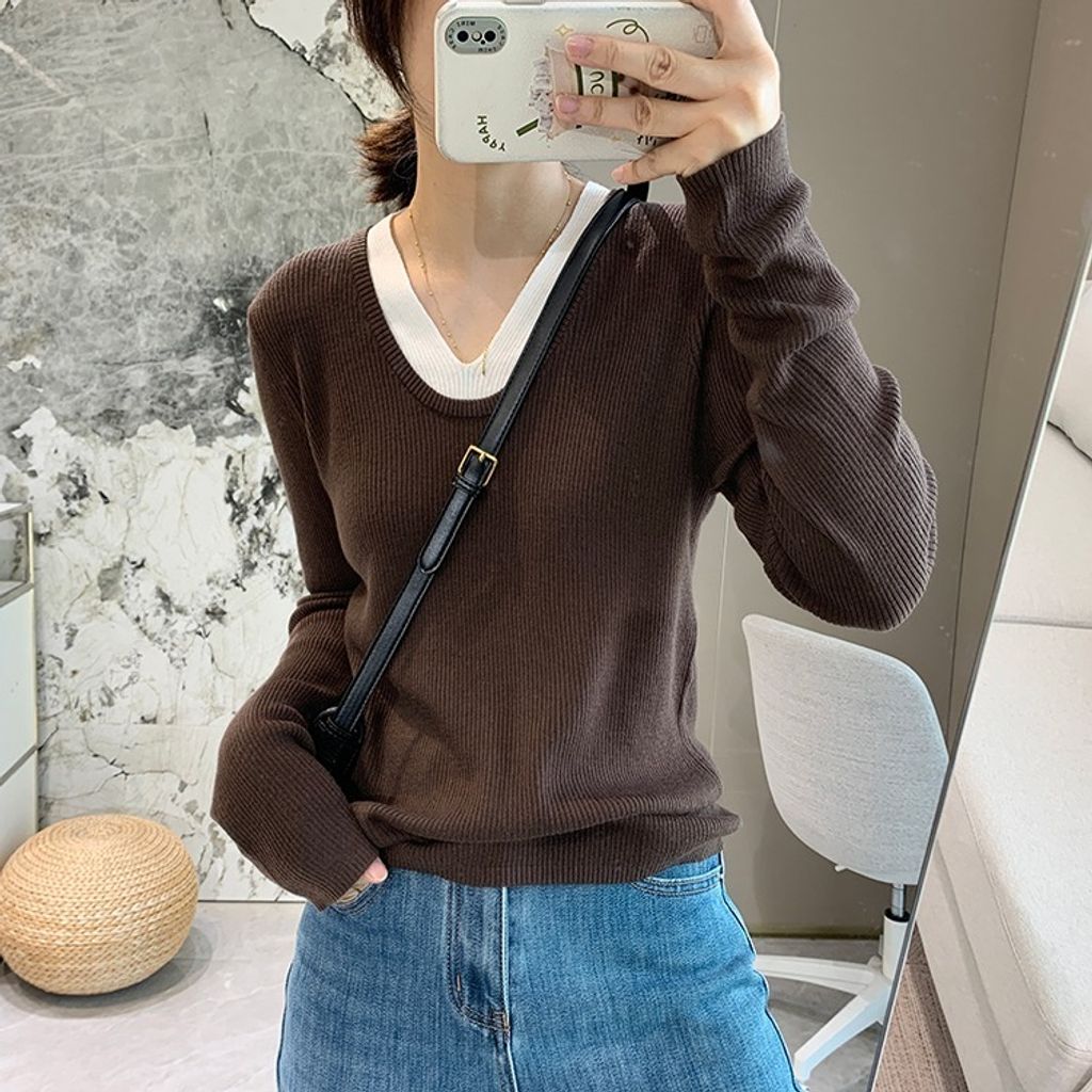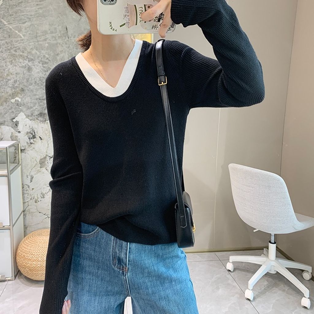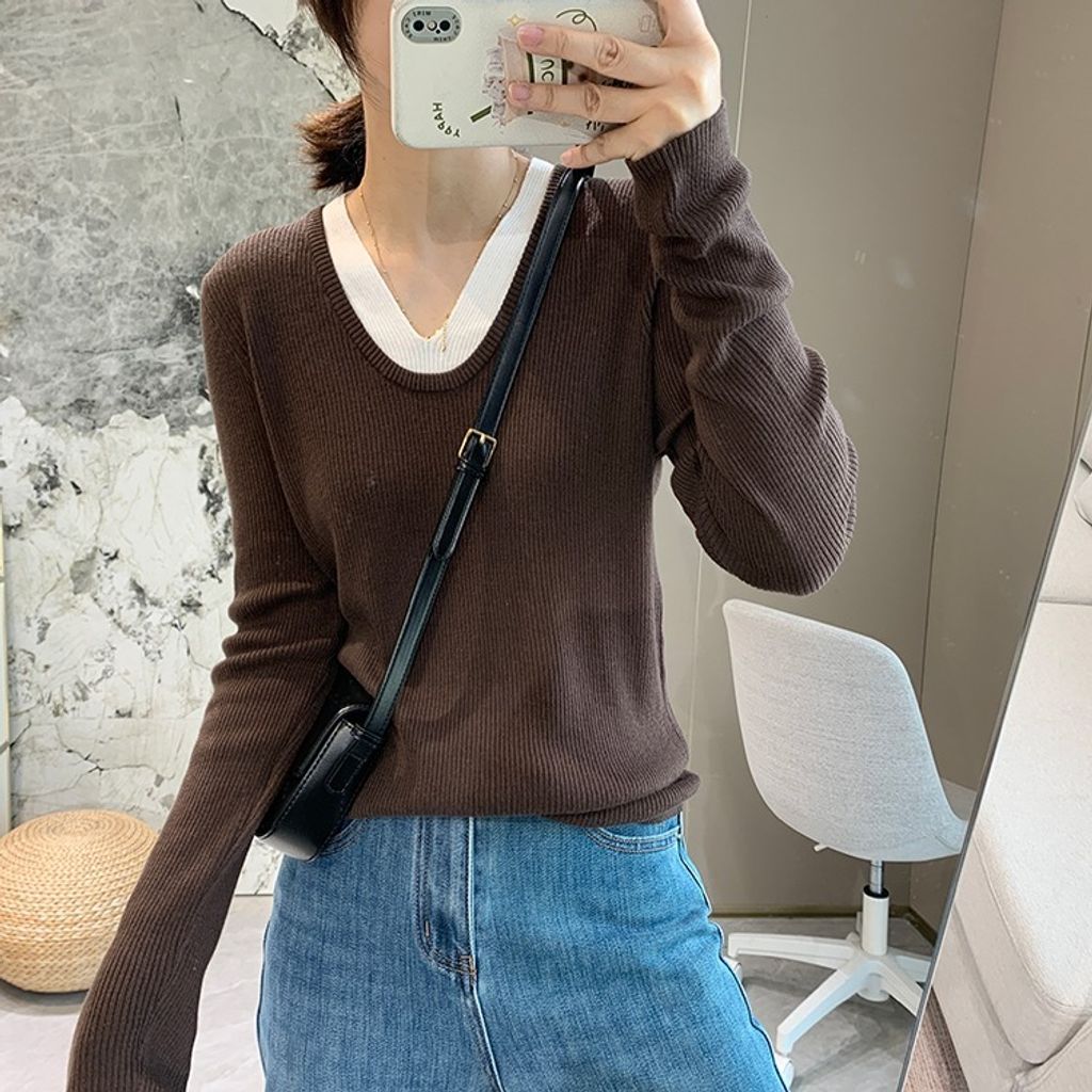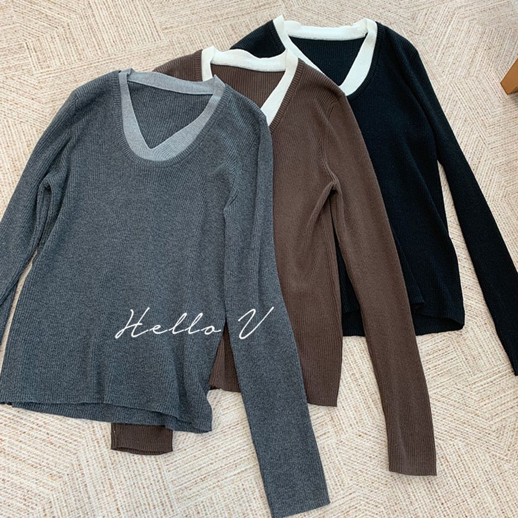 溫柔氣質假兩件V領拼接針織上衣*灰咖黑*【X0905-63】