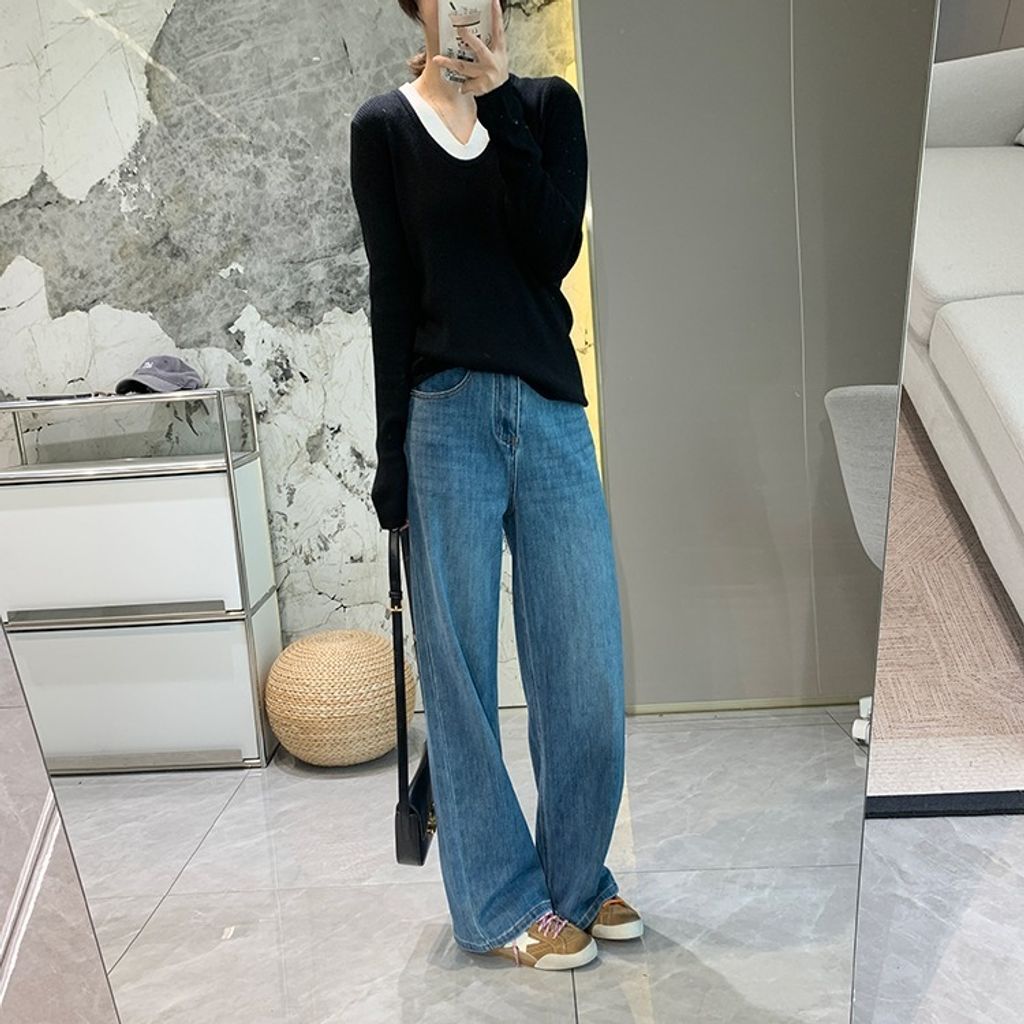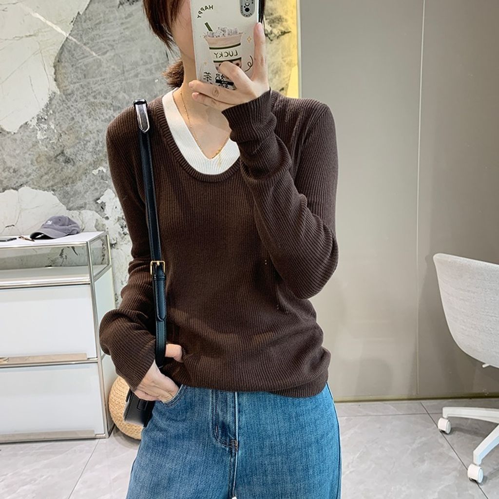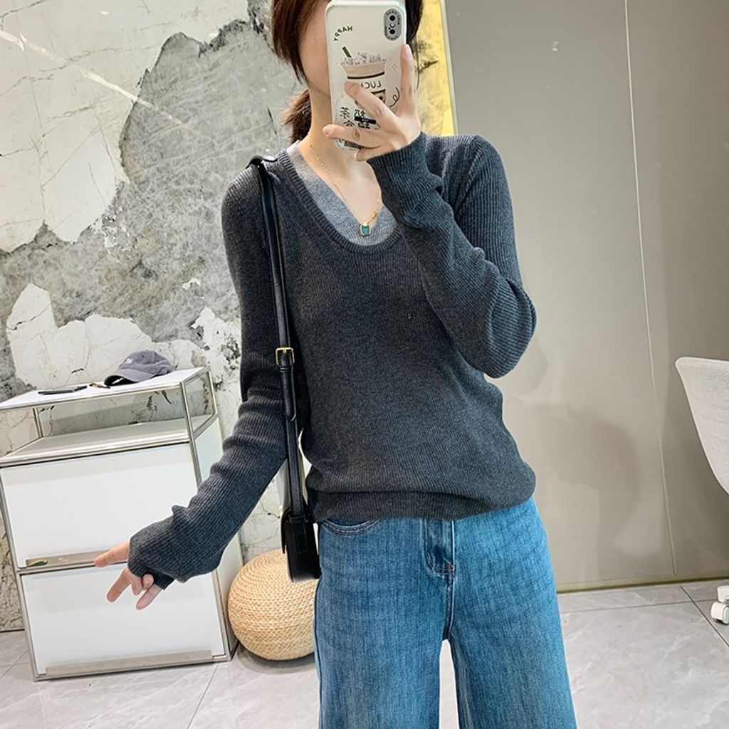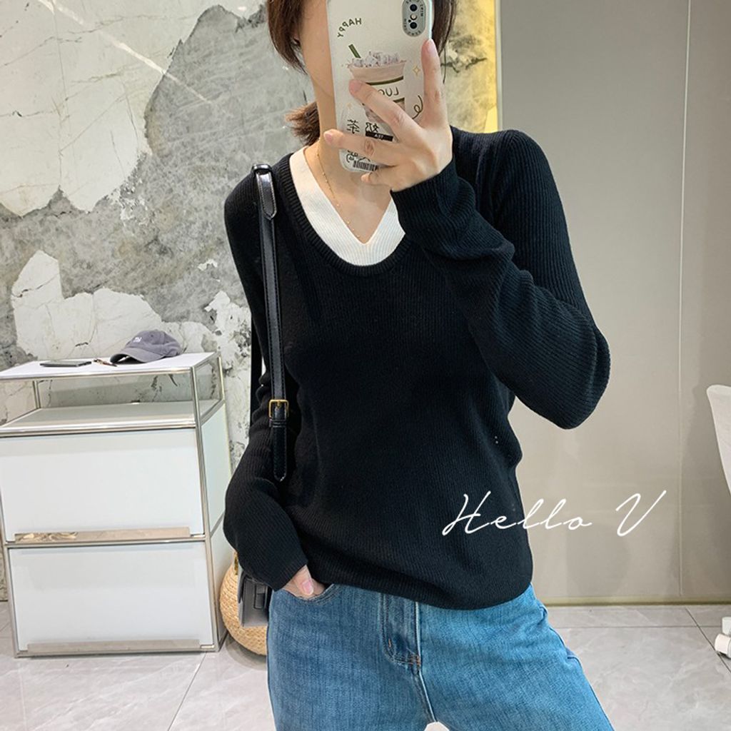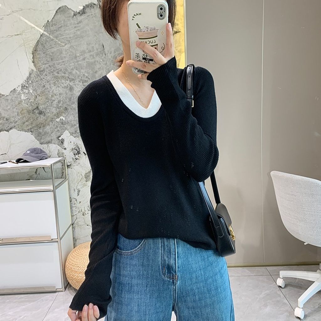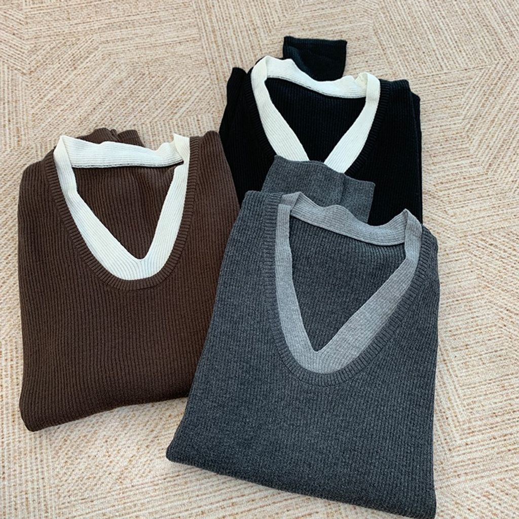 溫柔氣質假兩件V領拼接針織上衣*灰咖黑*【X0905-63】