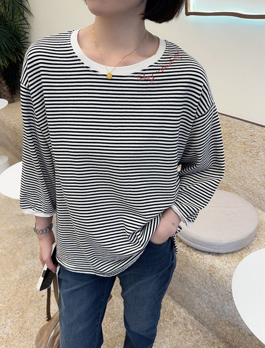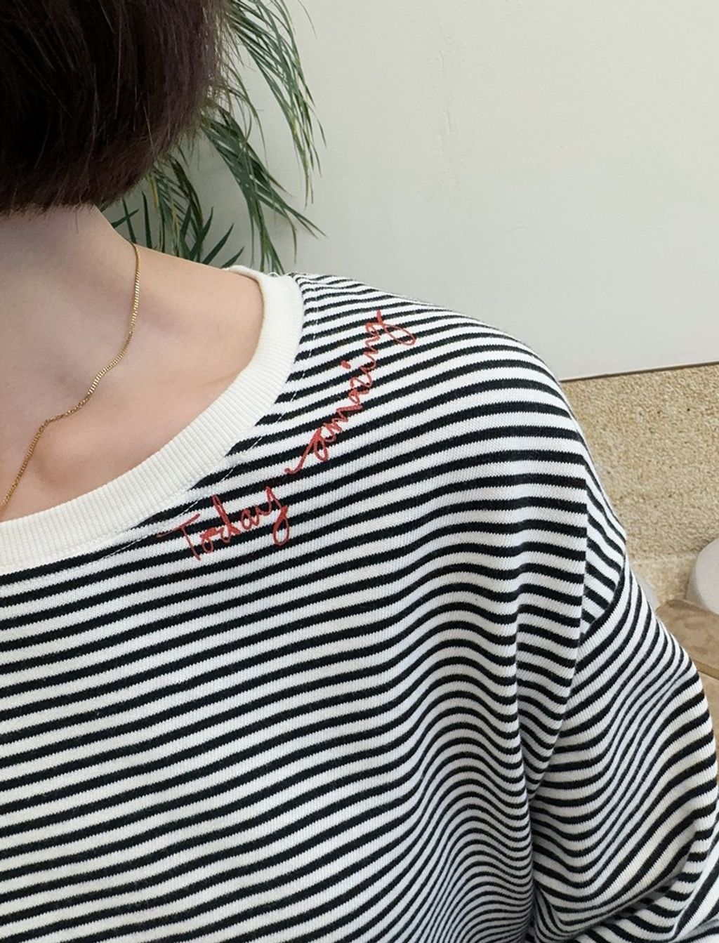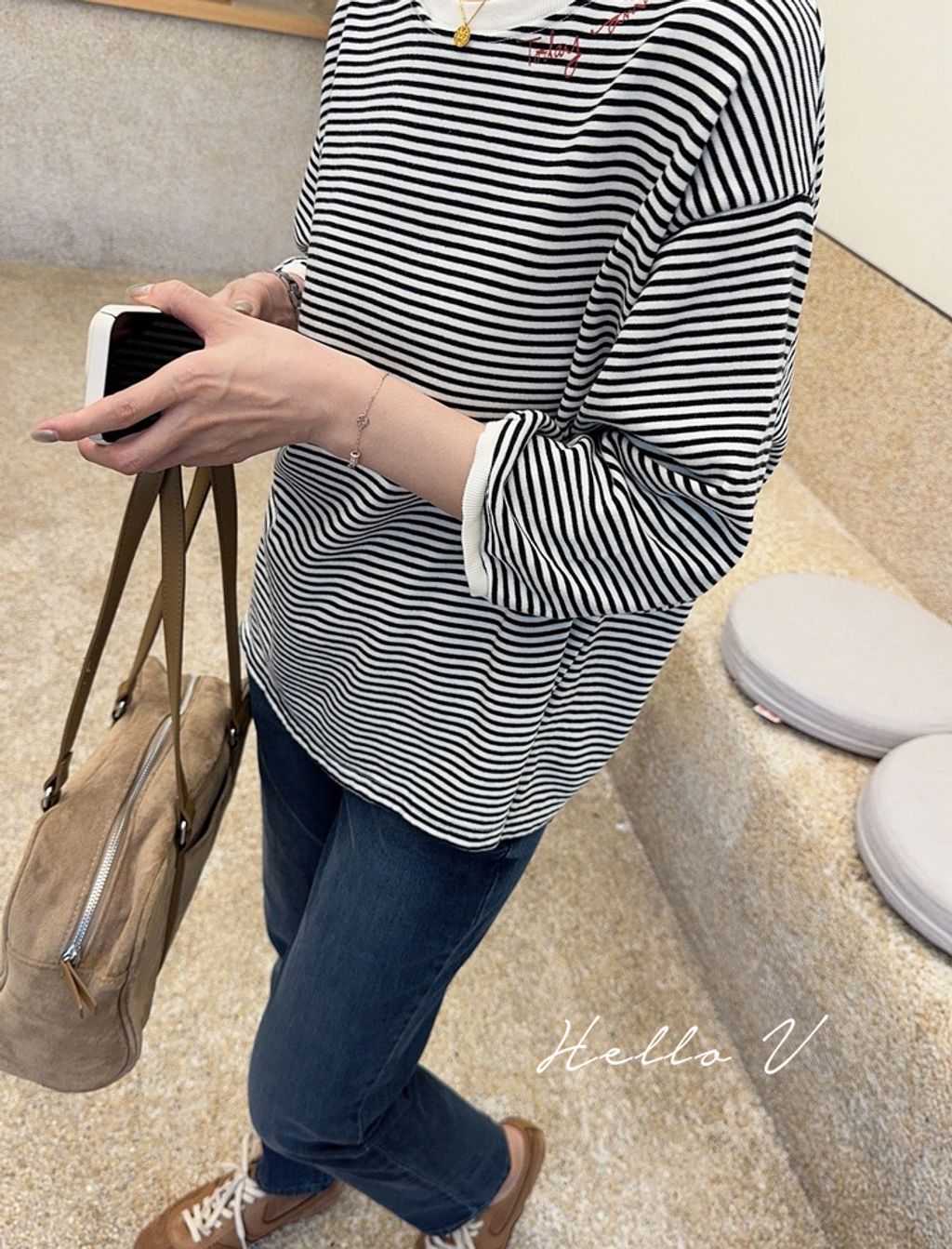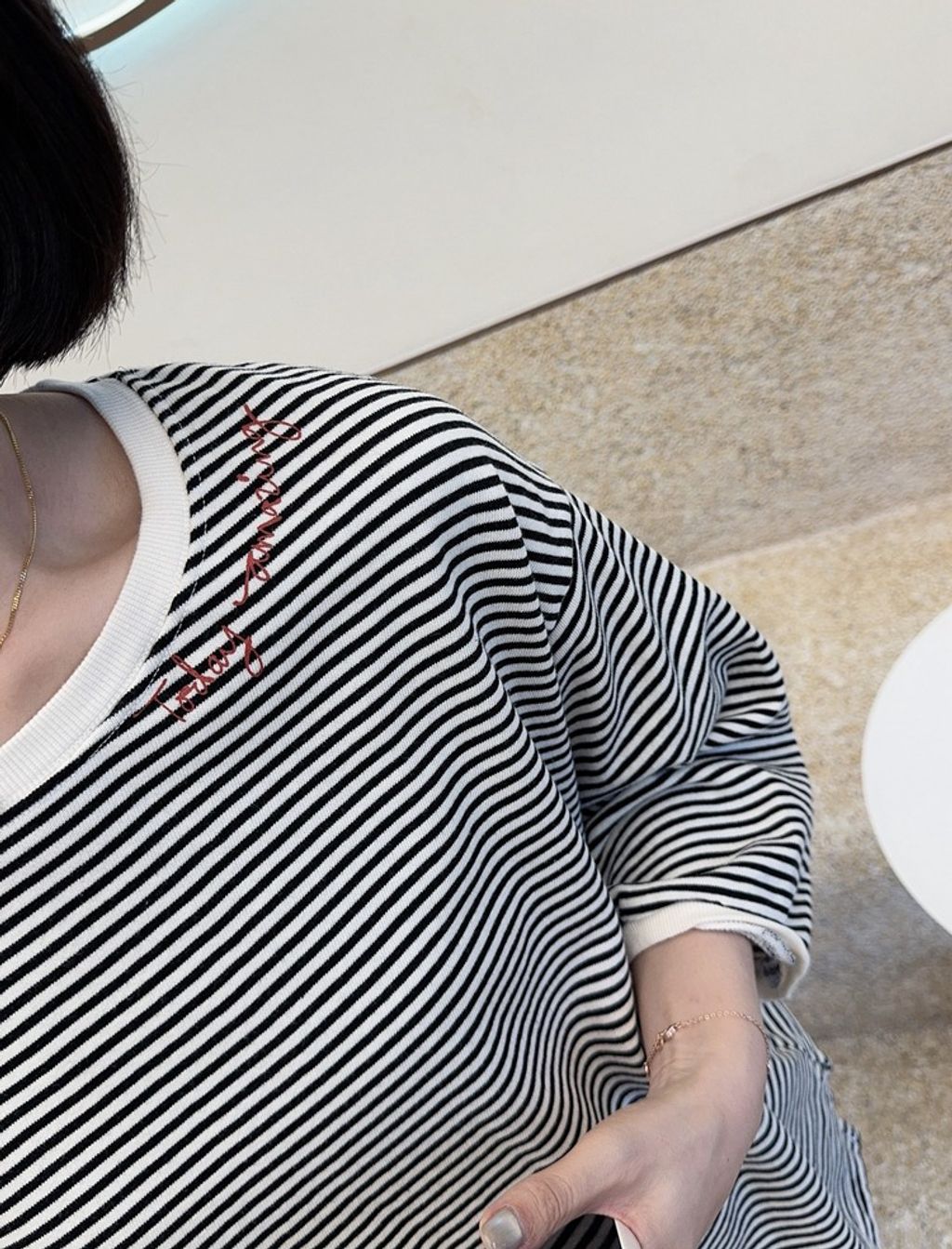 正韓 亮眼字母刺繡設計感條紋長T*白黑條紋*【R0920-111】