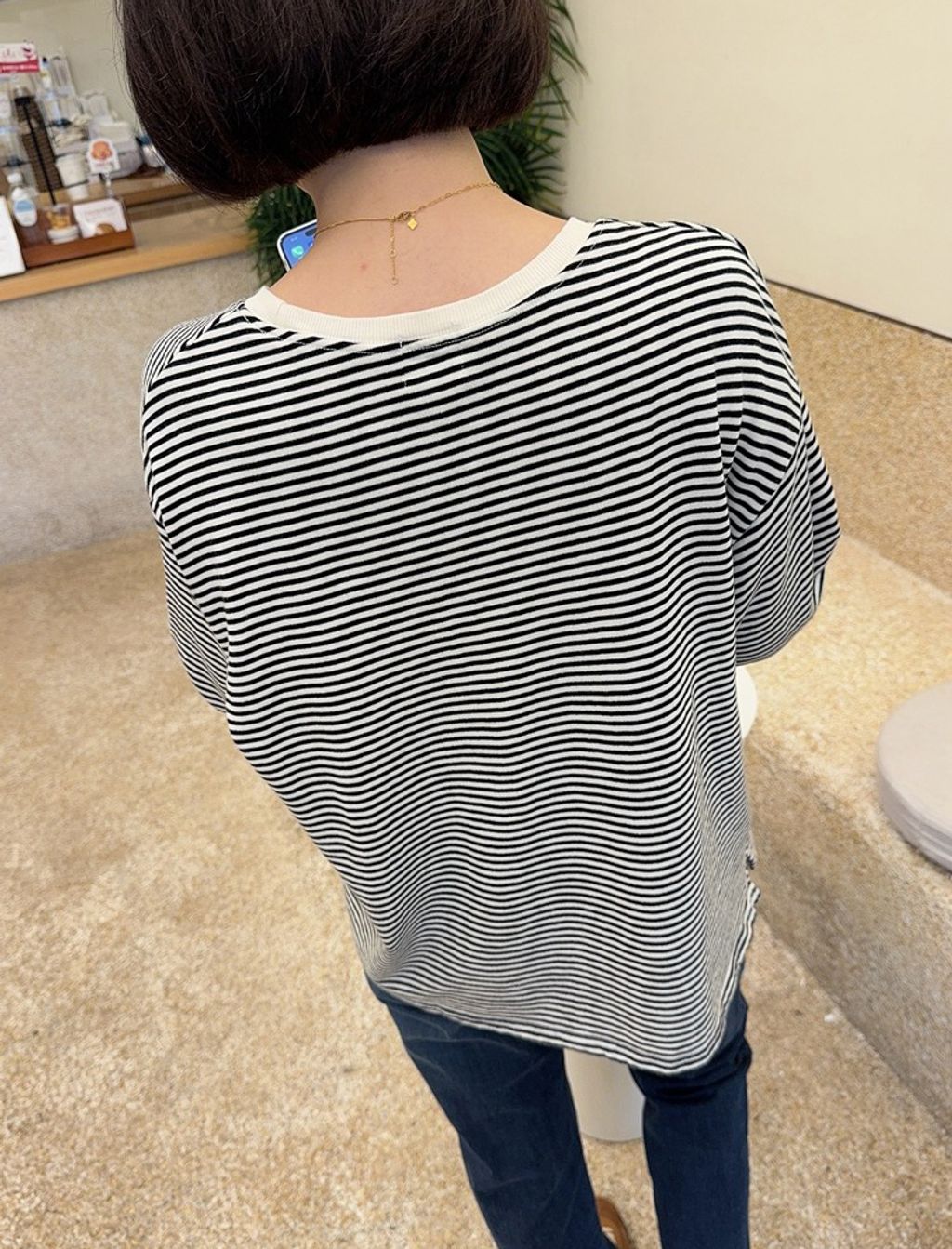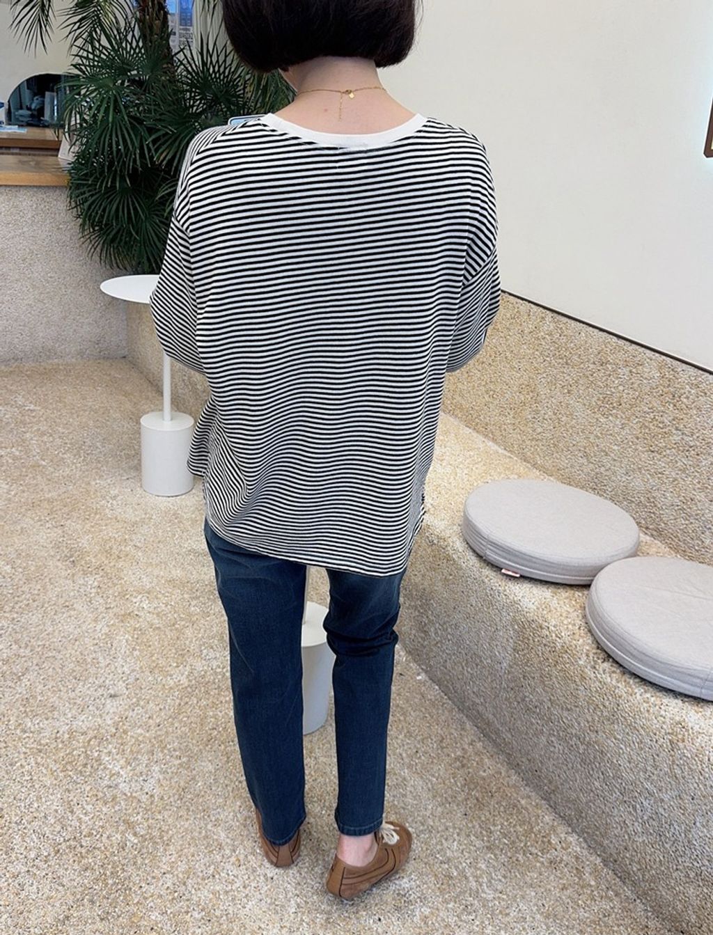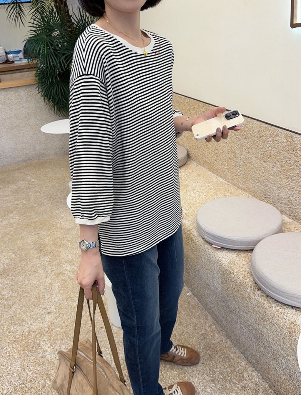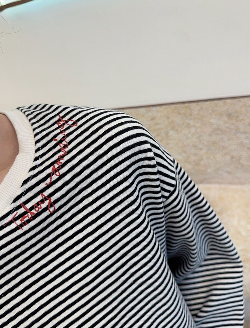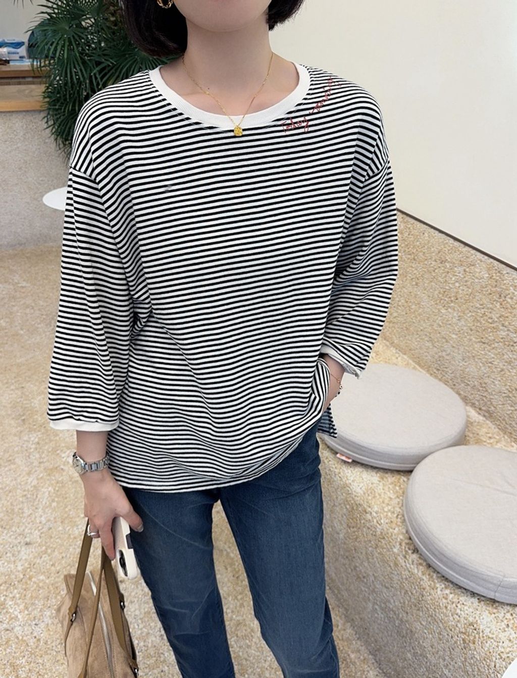 正韓 亮眼字母刺繡設計感條紋長T*白黑條紋*【R0920-111】