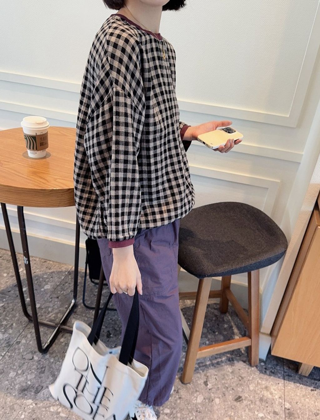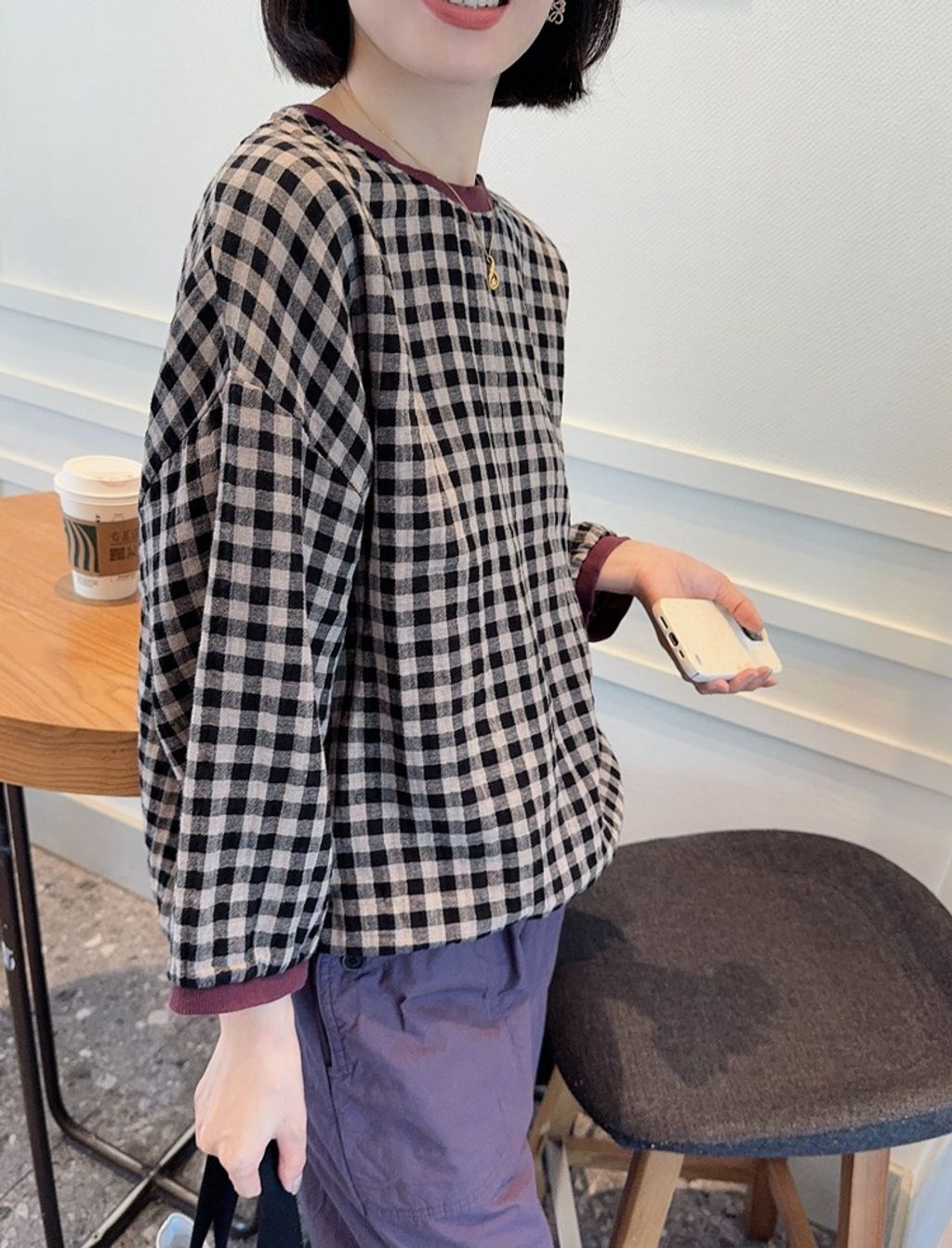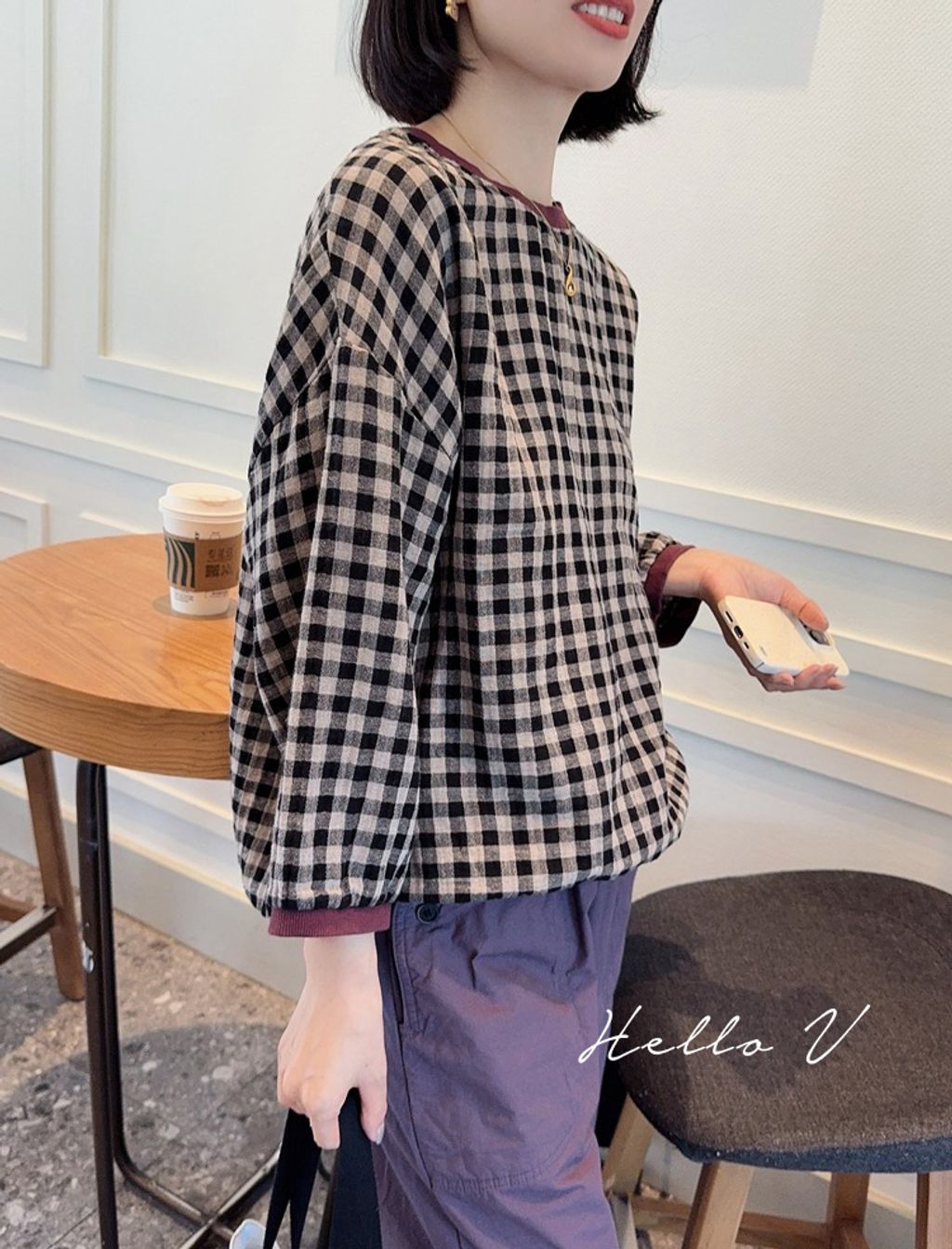 正韓 古典氣質棕黑格紋質感上衣*棕黑格*【R0920-96】
