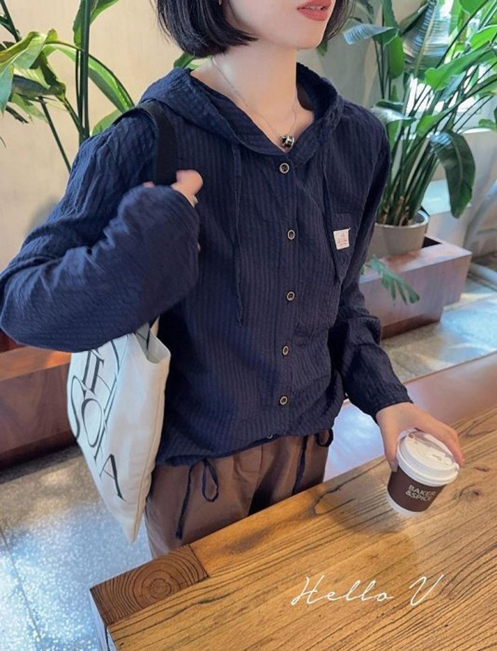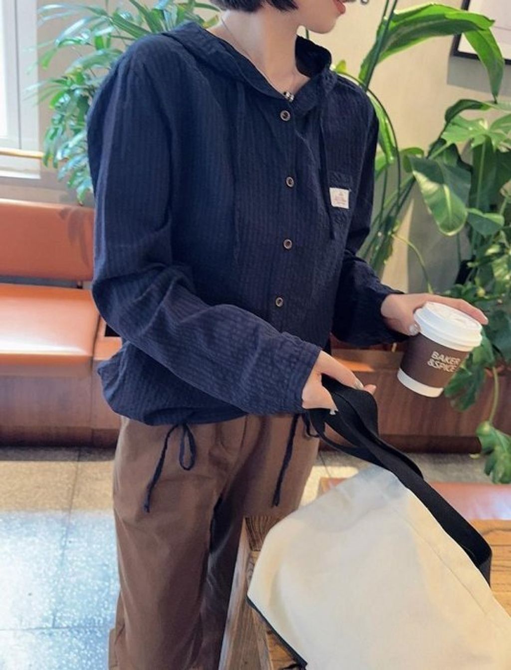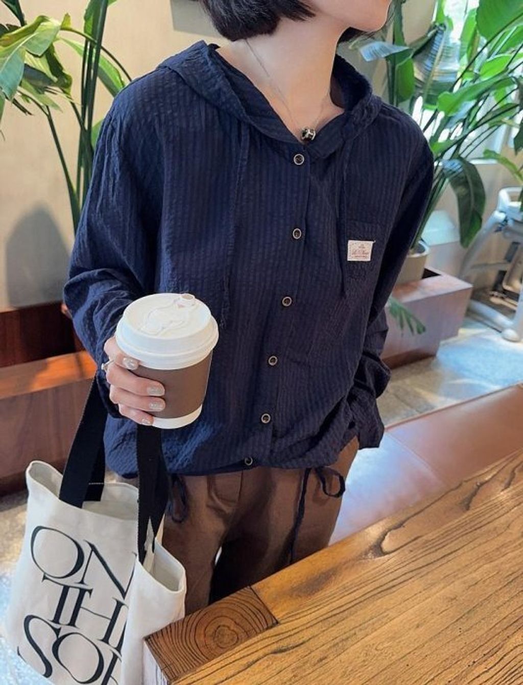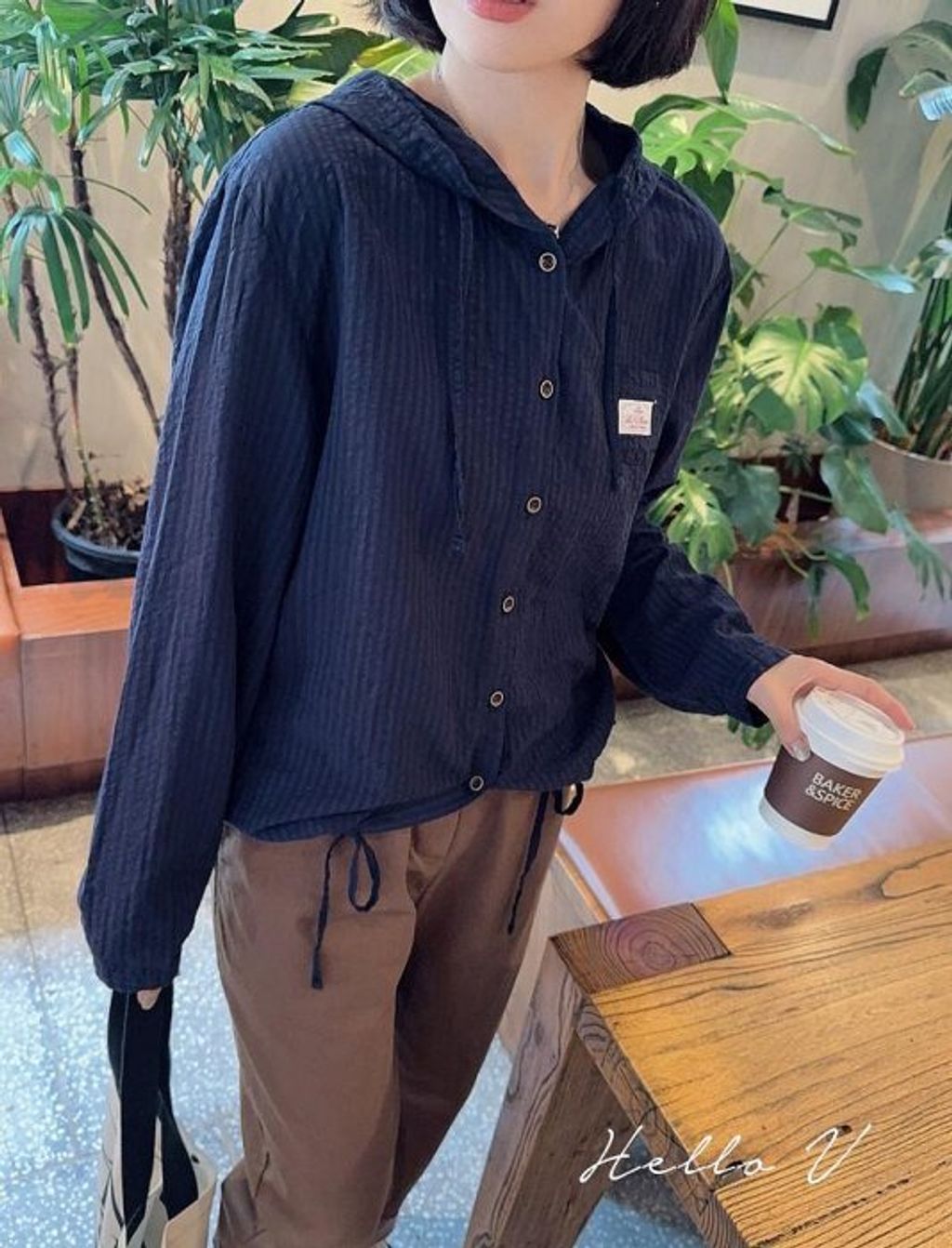 正韓 沉穩氣質直條紋連帽兩穿襯衫小外套*深藍*【R0920-101】