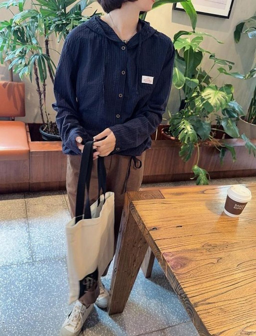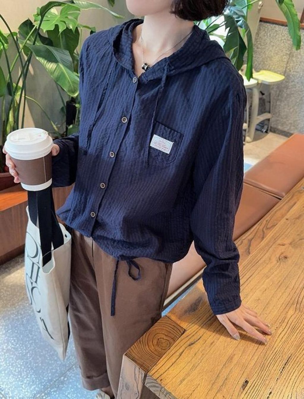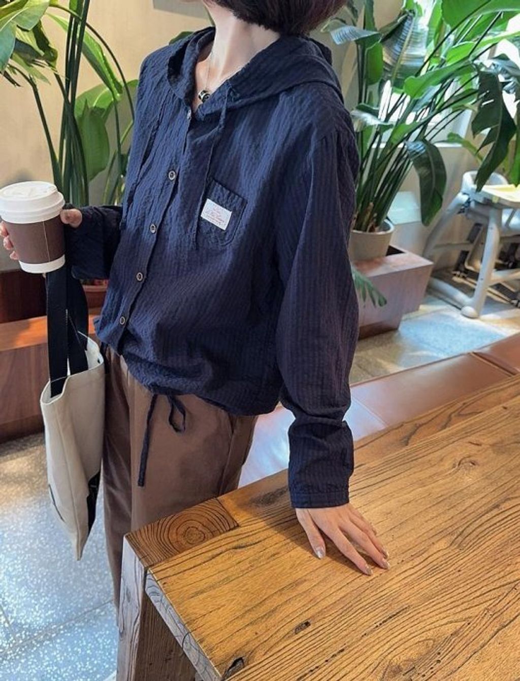 正韓 沉穩氣質直條紋連帽兩穿襯衫小外套*深藍*【R0920-101】