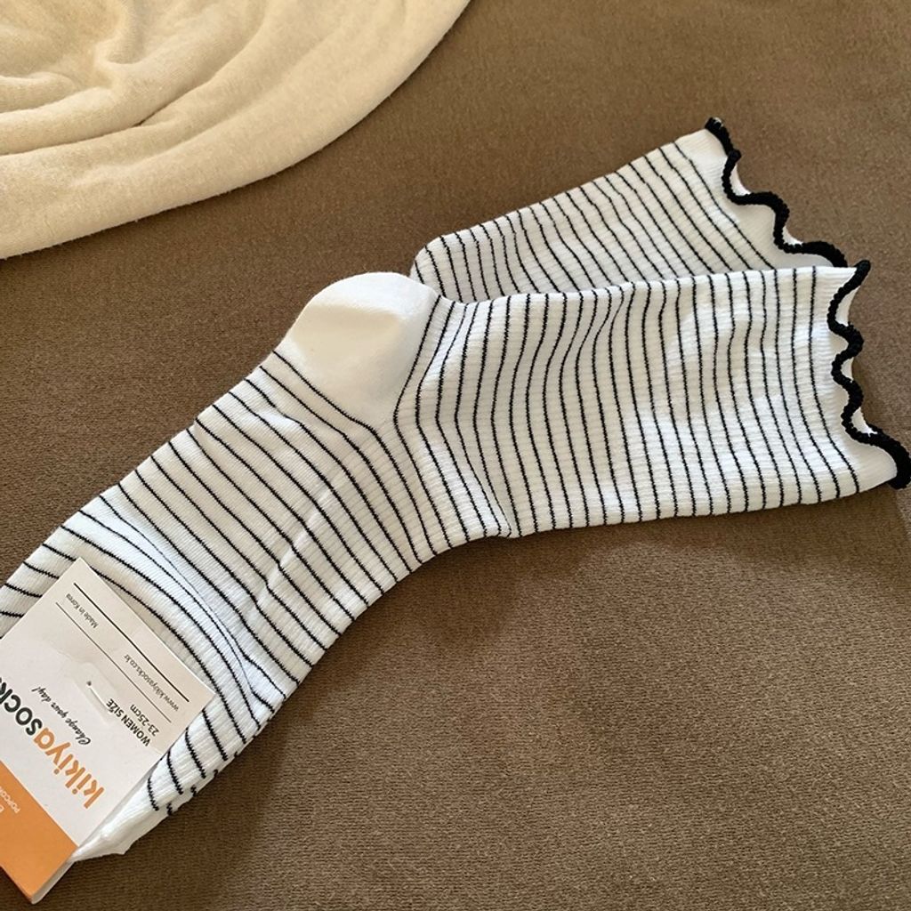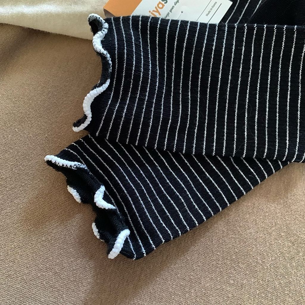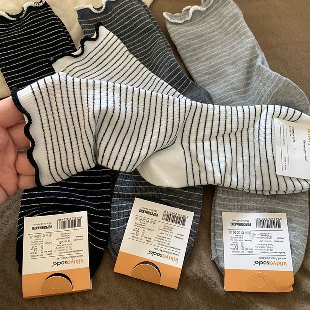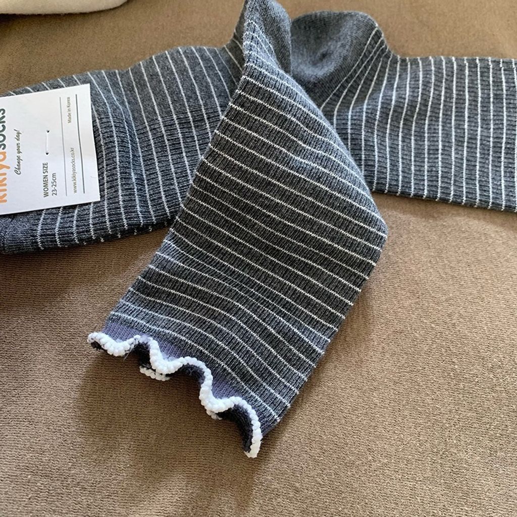 正韓 簡約甜美荷葉滾邊條紋短襪*黑白灰*【R0920-185】
