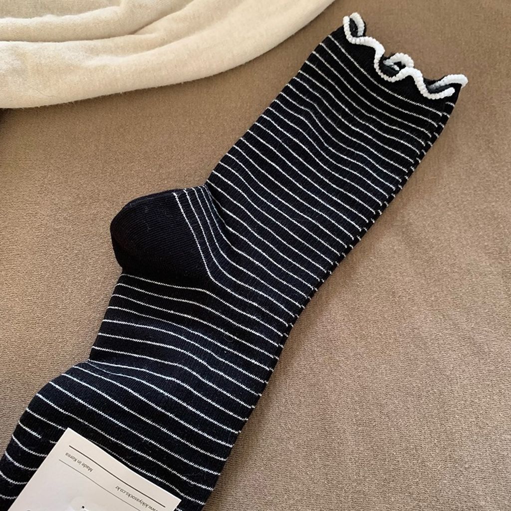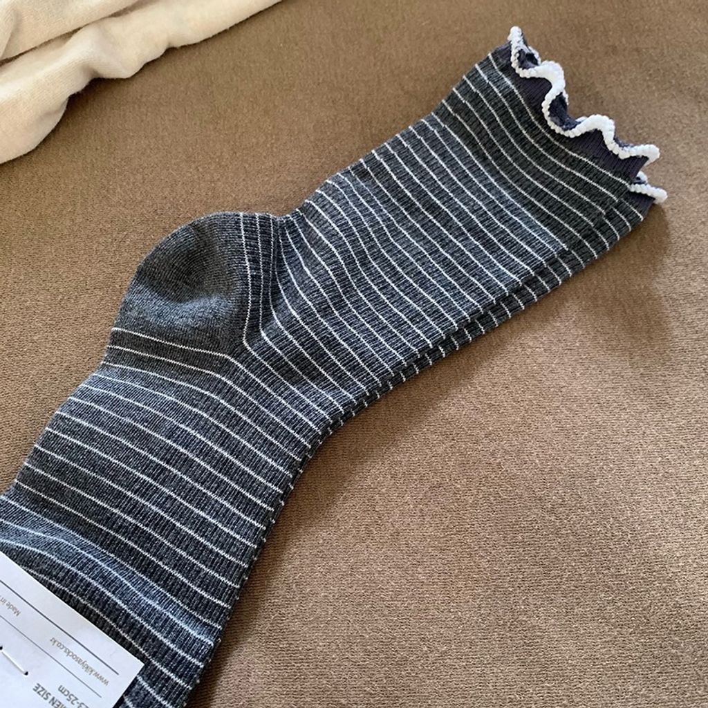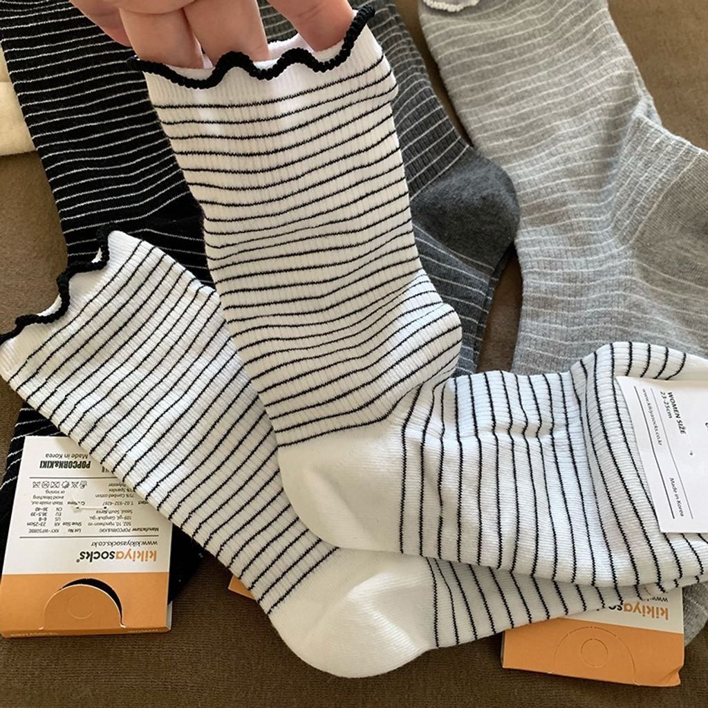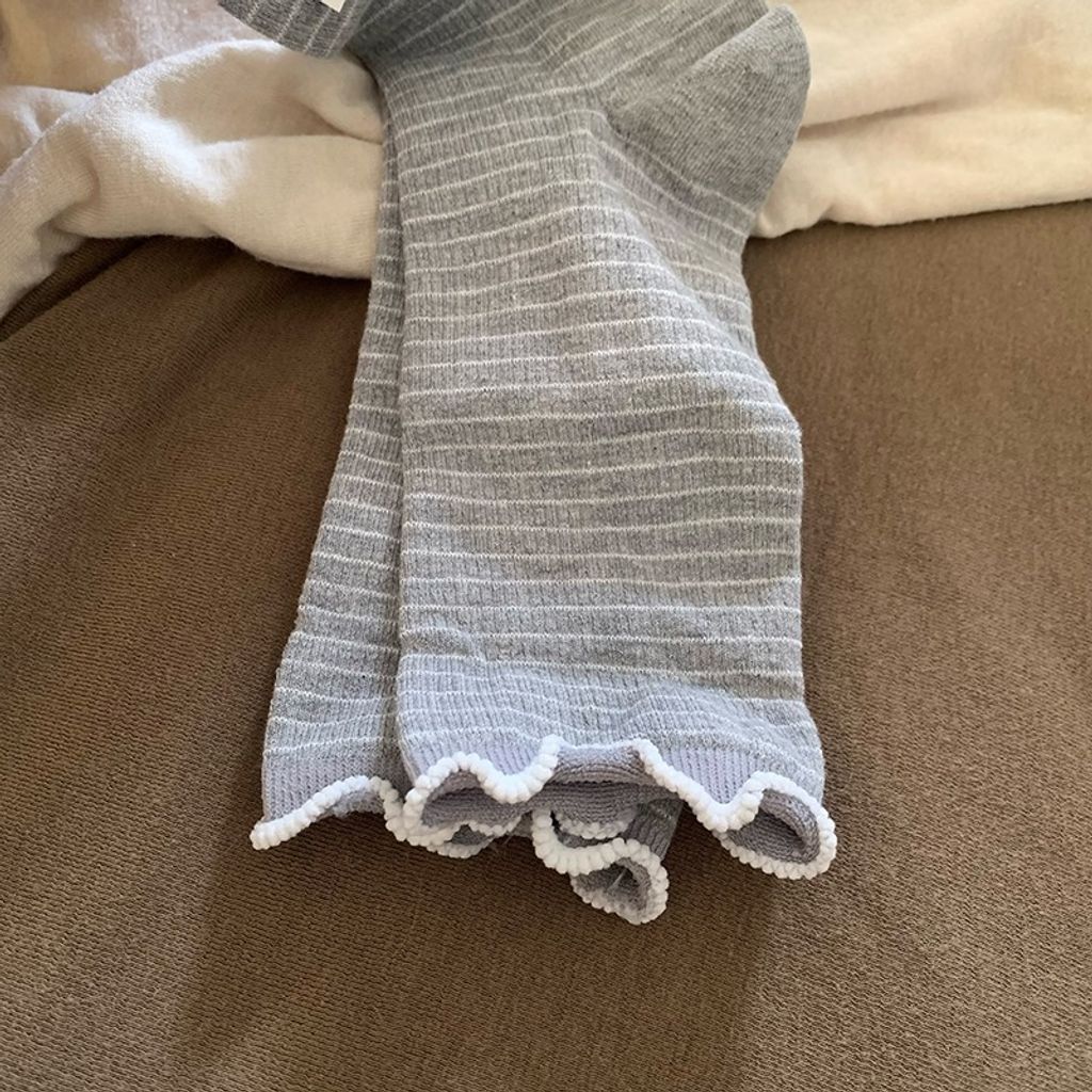 正韓 簡約甜美荷葉滾邊條紋短襪*黑白灰*【R0920-185】