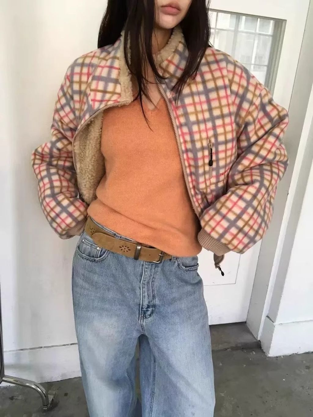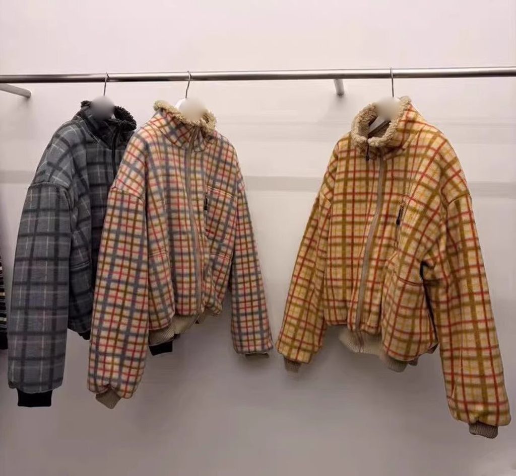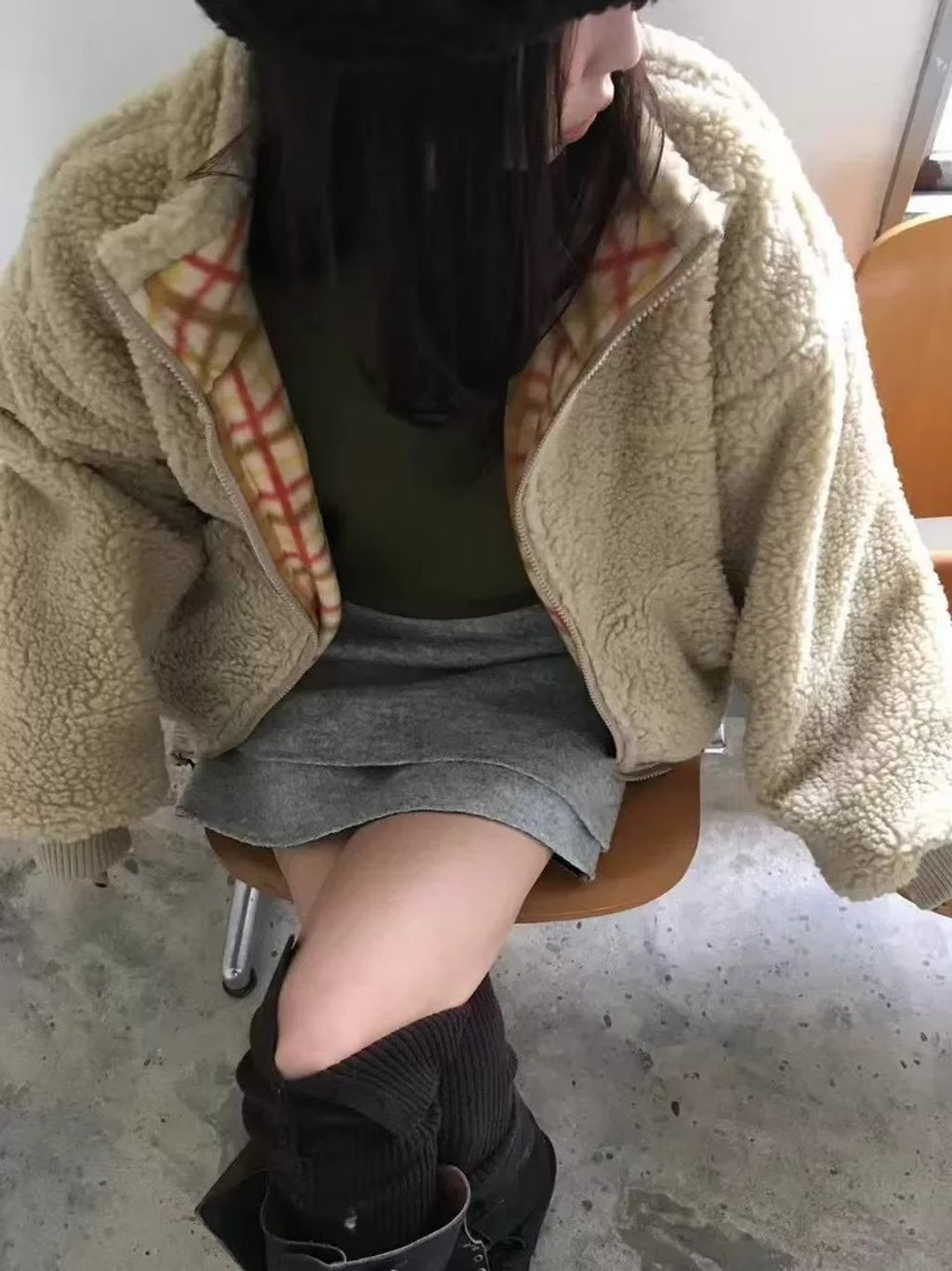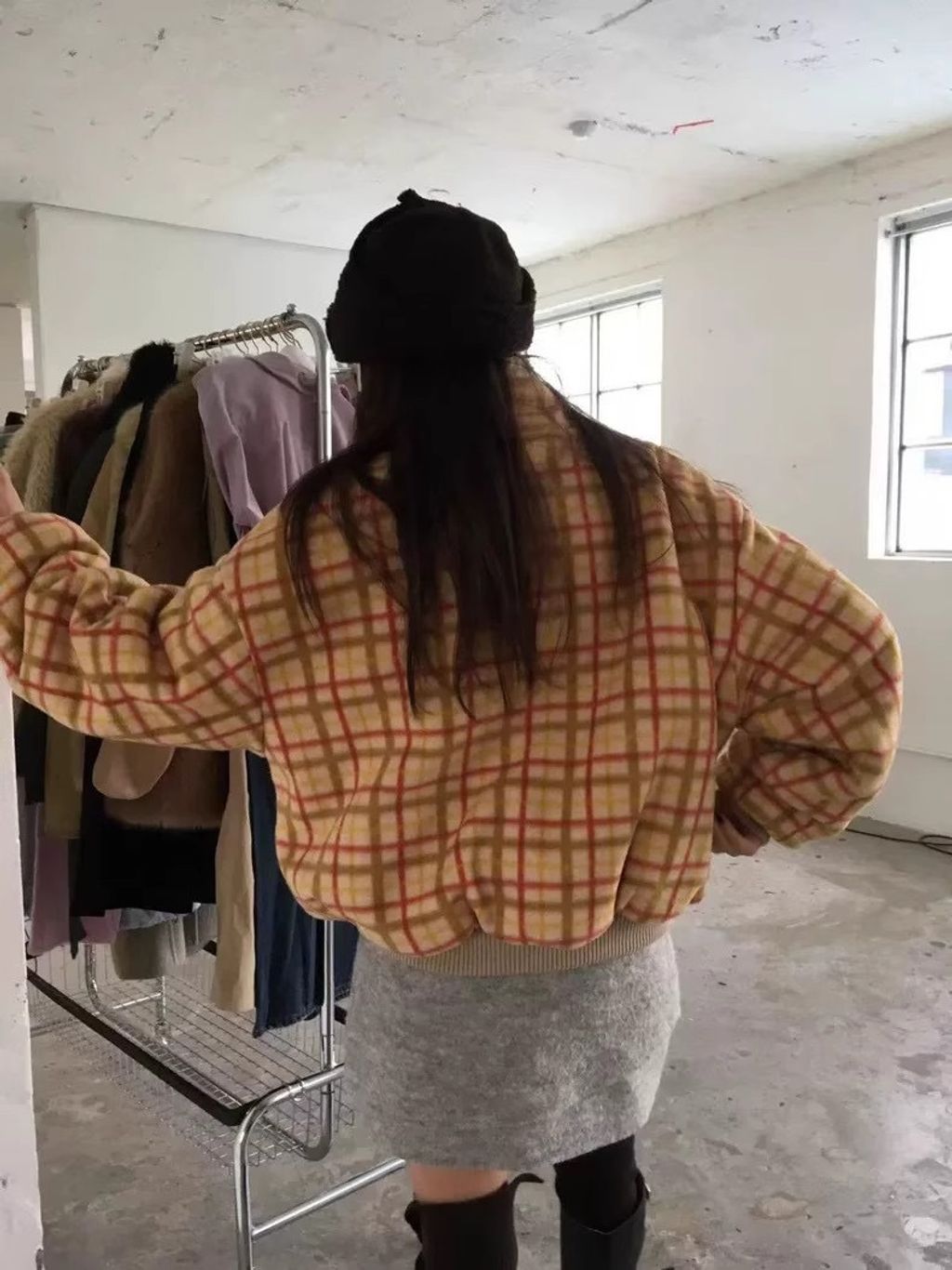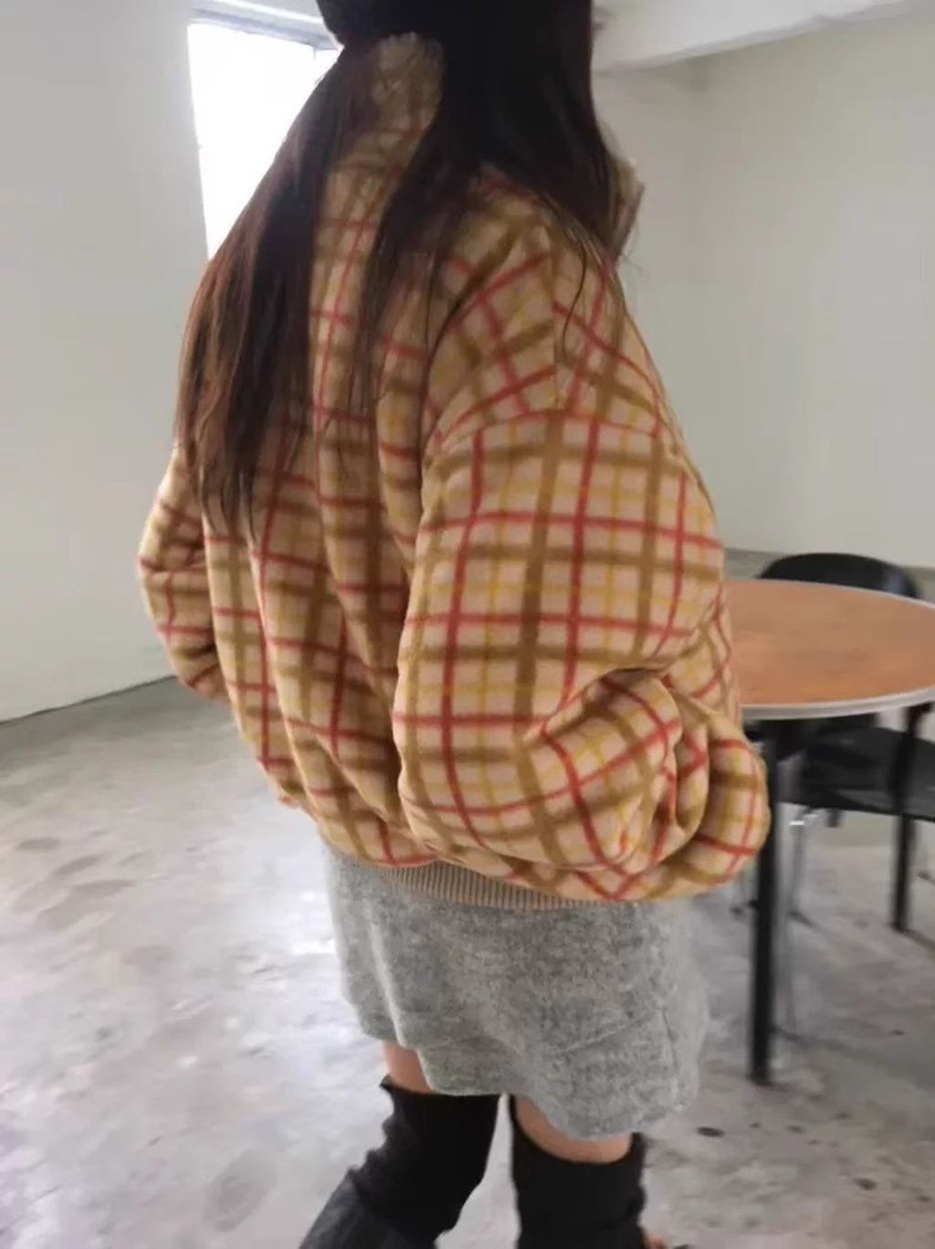 正韓 亮眼時尚撞色格紋雙面穿毛毛質感外套*黃灰米*【S1216-208】