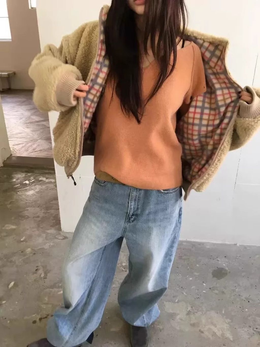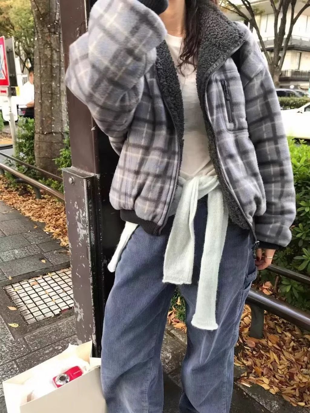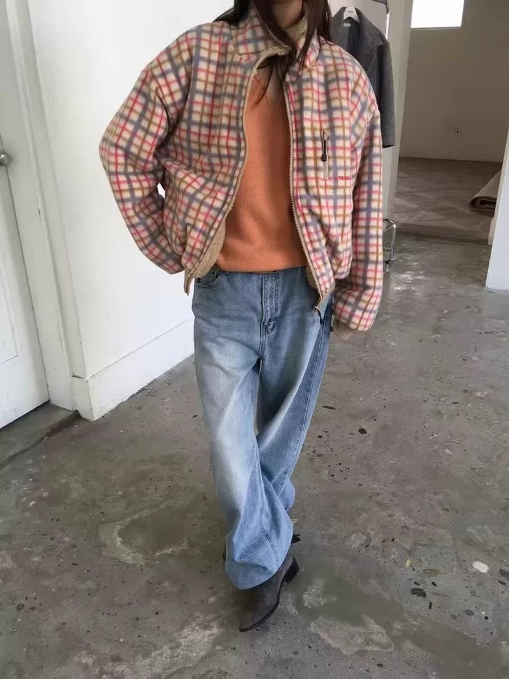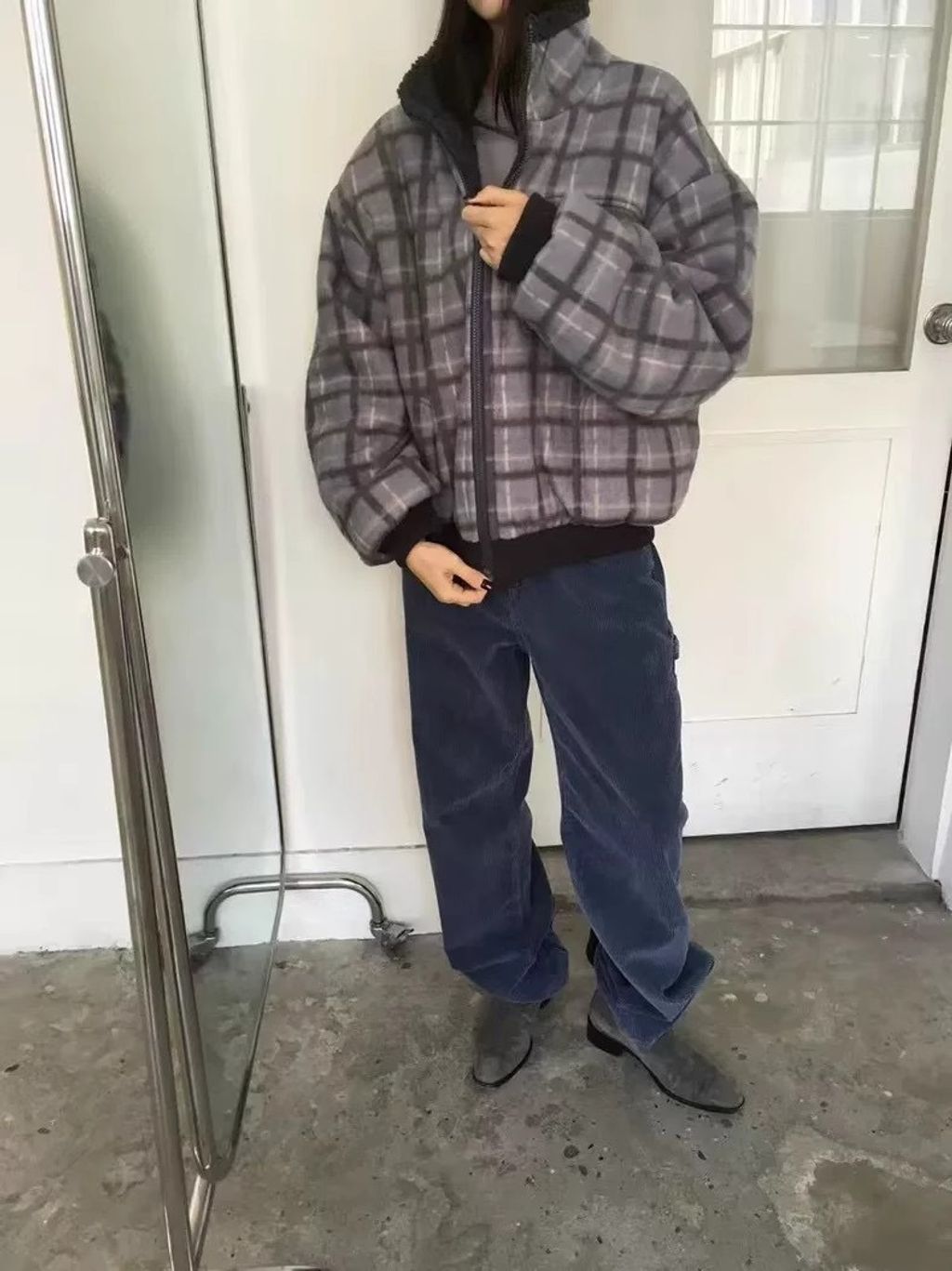 正韓 亮眼時尚撞色格紋雙面穿毛毛質感外套*黃灰米*【S1216-208】