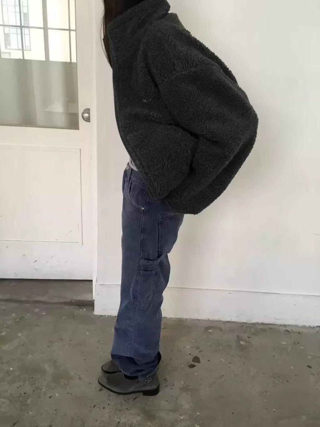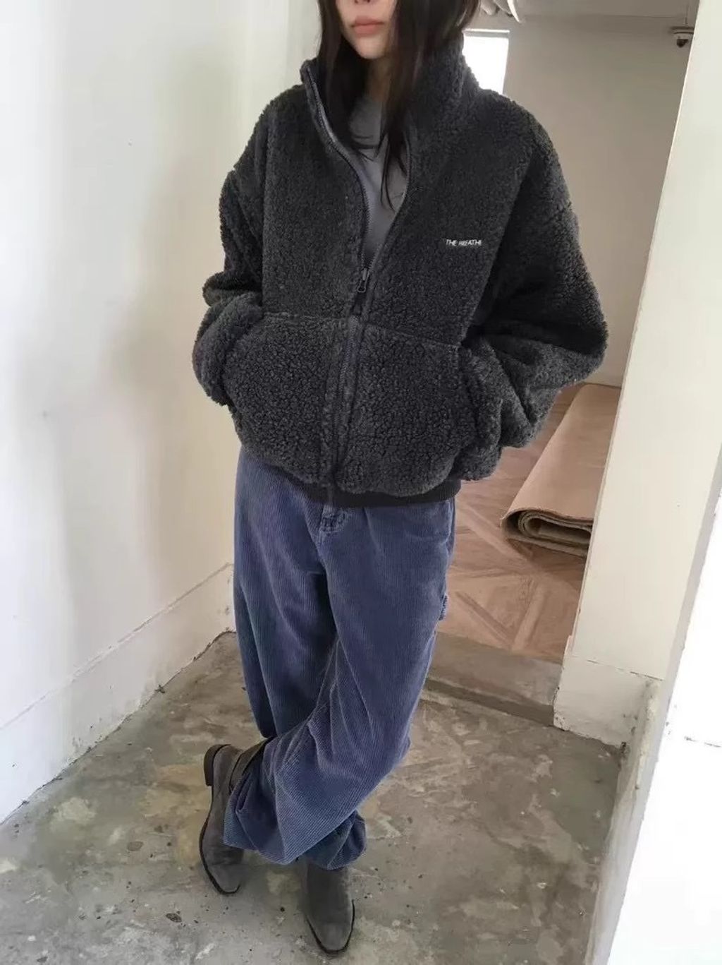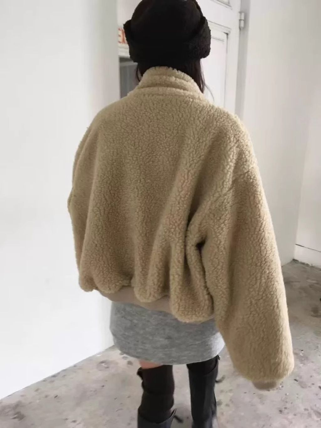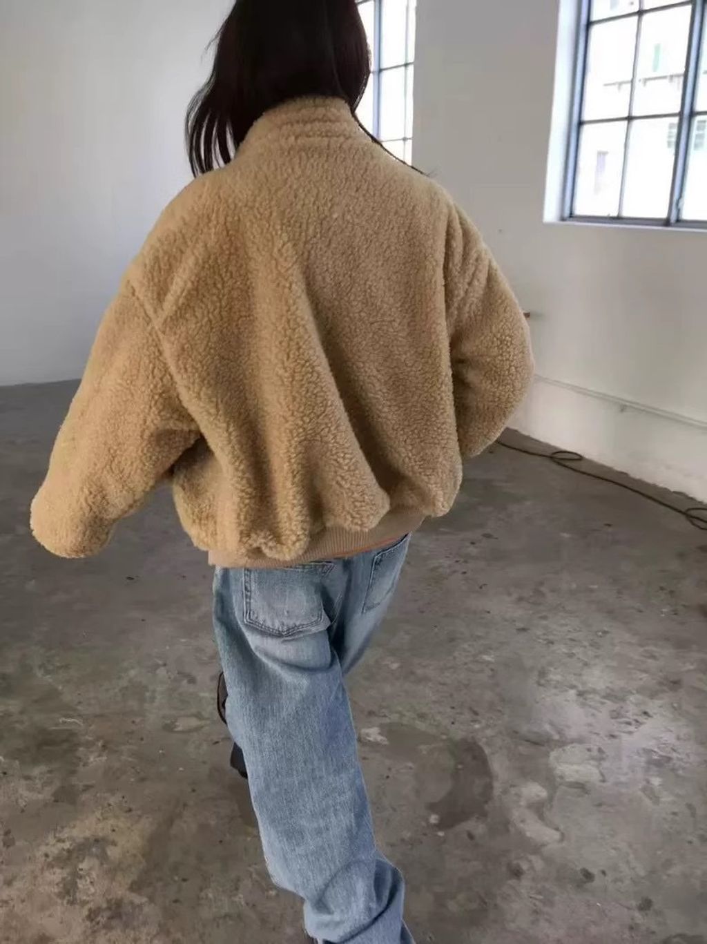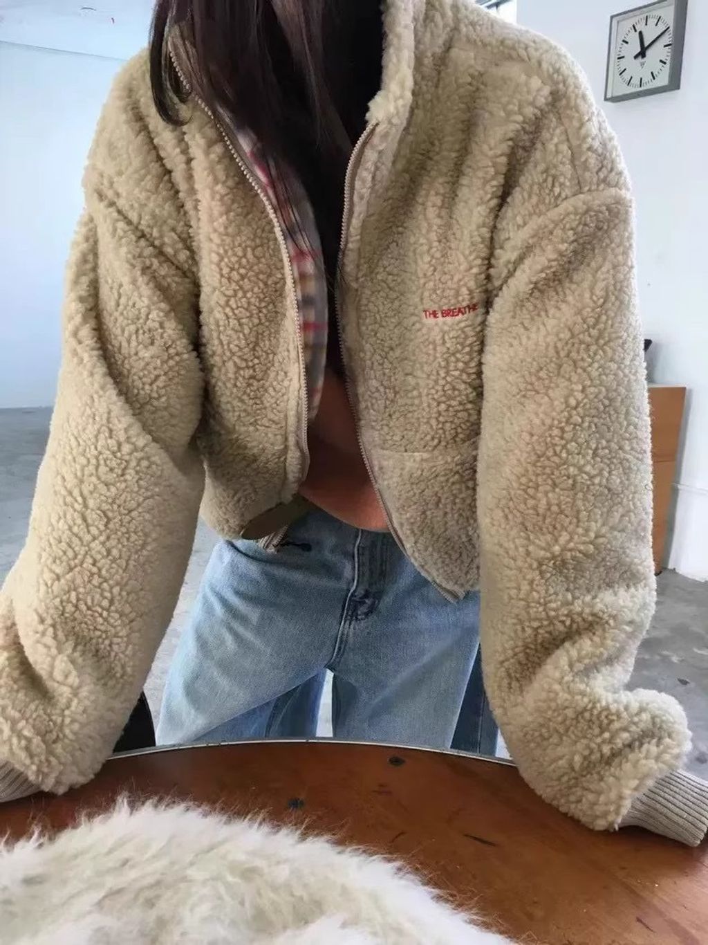 正韓 亮眼時尚撞色格紋雙面穿毛毛質感外套*黃灰米*【S1216-208】