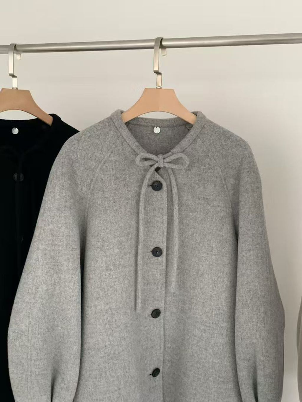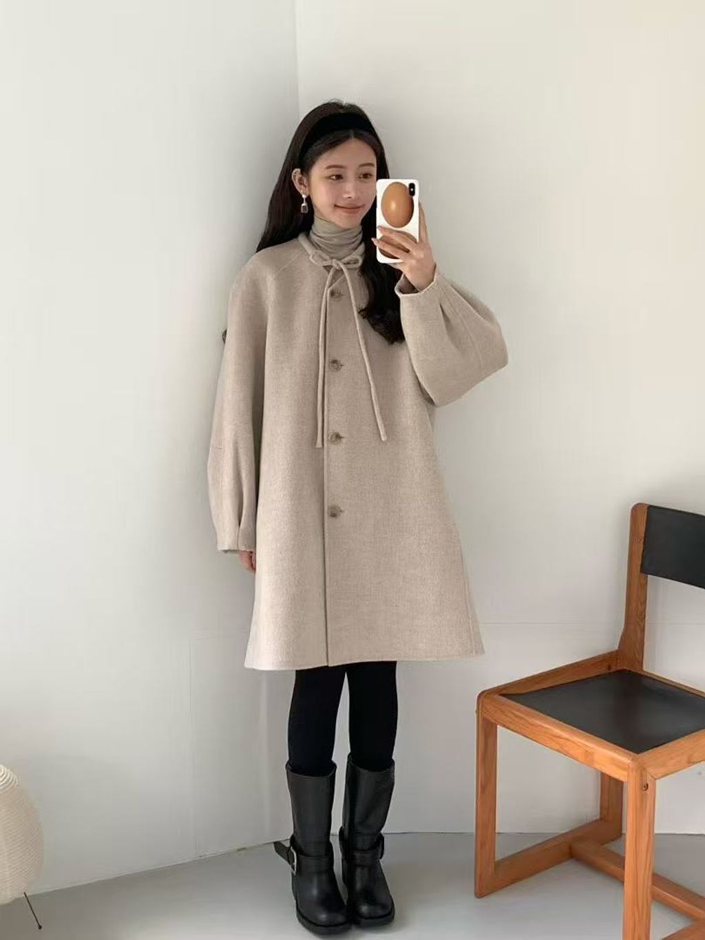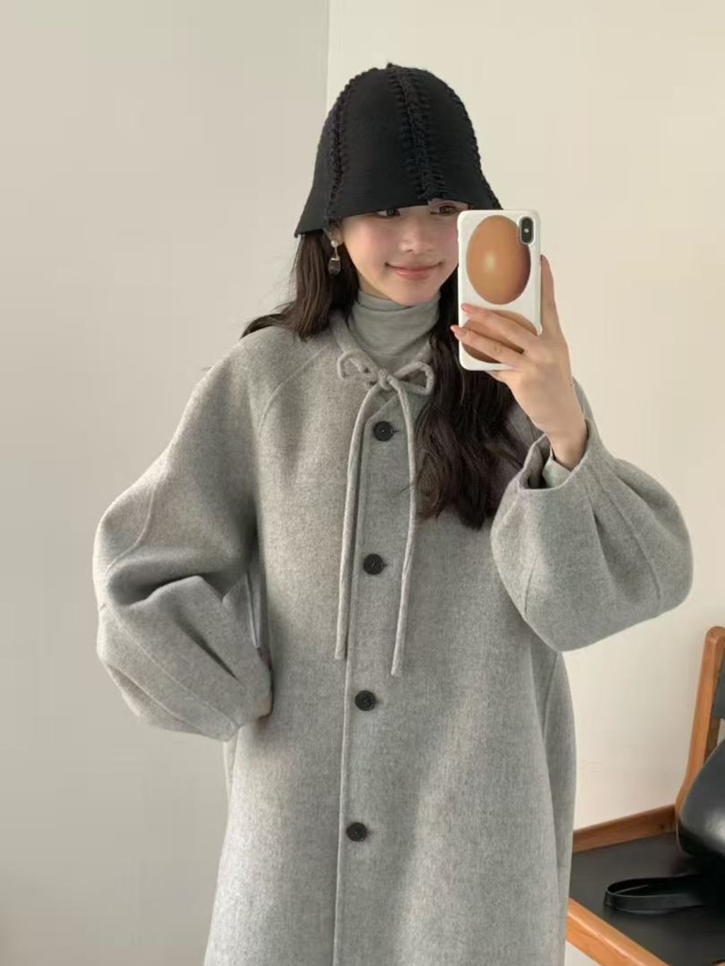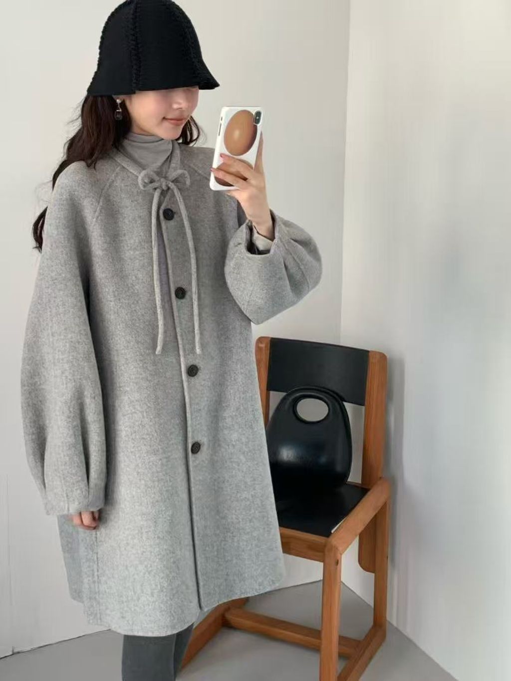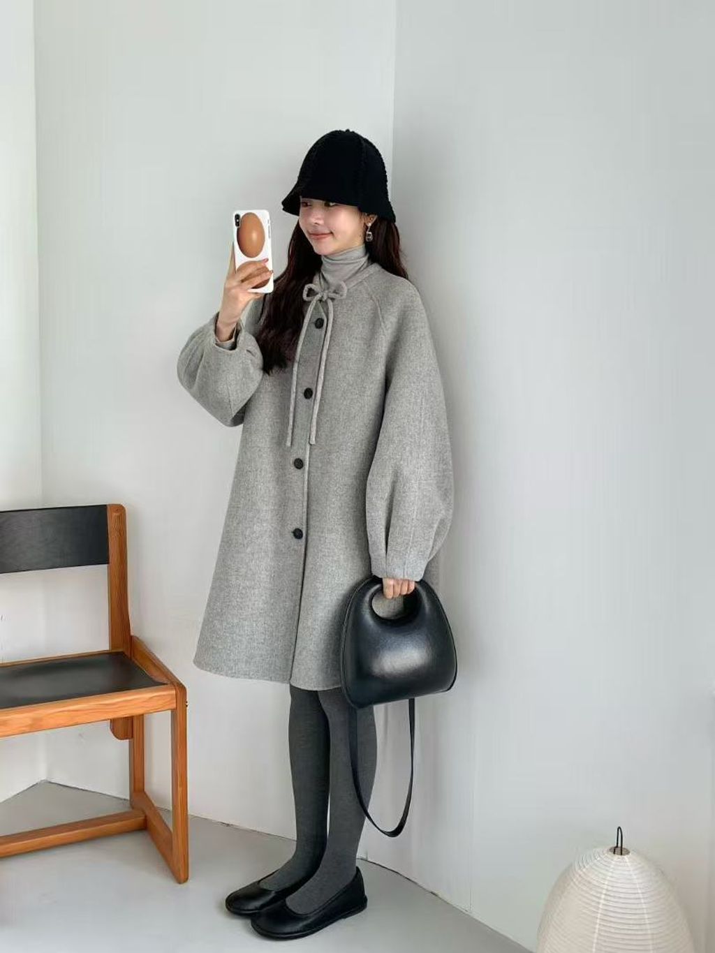 正韓 復古優雅蝴蝶結綁帶100%羊毛大衣外套*燕麥黑灰*【S1216-225】