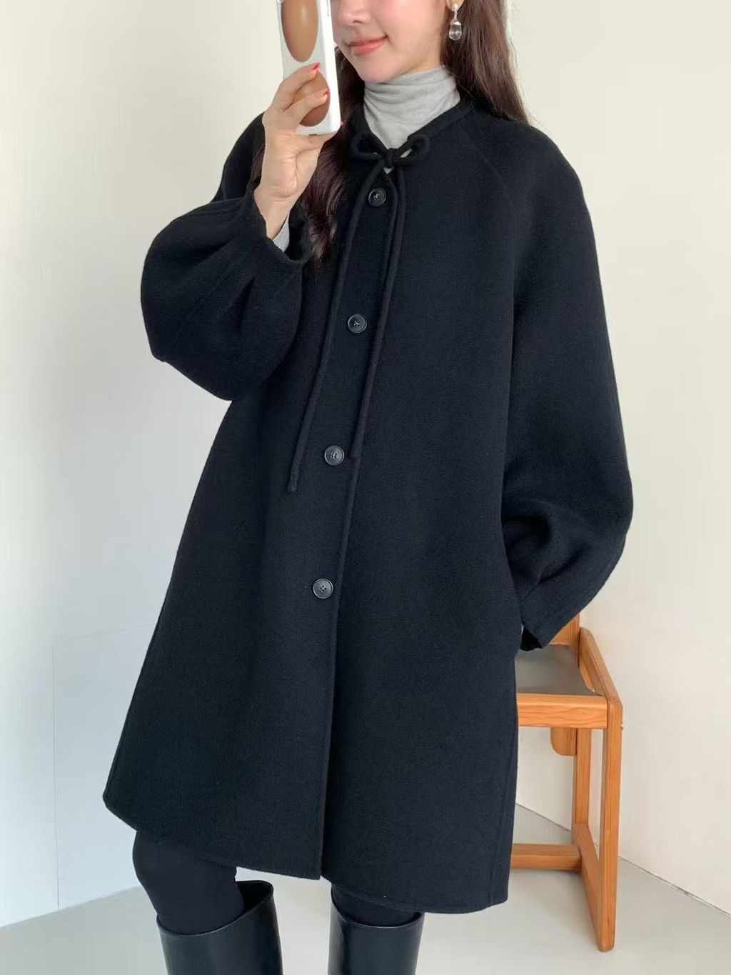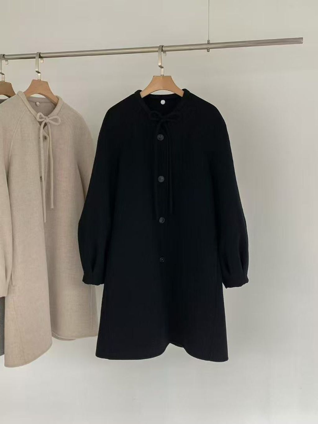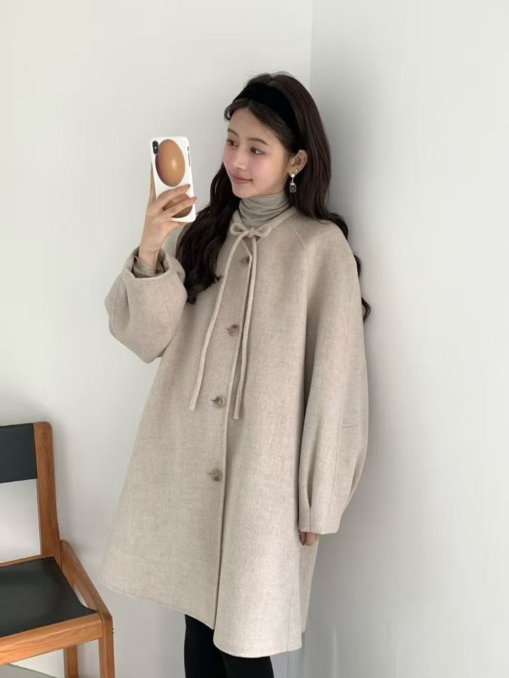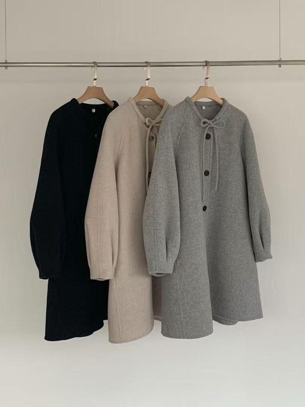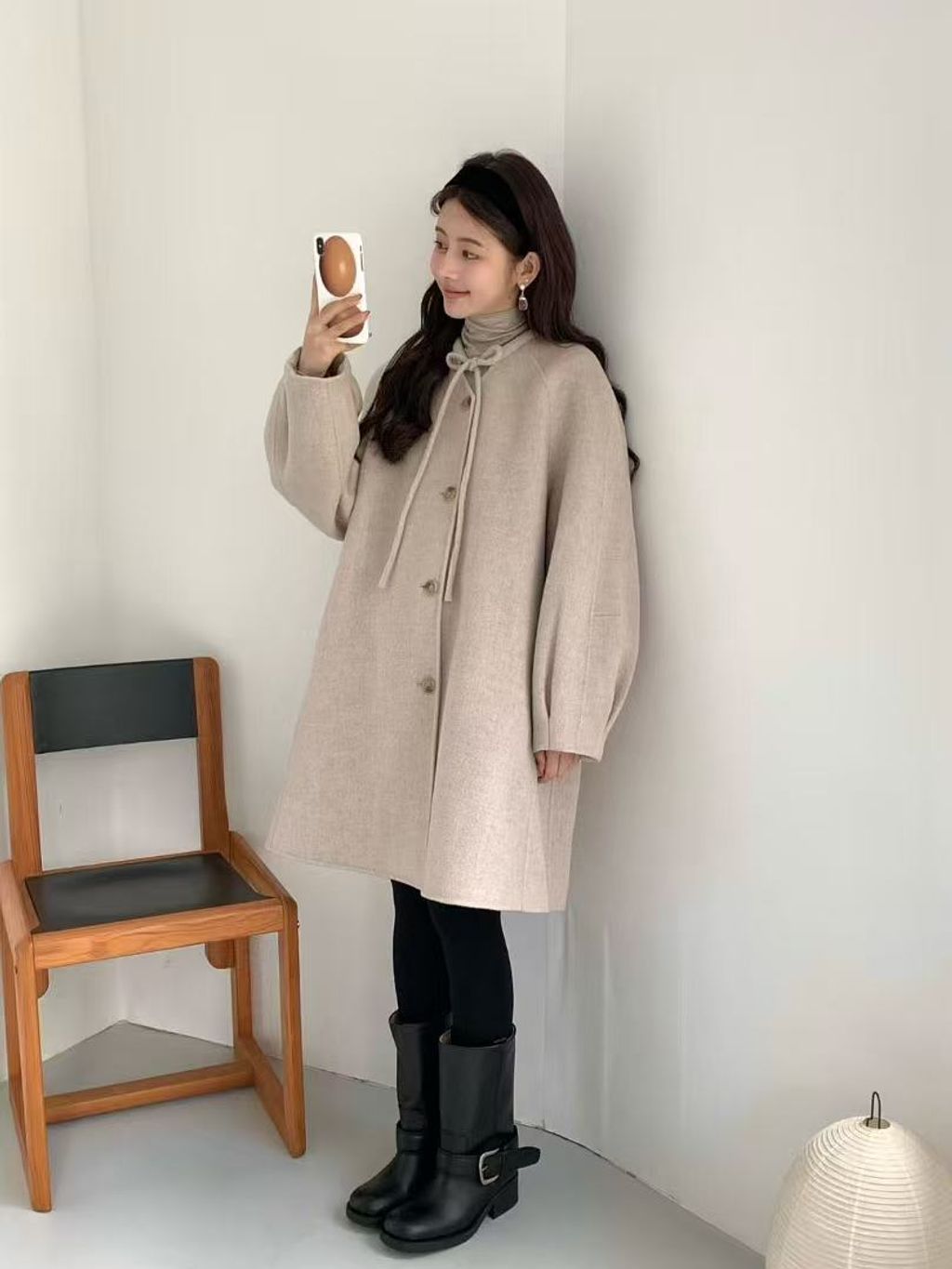 正韓 復古優雅蝴蝶結綁帶100%羊毛大衣外套*燕麥黑灰*【S1216-225】