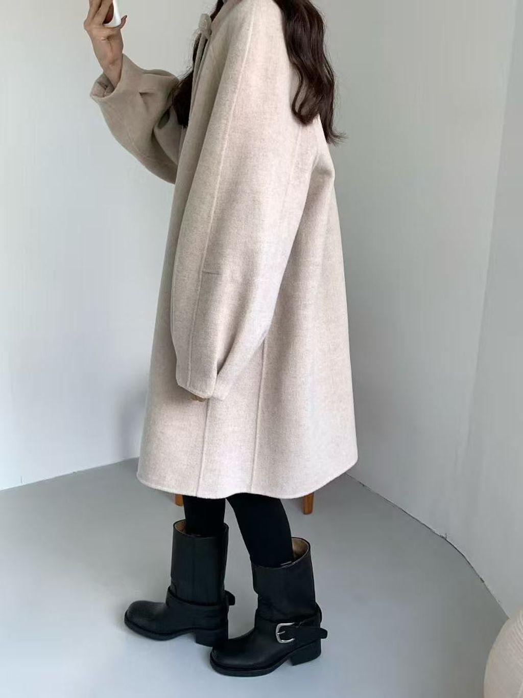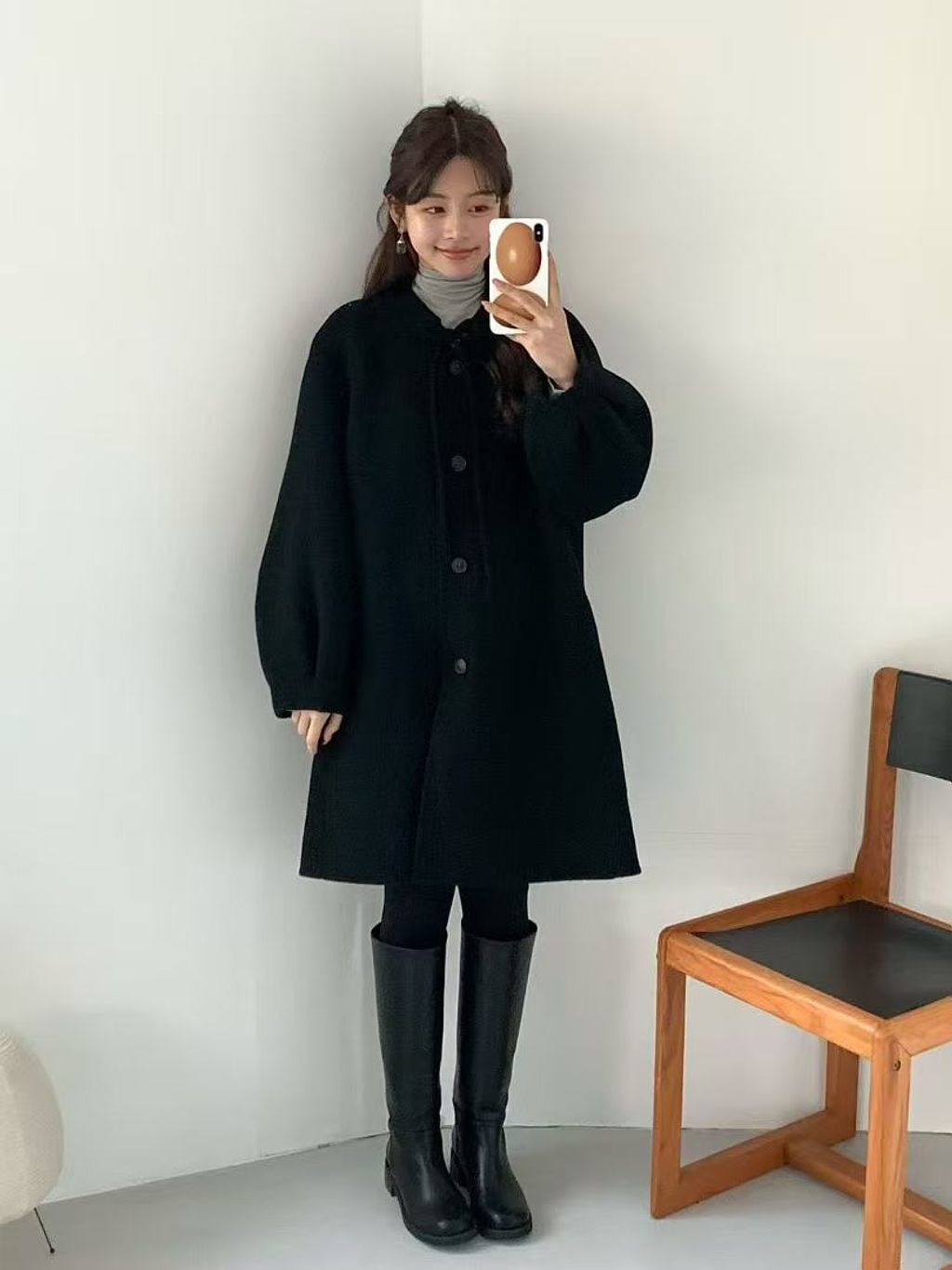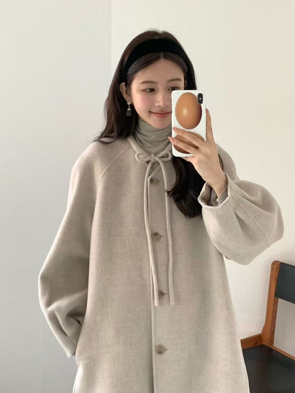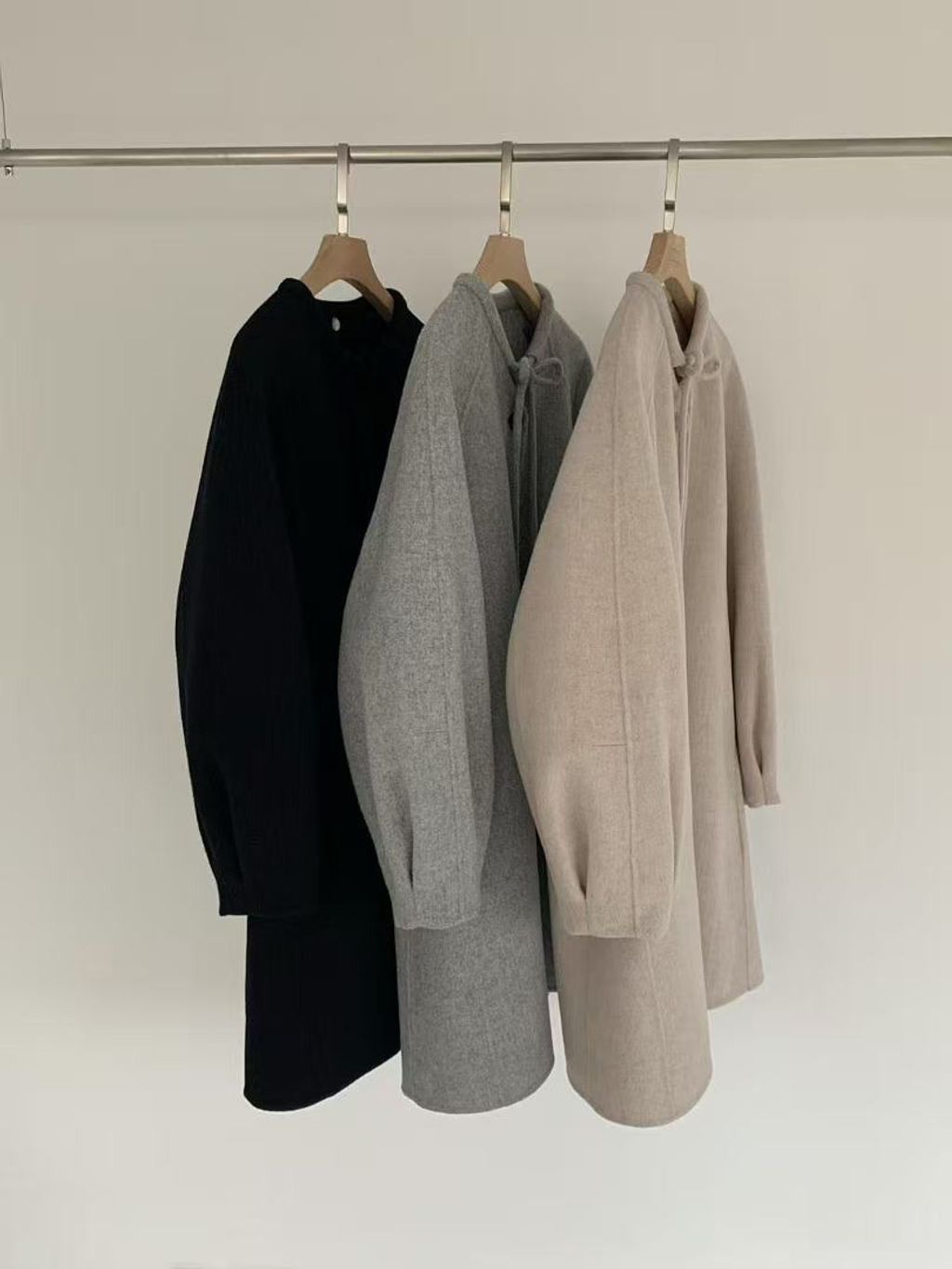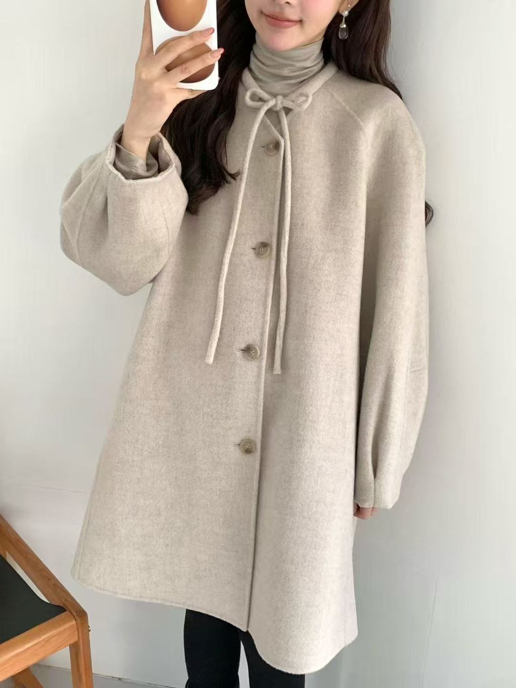 正韓 復古優雅蝴蝶結綁帶100%羊毛大衣外套*燕麥黑灰*【S1216-225】