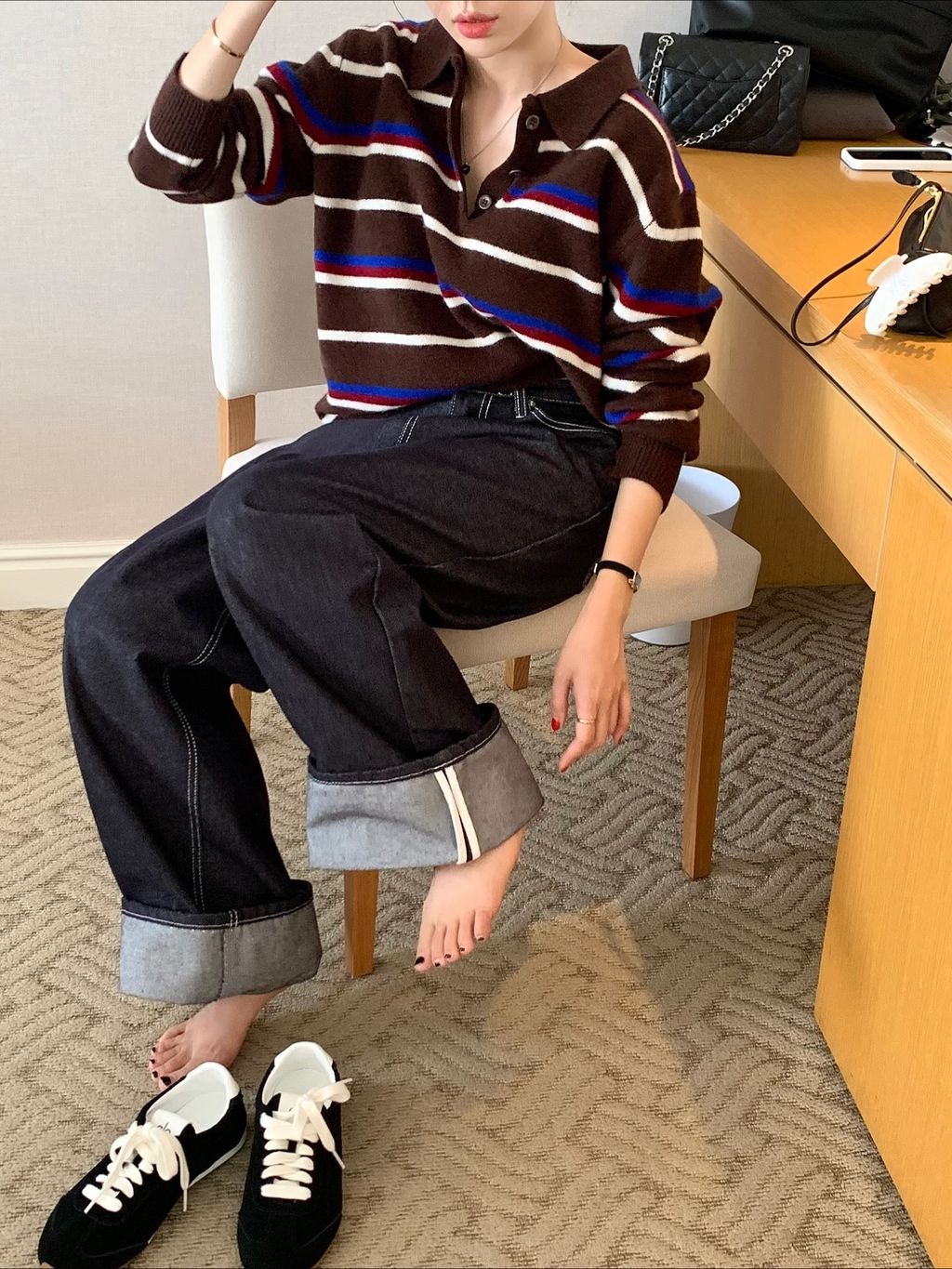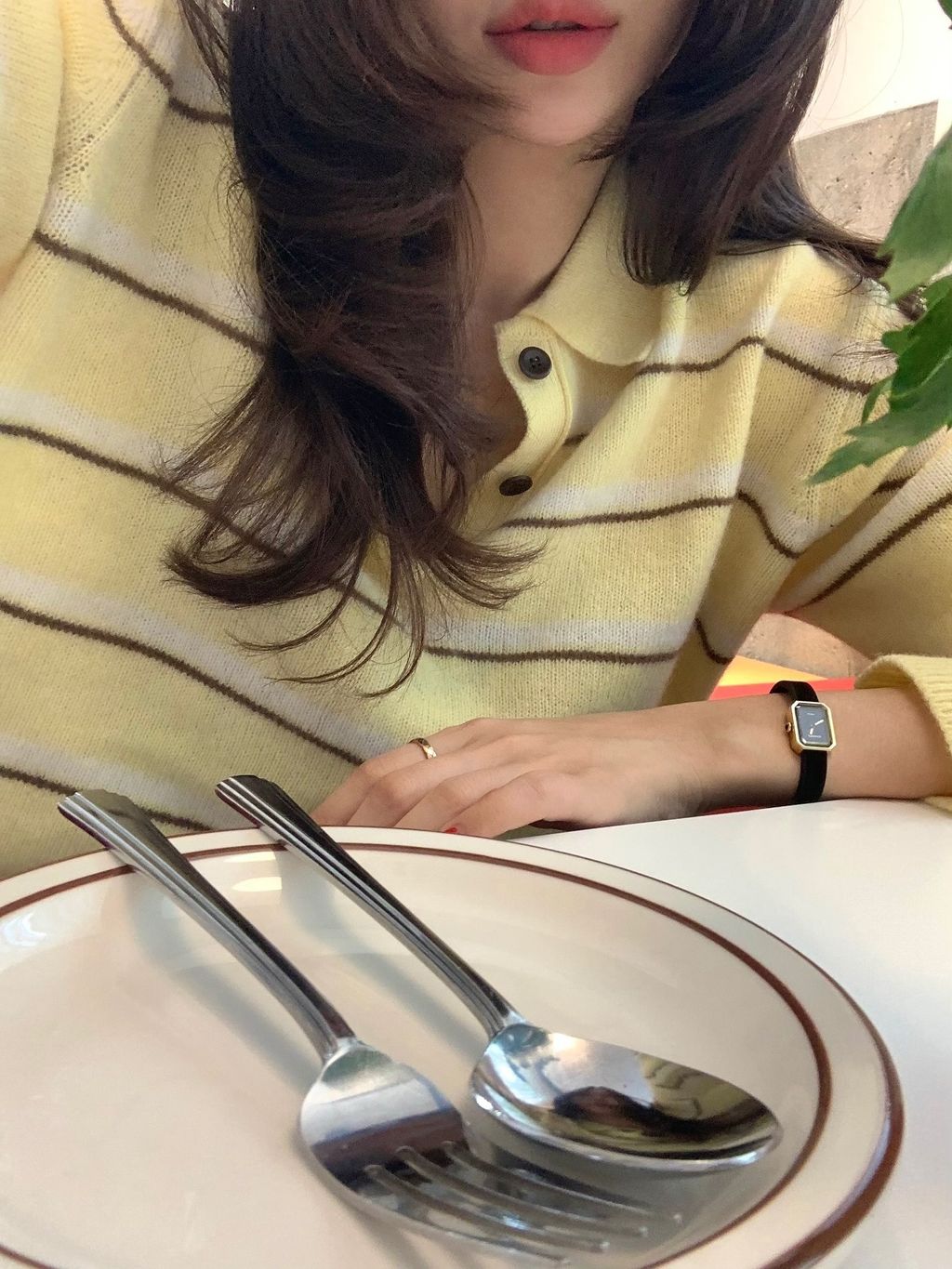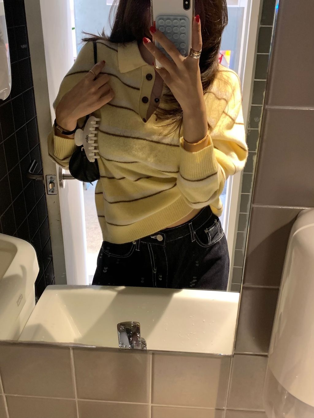 正韓 甜美檸檬撞色條紋翻領針織上衣*檸檬黃*【S1216-127】