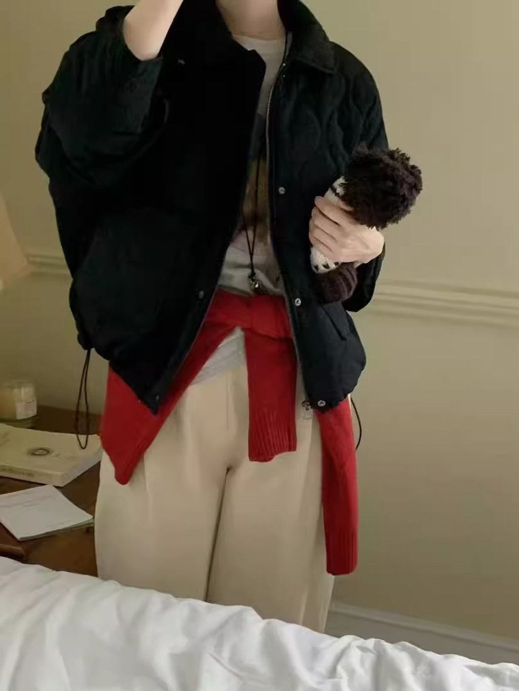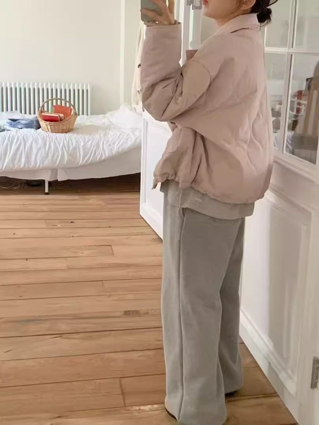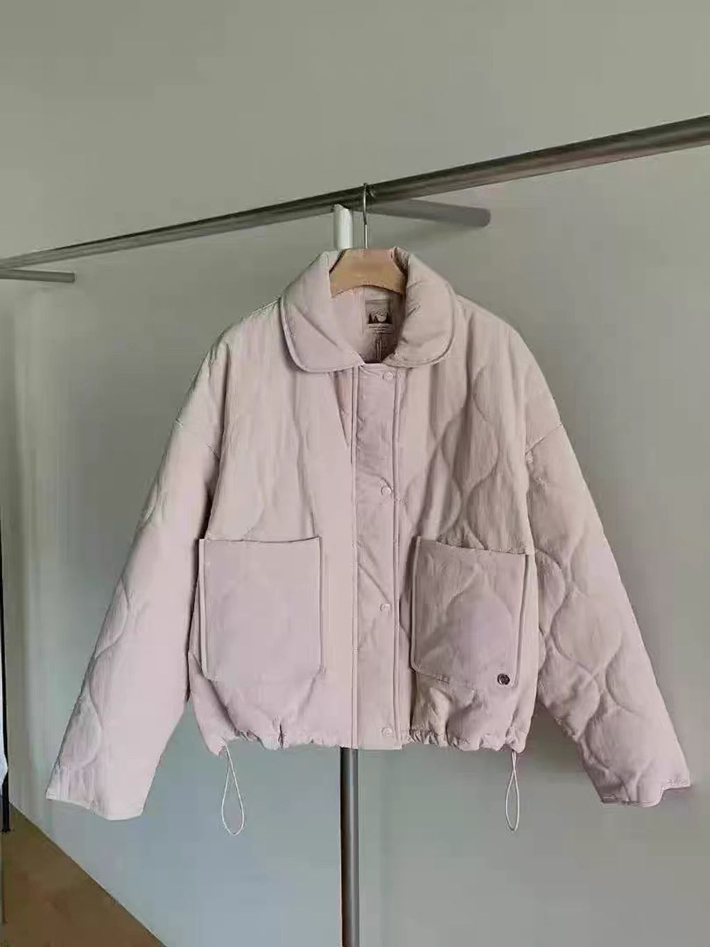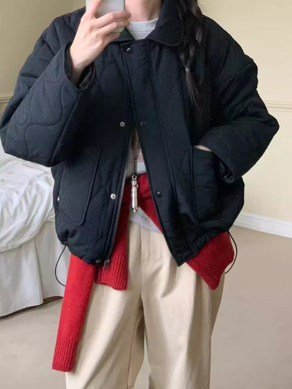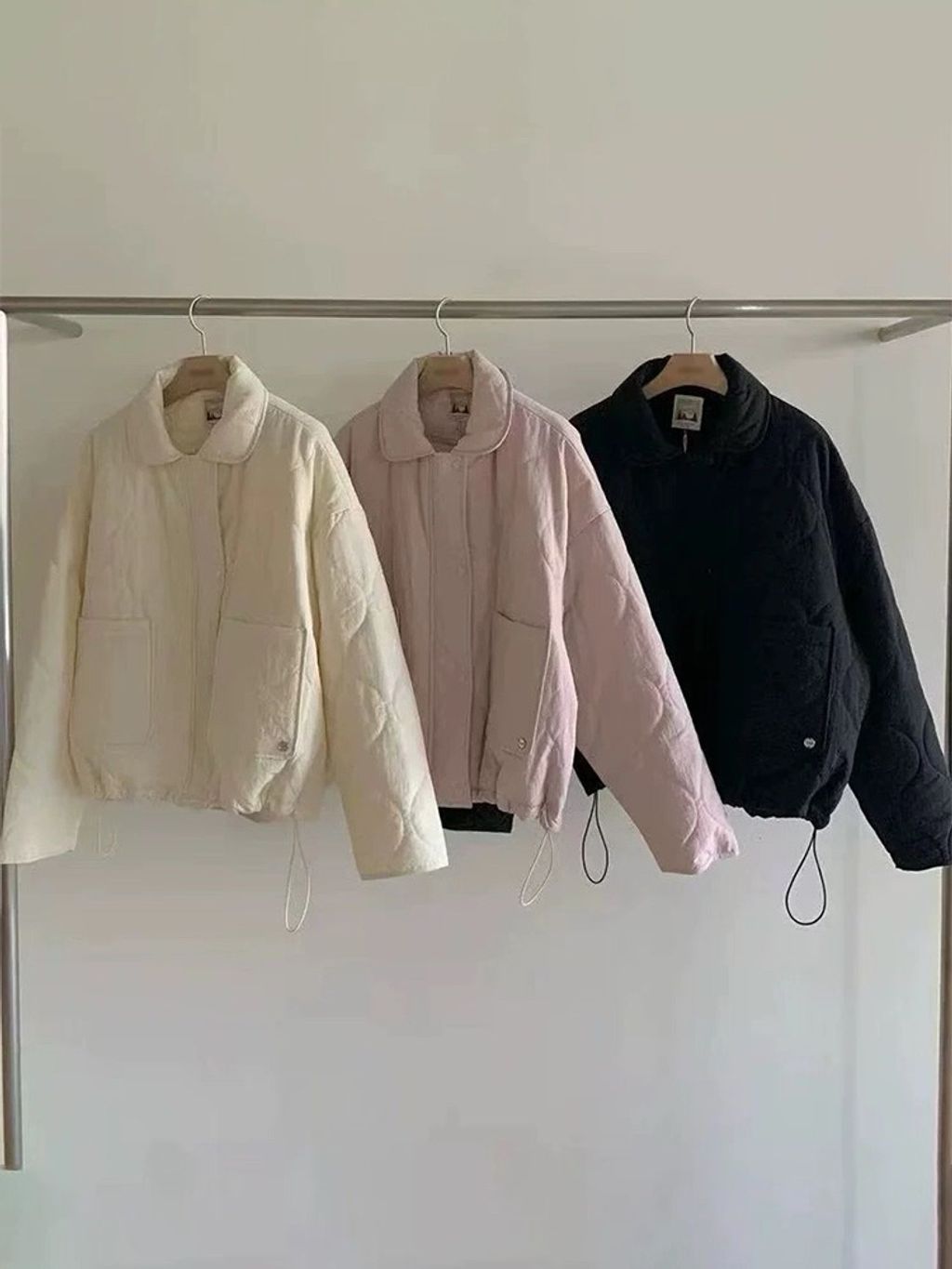 正韓 韓系可愛女孩壓紋質感鋪棉外套*黑奶油粉*【S1216-236】