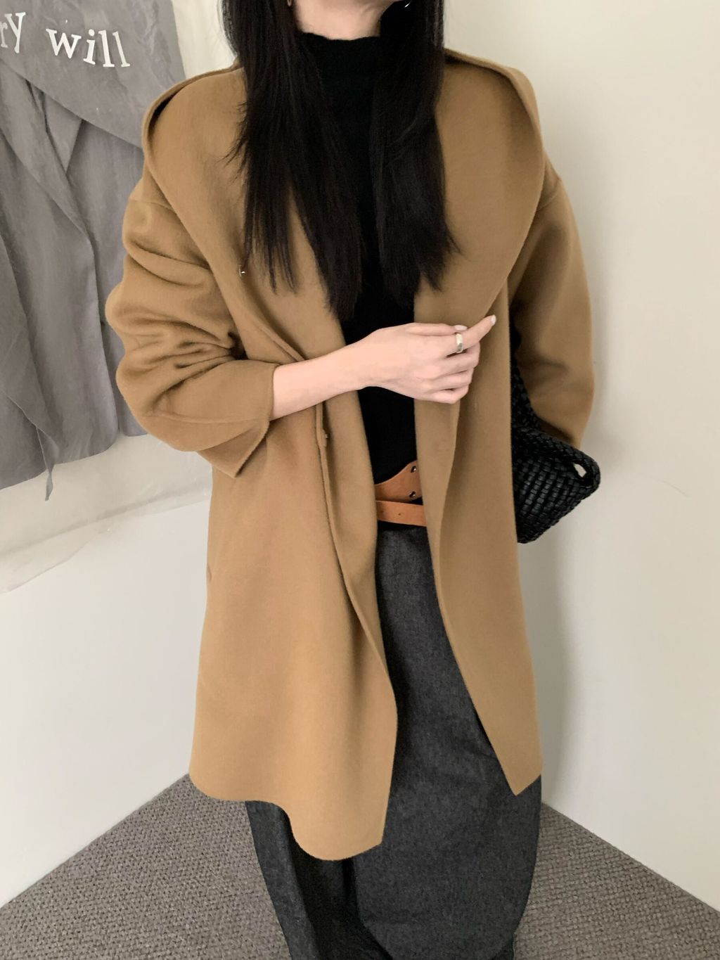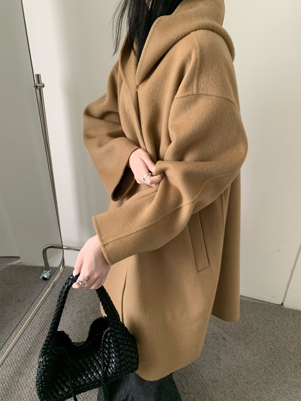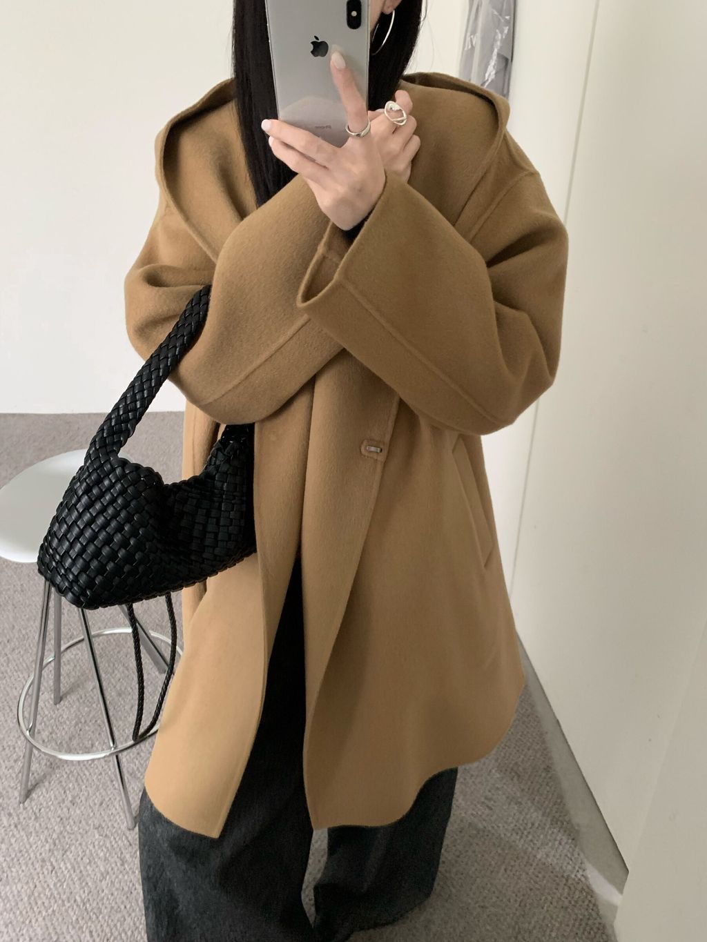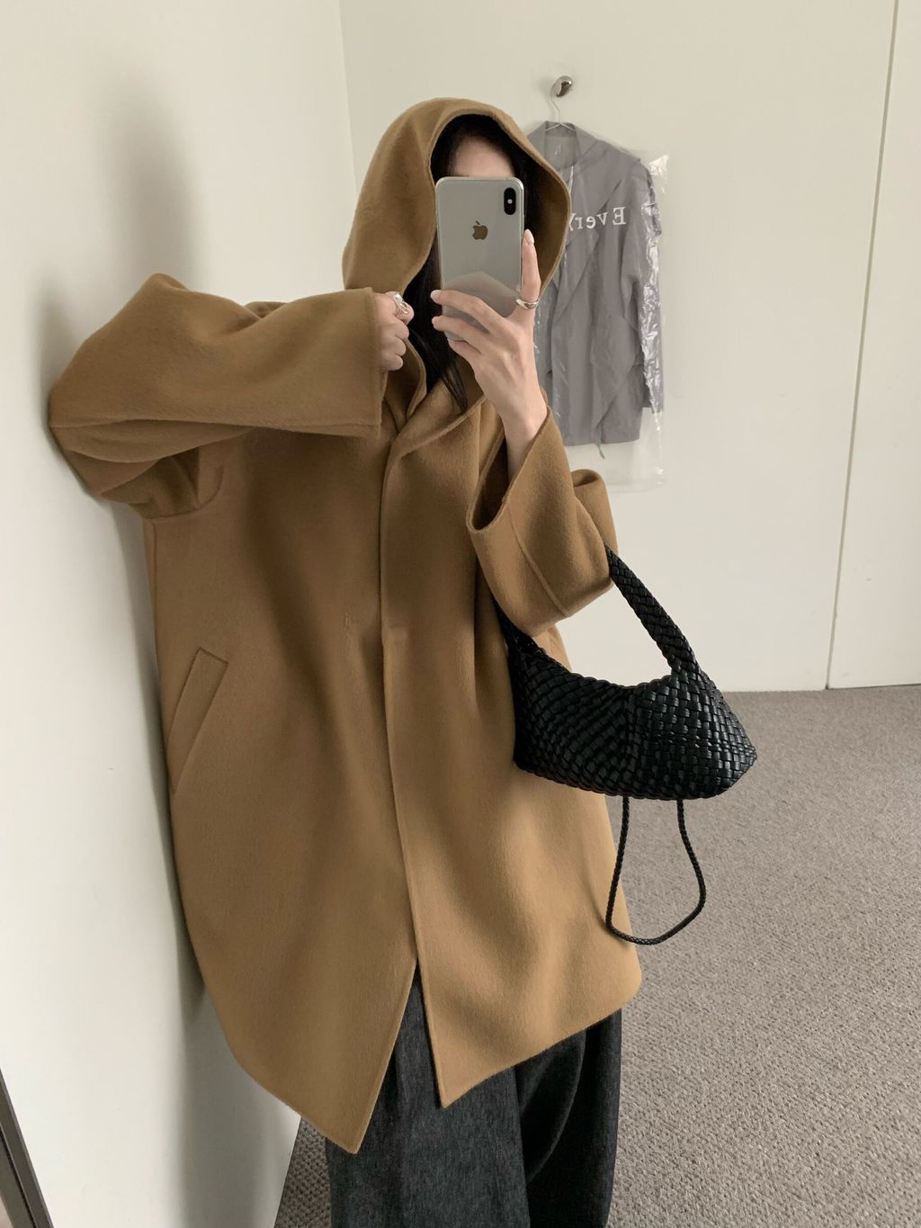 正韓 復古氣質連帽斗篷設計100%羊毛大衣外套*黑駝*【S0125-82】