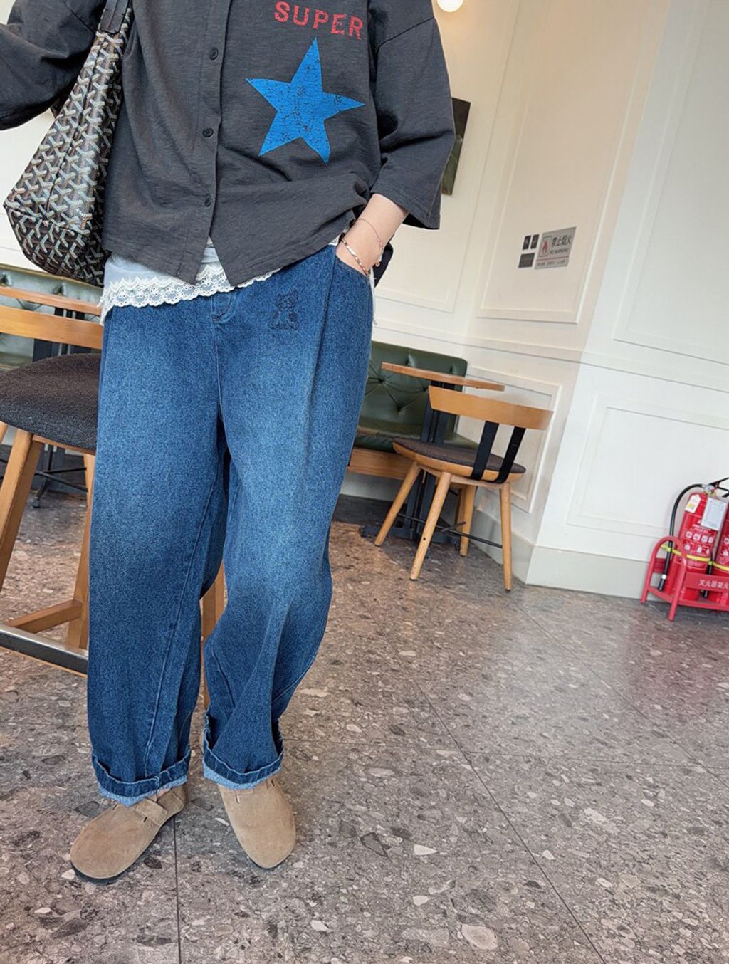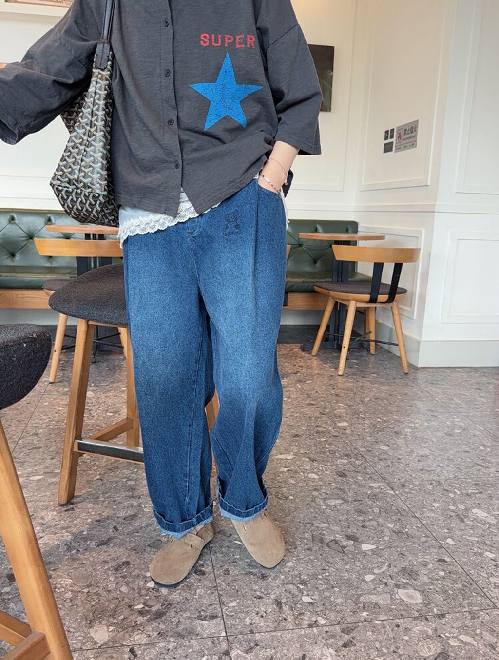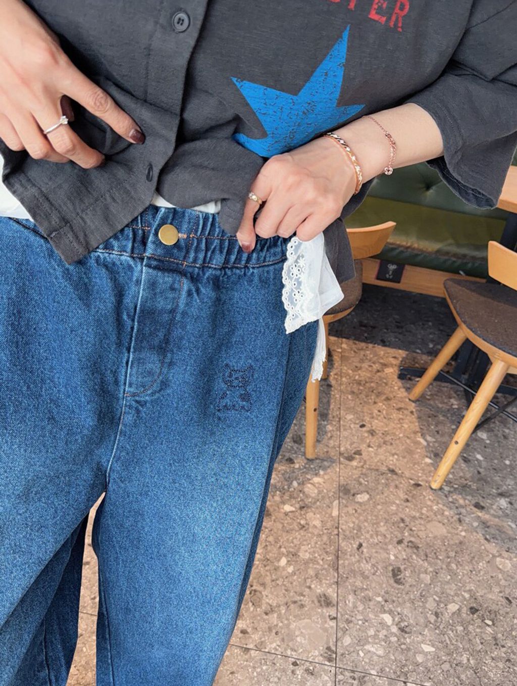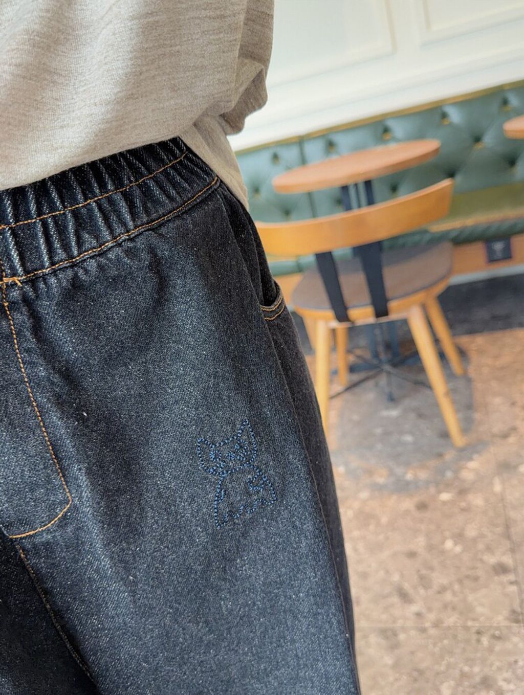 韓 可愛刺繡小貓咪鬆緊腰牛仔長褲*黑藍*【S0412-55】