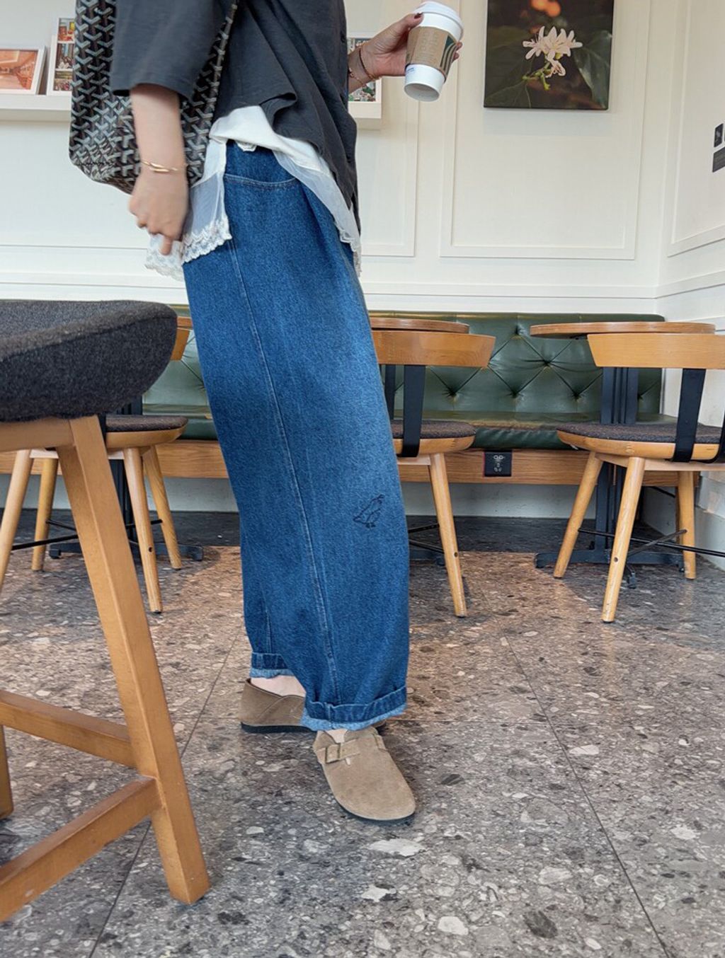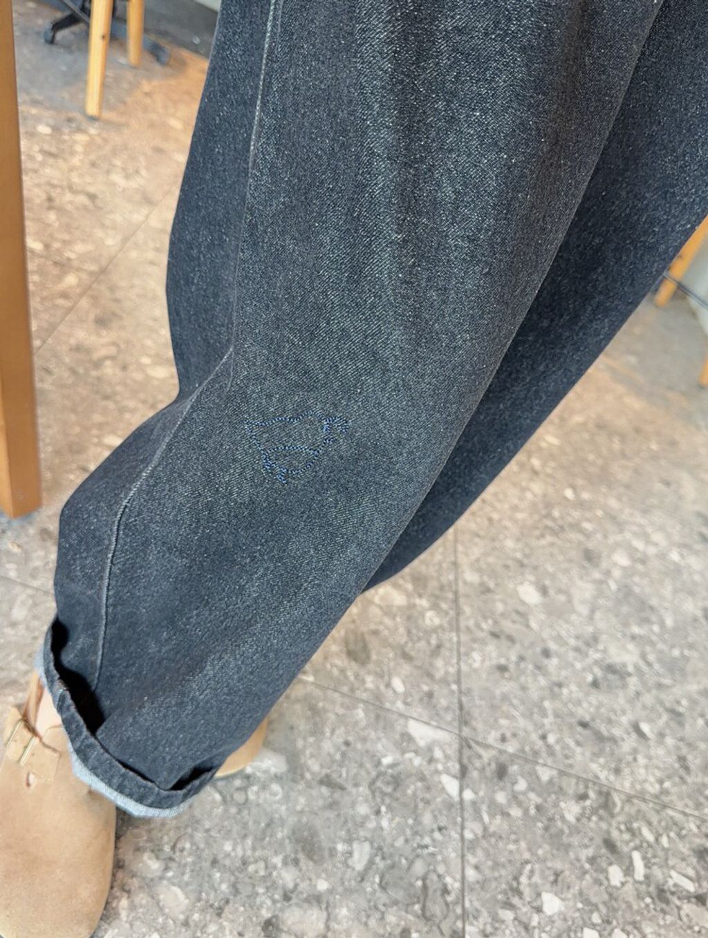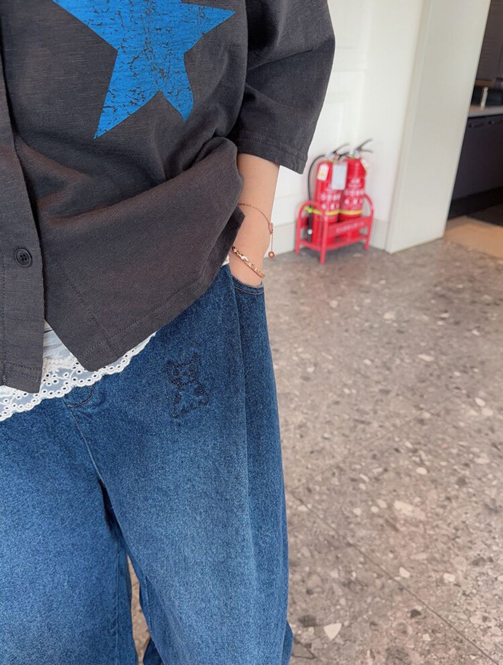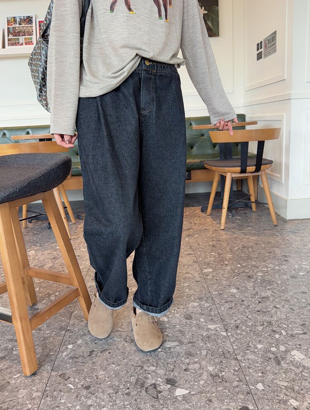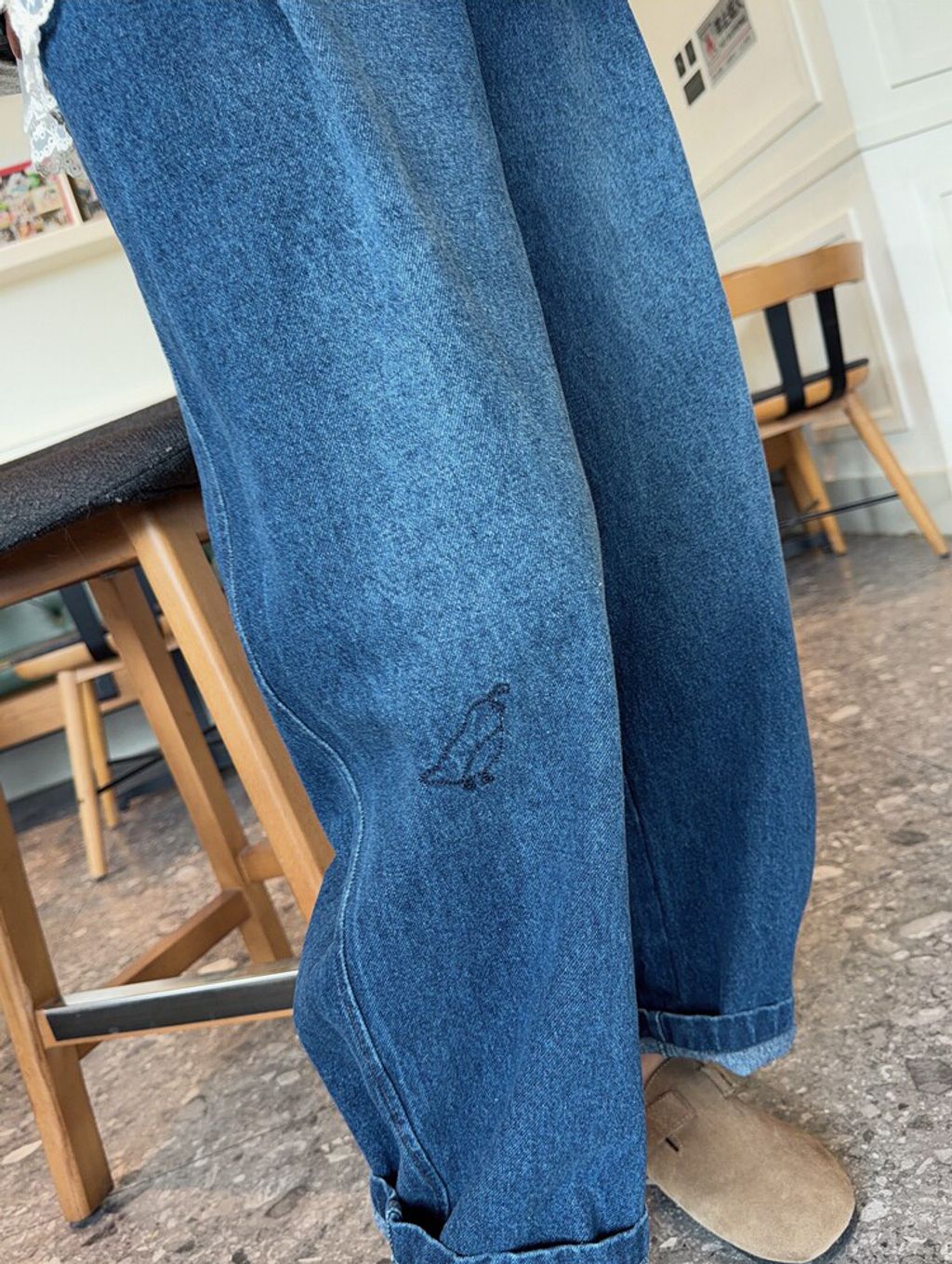 韓 可愛刺繡小貓咪鬆緊腰牛仔長褲*黑藍*【S0412-55】