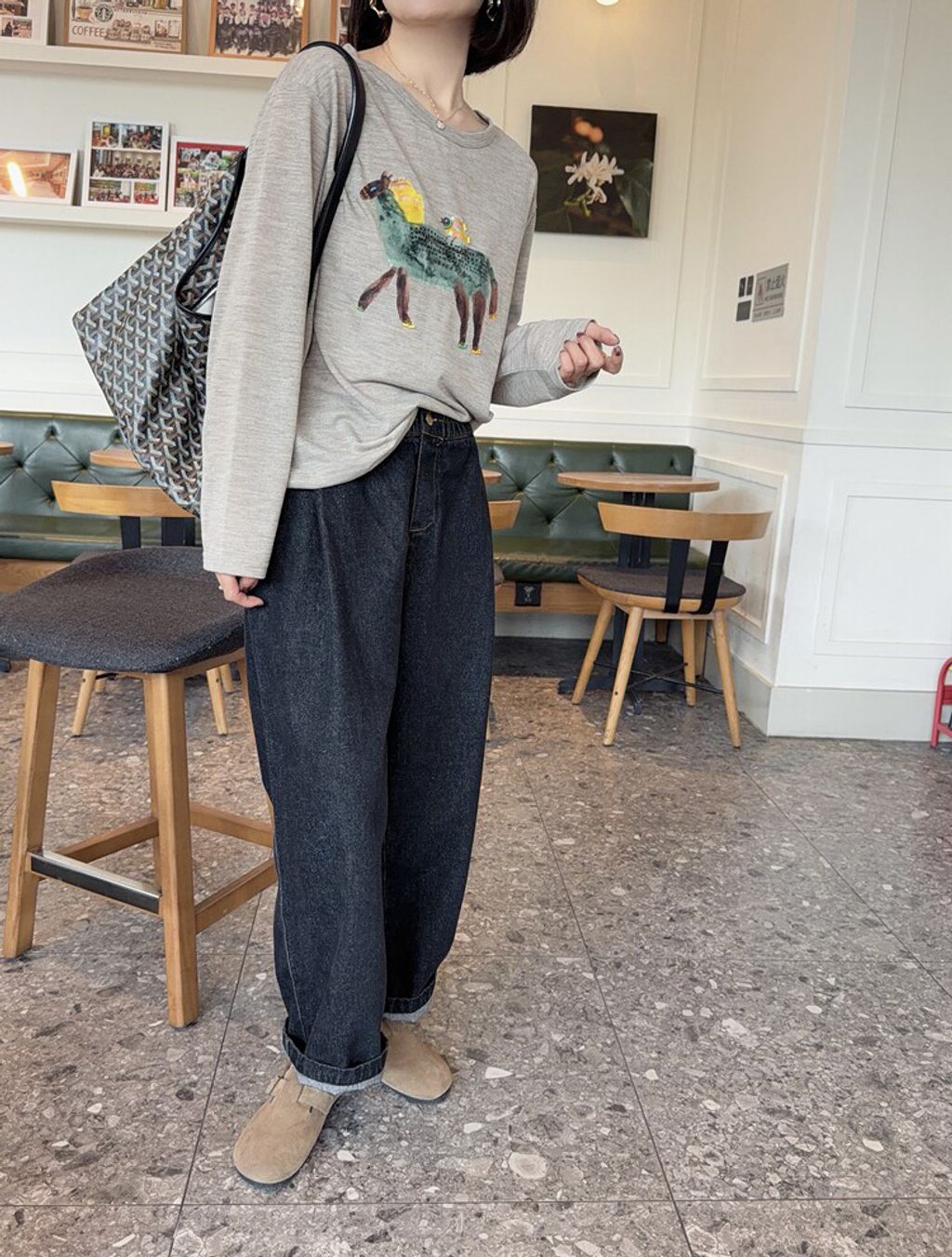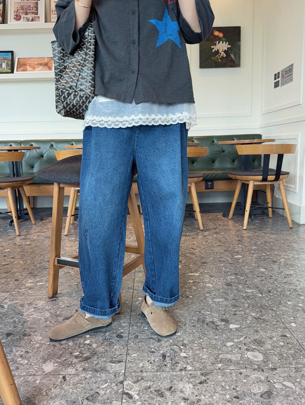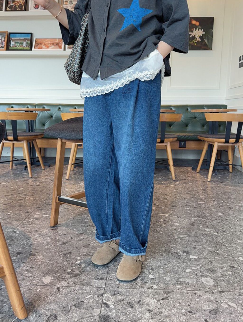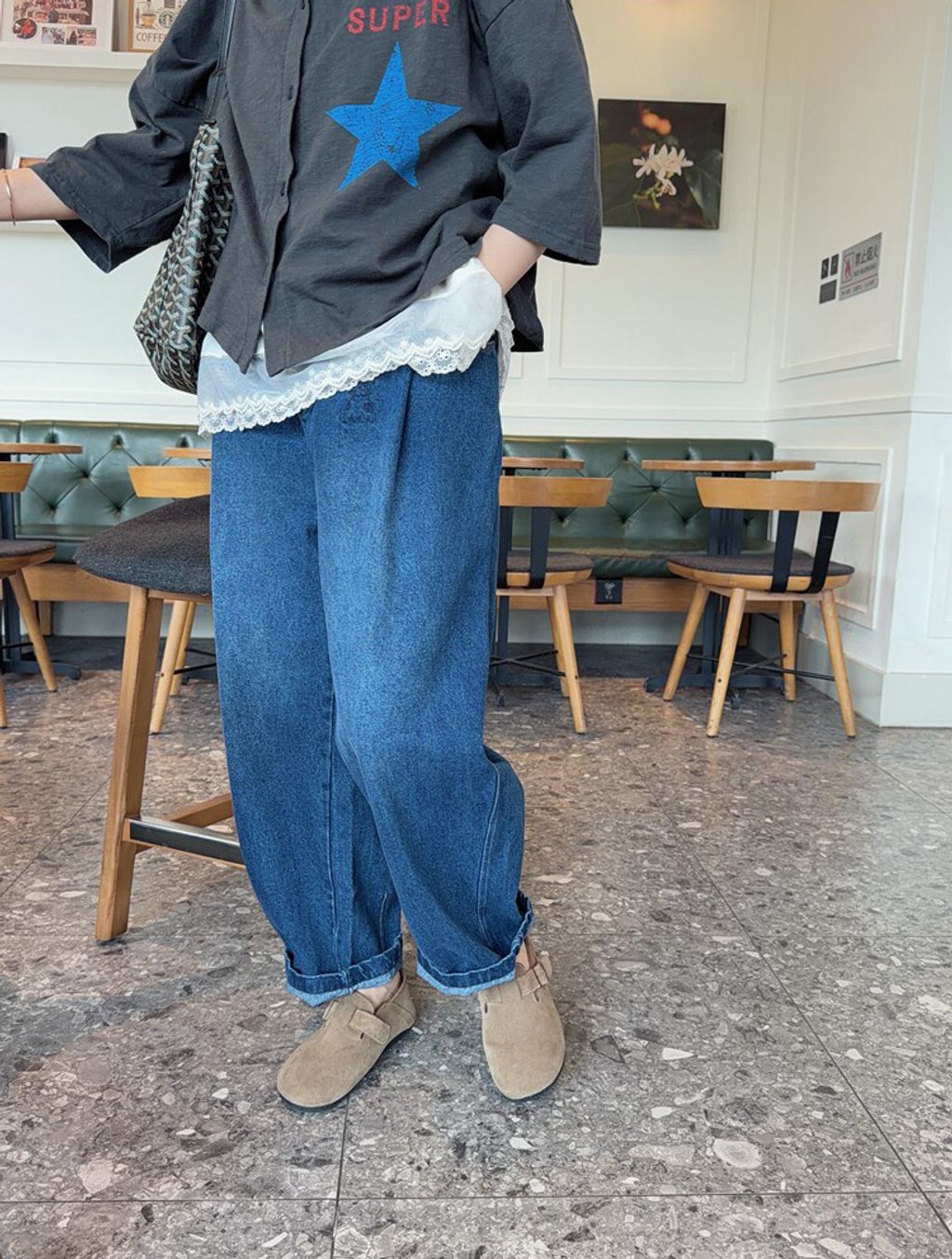 韓 可愛刺繡小貓咪鬆緊腰牛仔長褲*黑藍*【S0412-55】