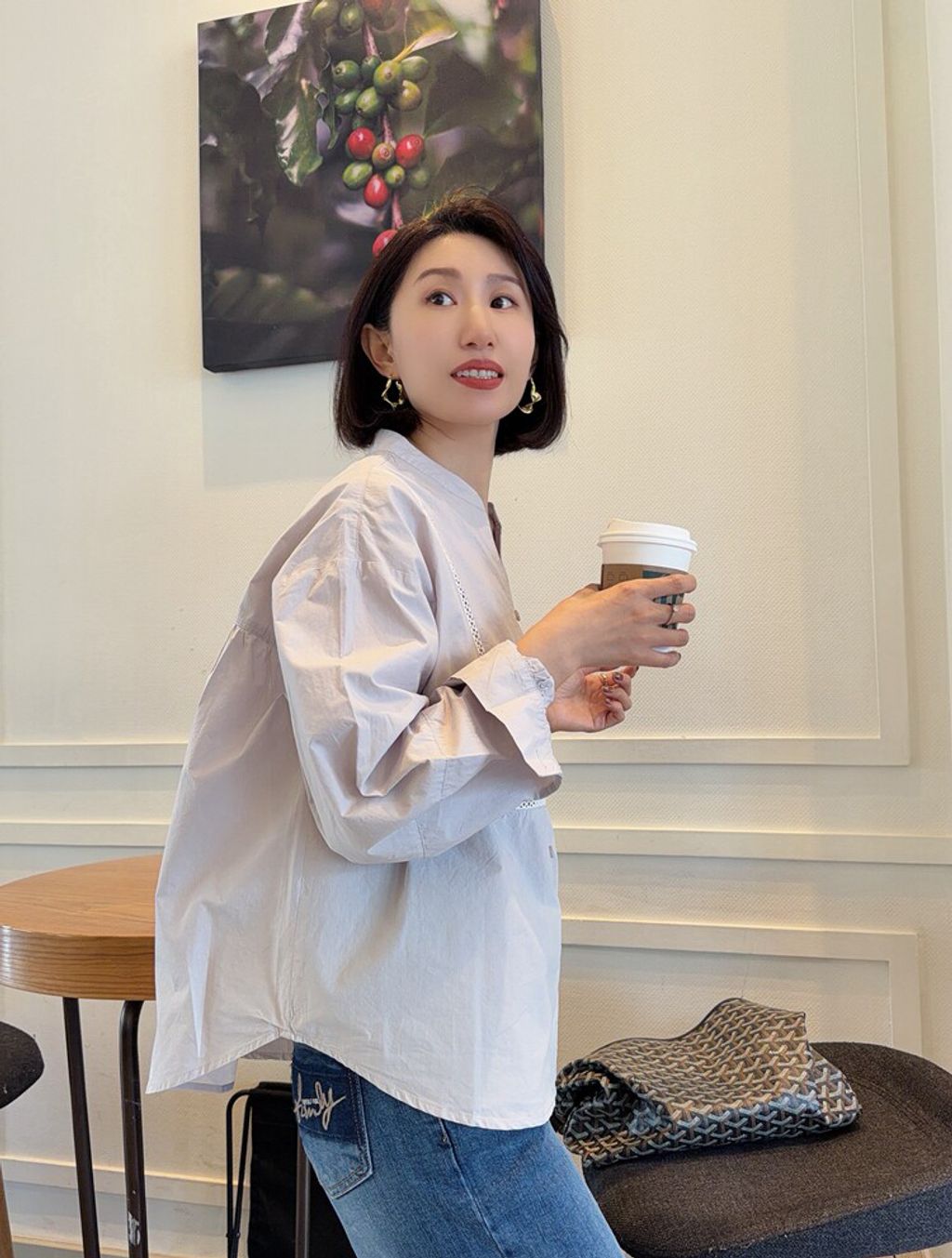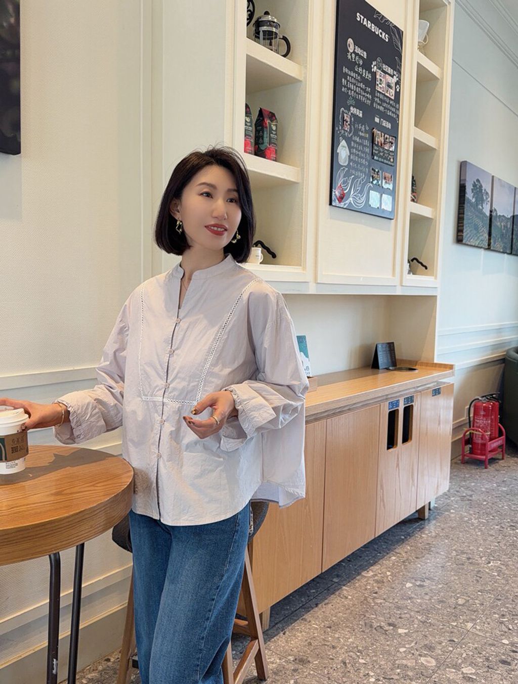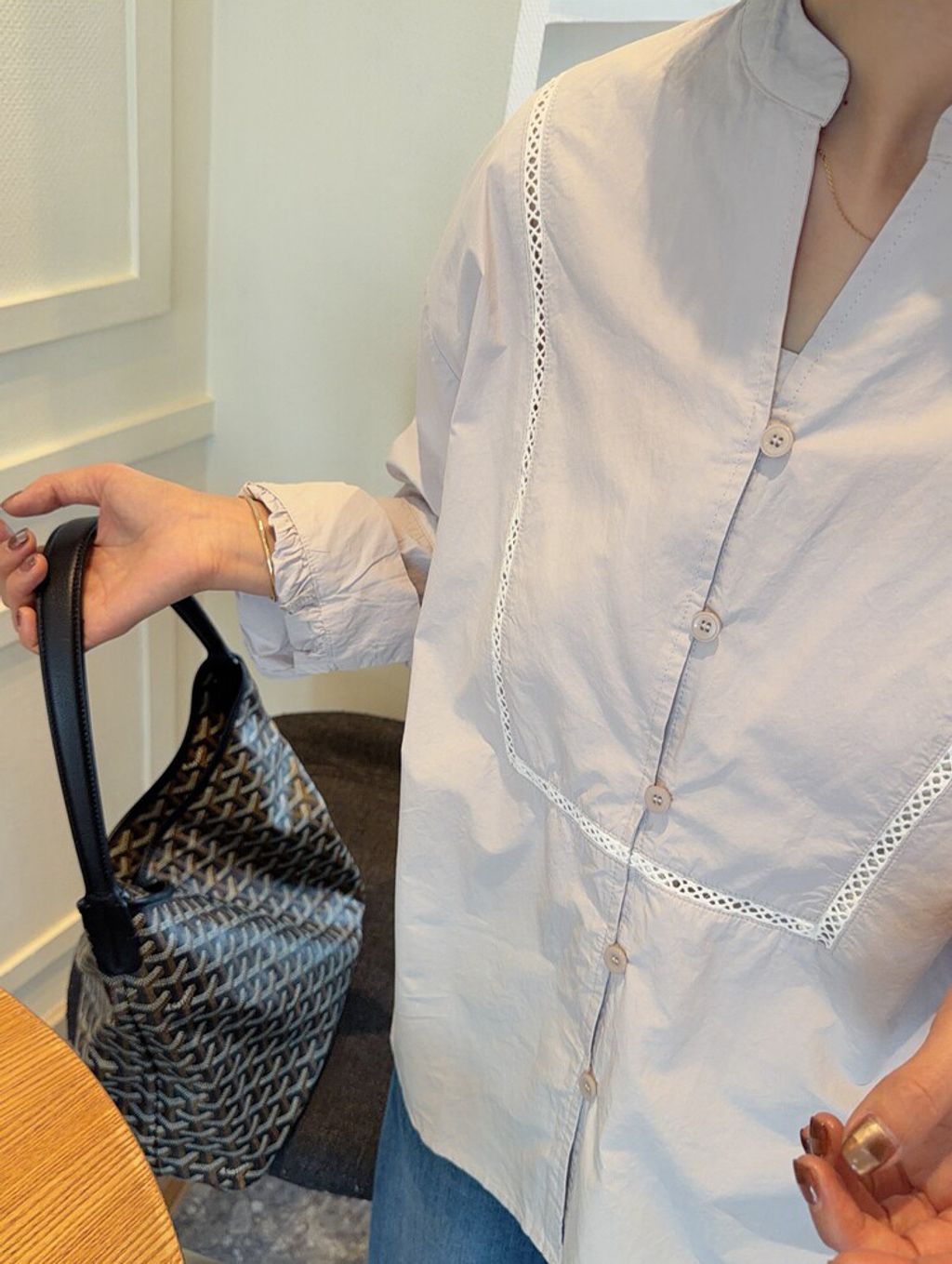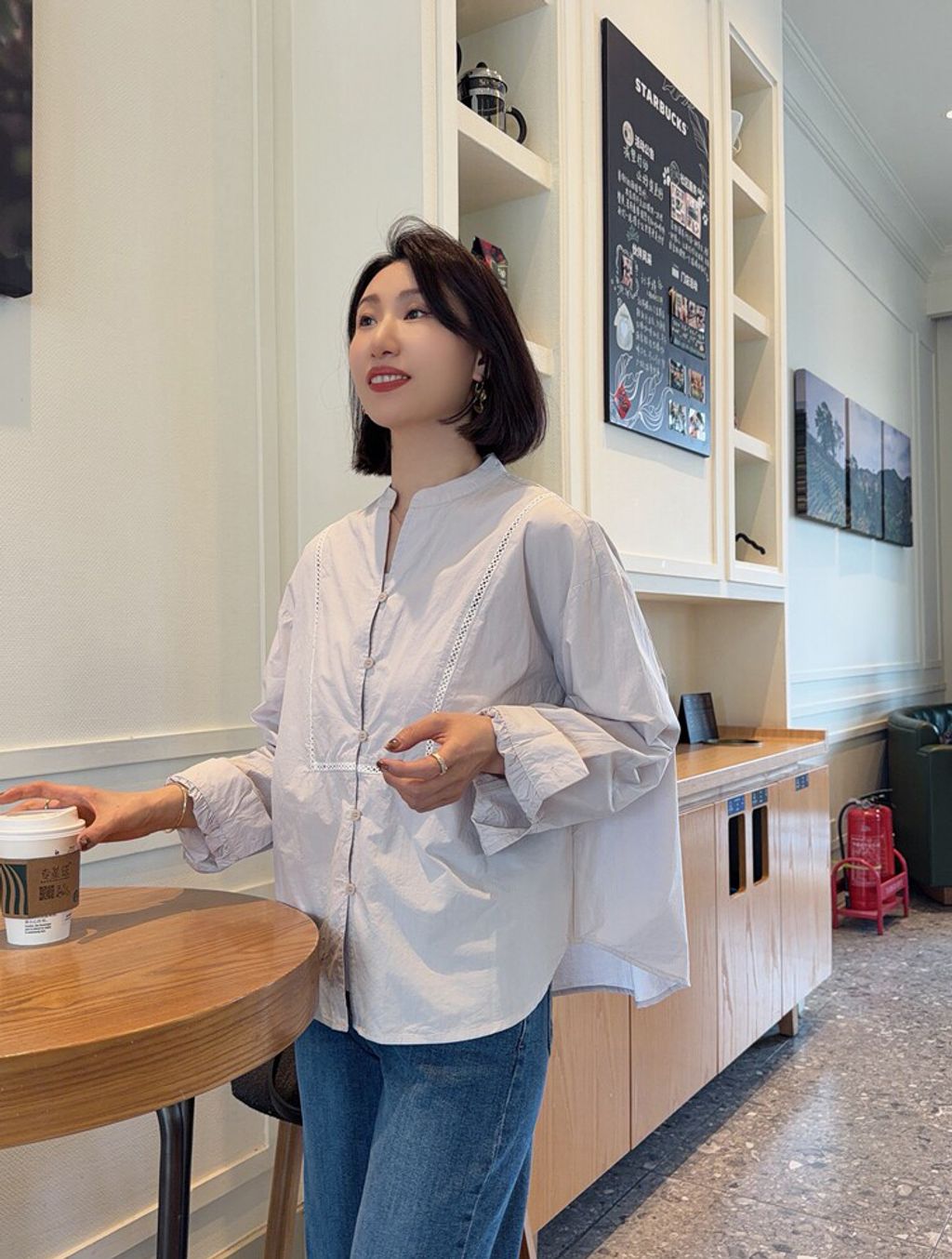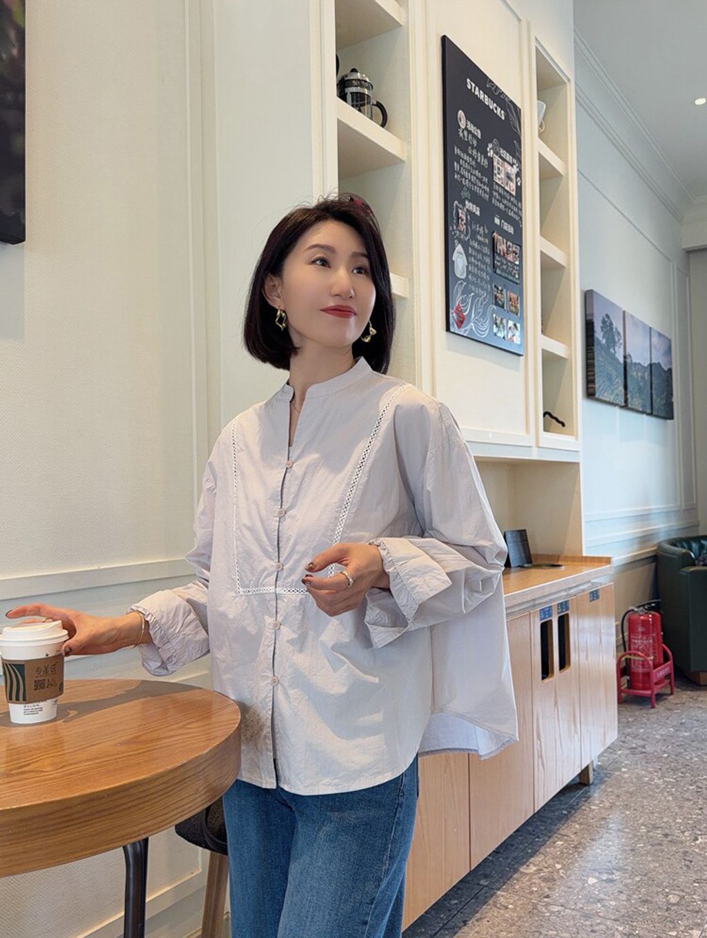 韓 唯美鏤空蕾絲拼接寬鬆感襯衫*淺灰*【S0412-59】