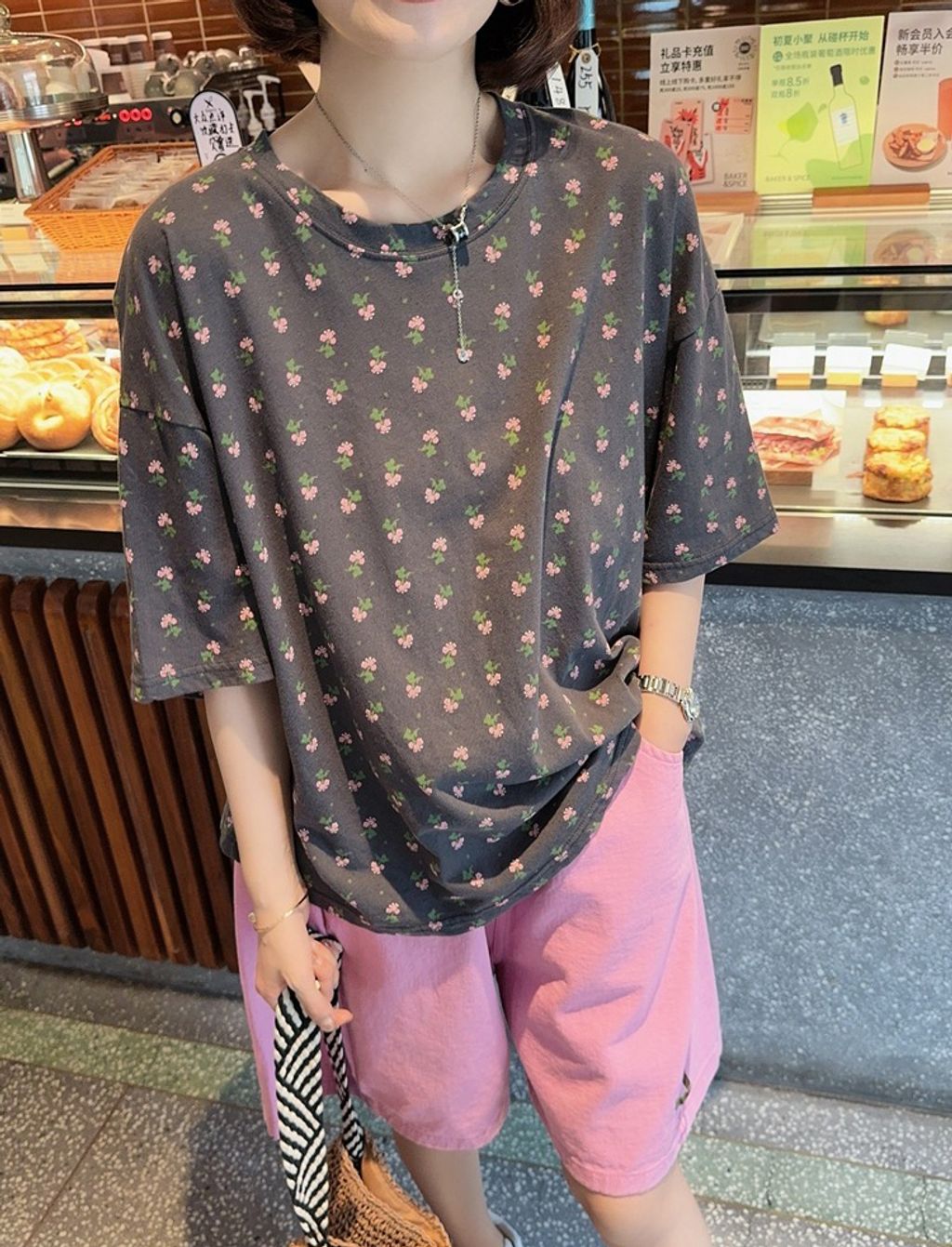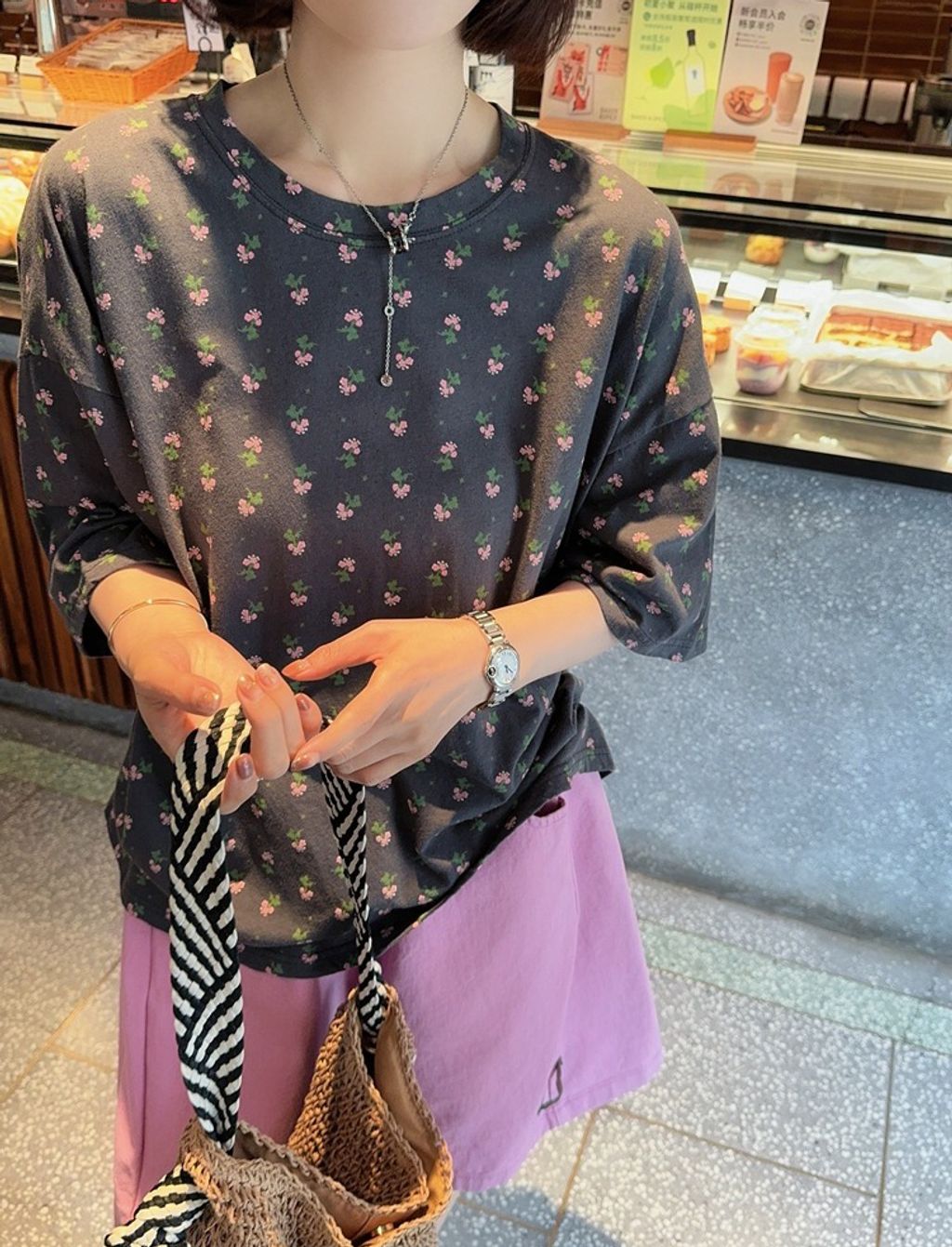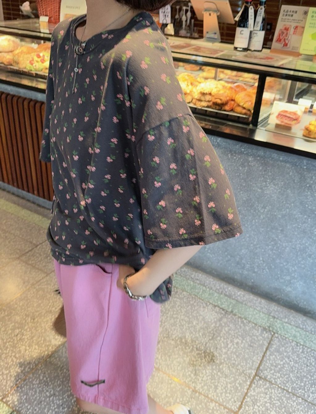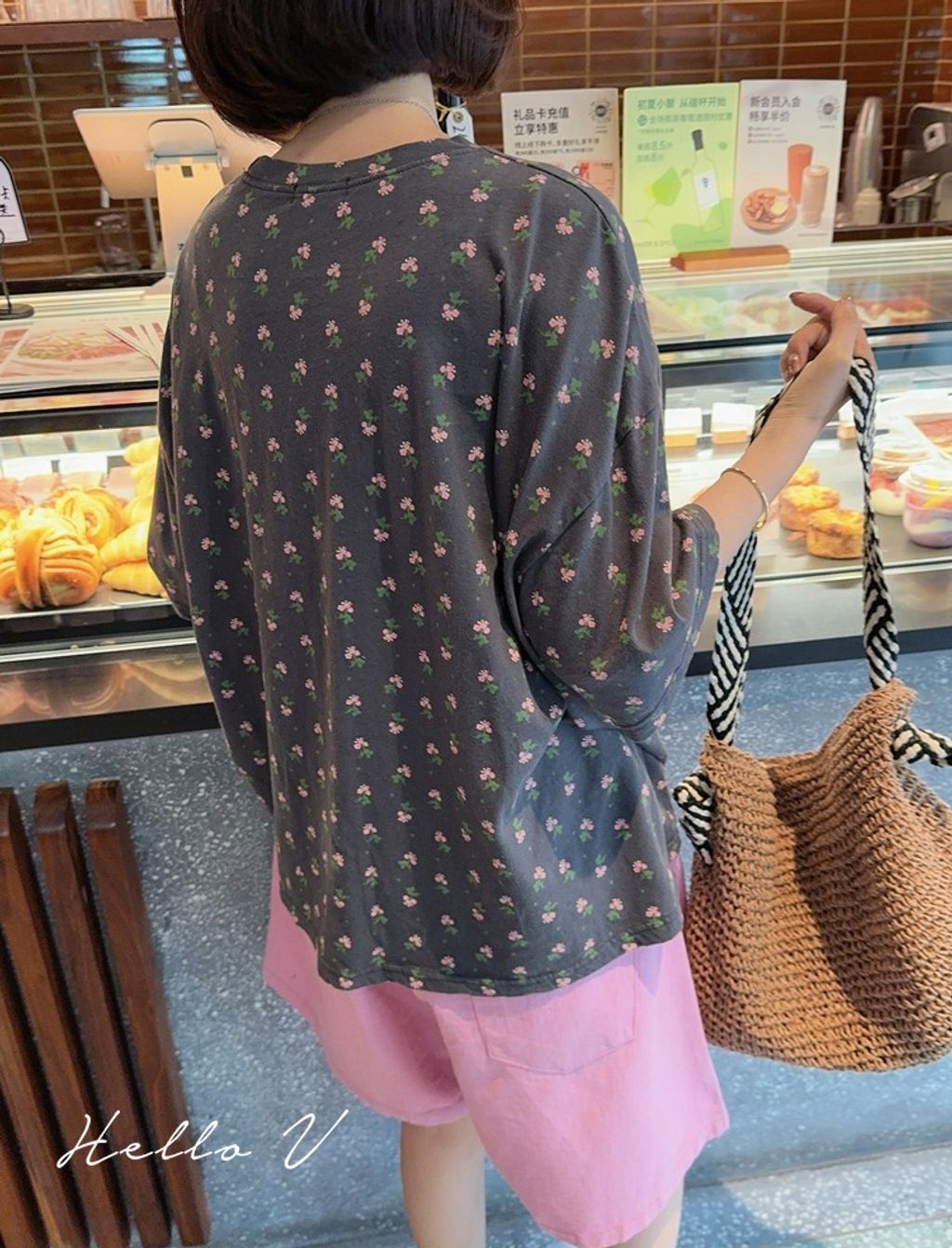 正韓 復古甜美小花朵寬鬆質感短T*深灰*【E0710-89】