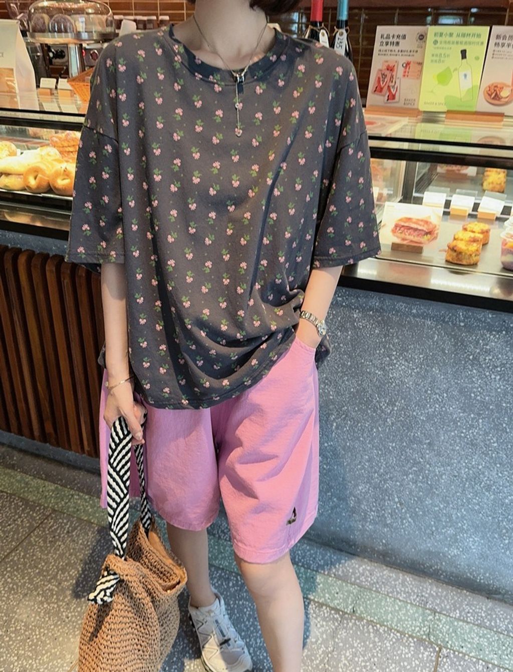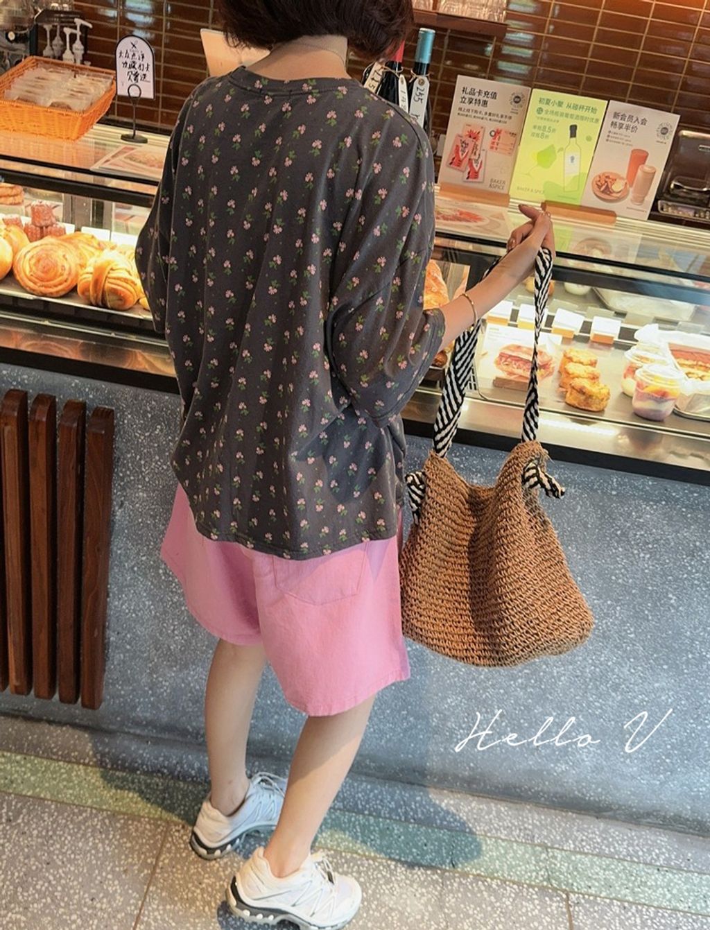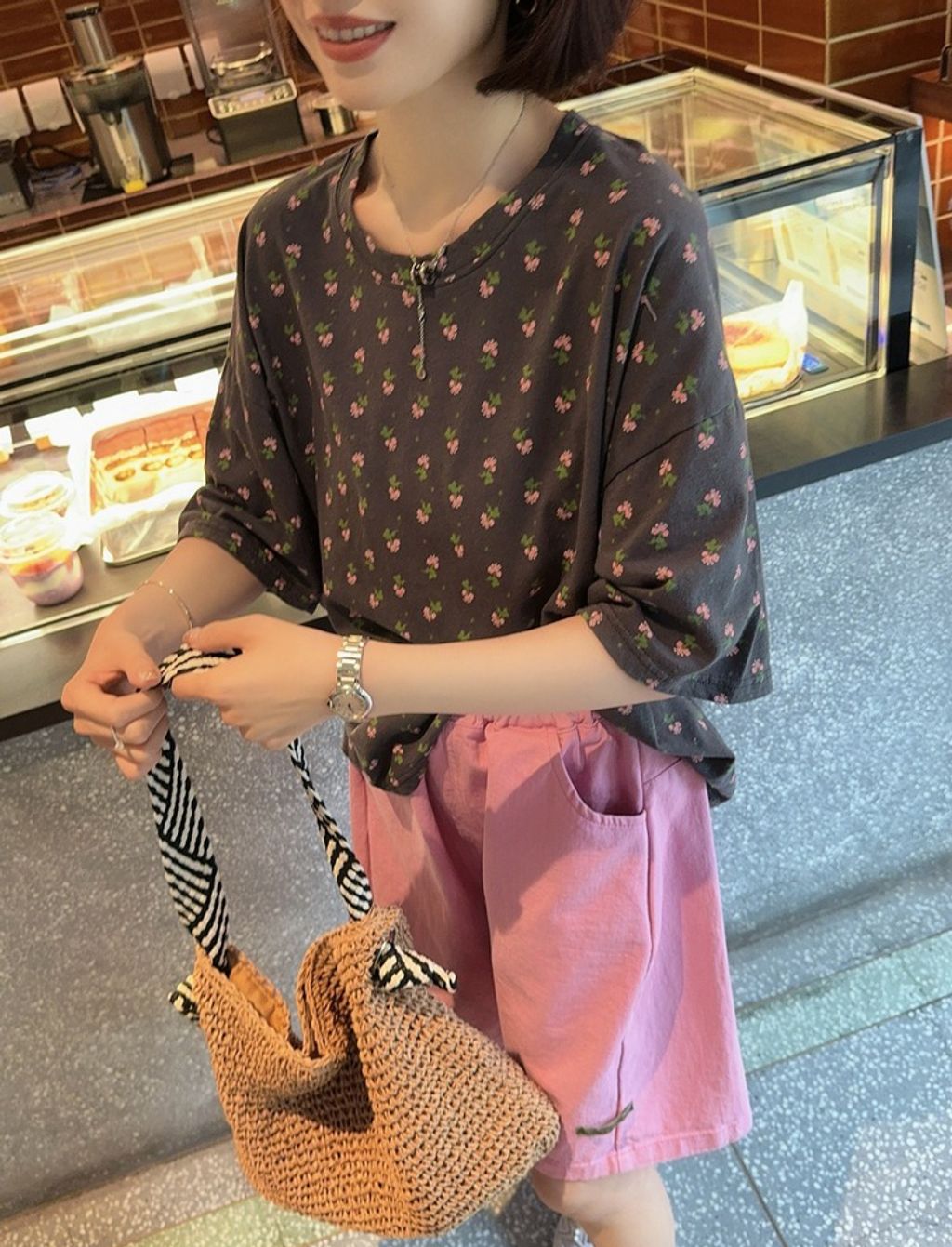 正韓 復古甜美小花朵寬鬆質感短T*深灰*【E0710-89】